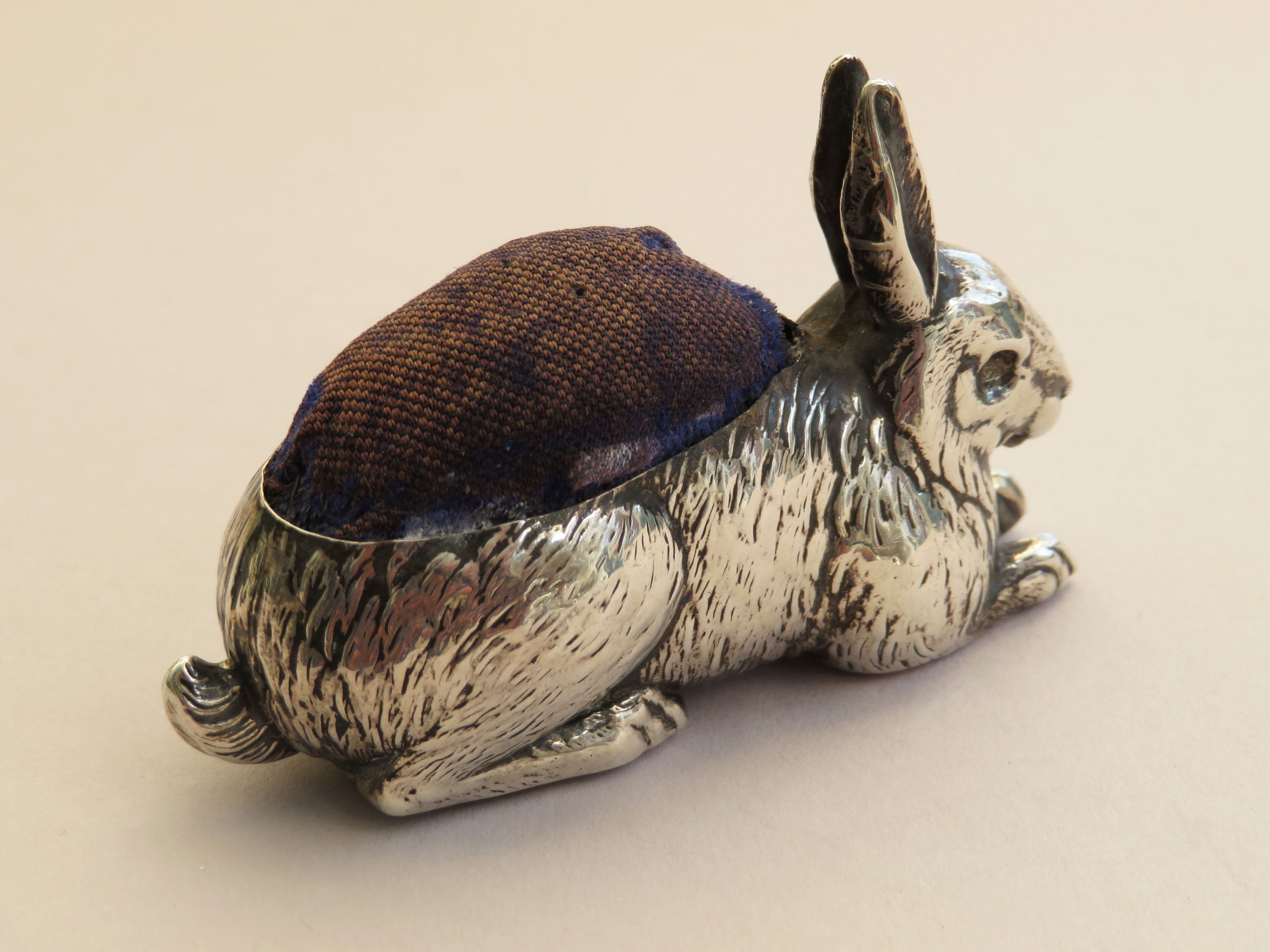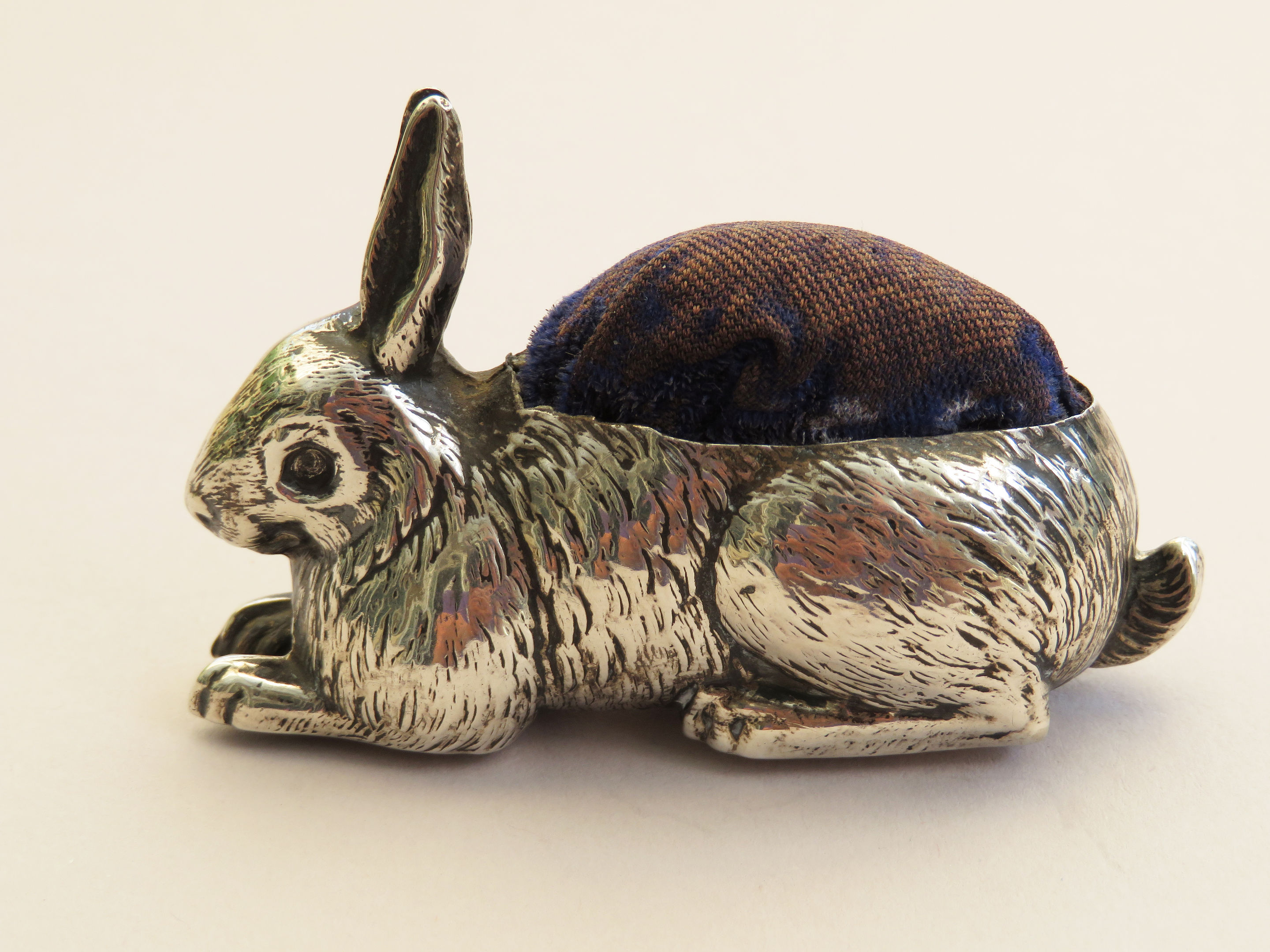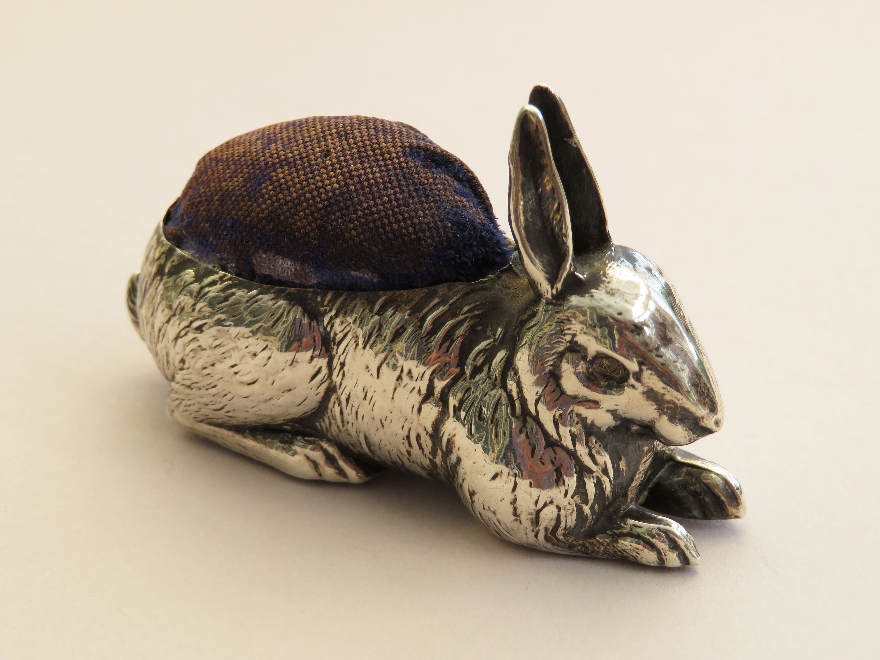 A good George V silver Pin Cushion realistically modelled as a crouching rabbit. Complete with original blue velvet cushion.