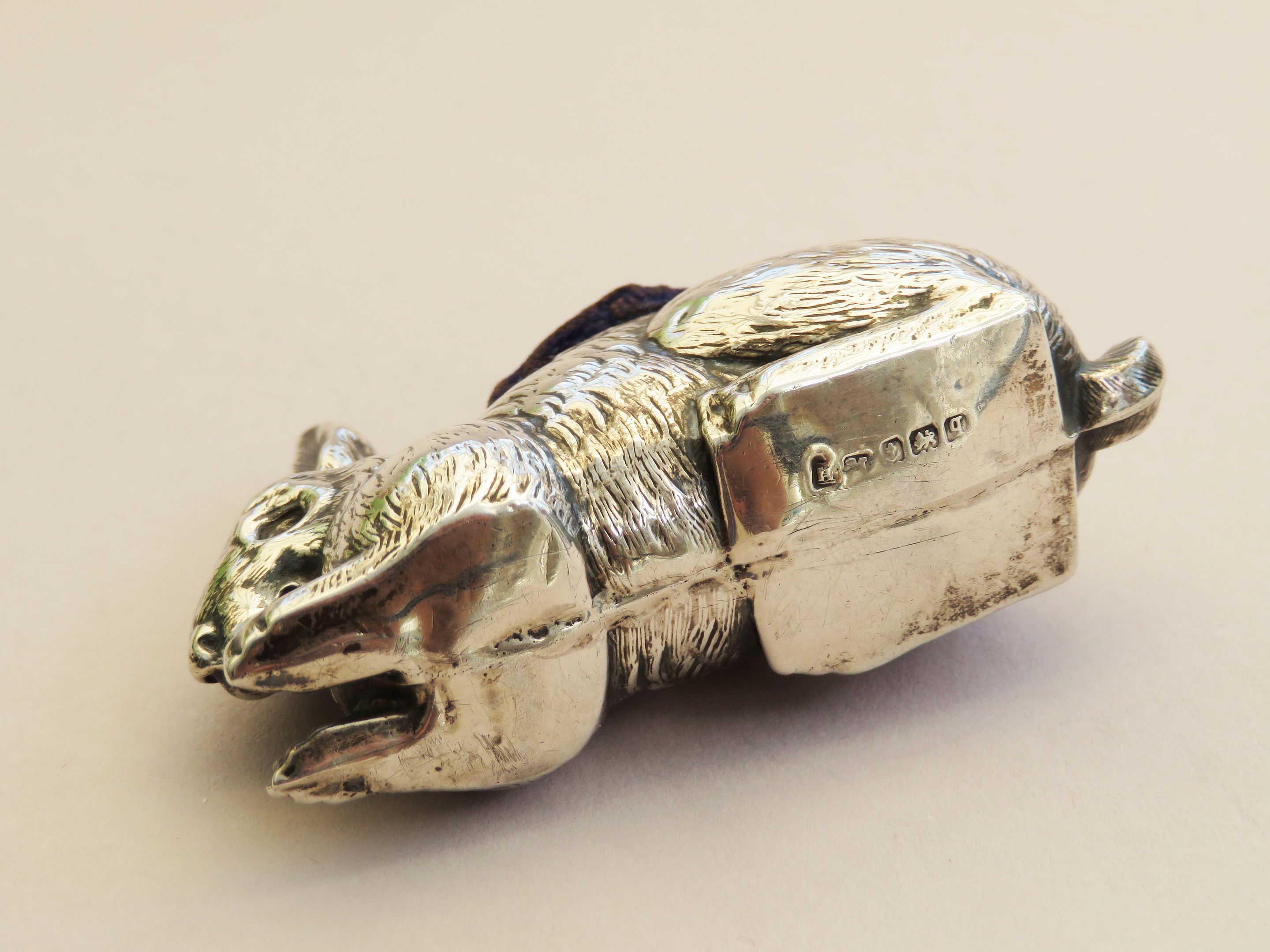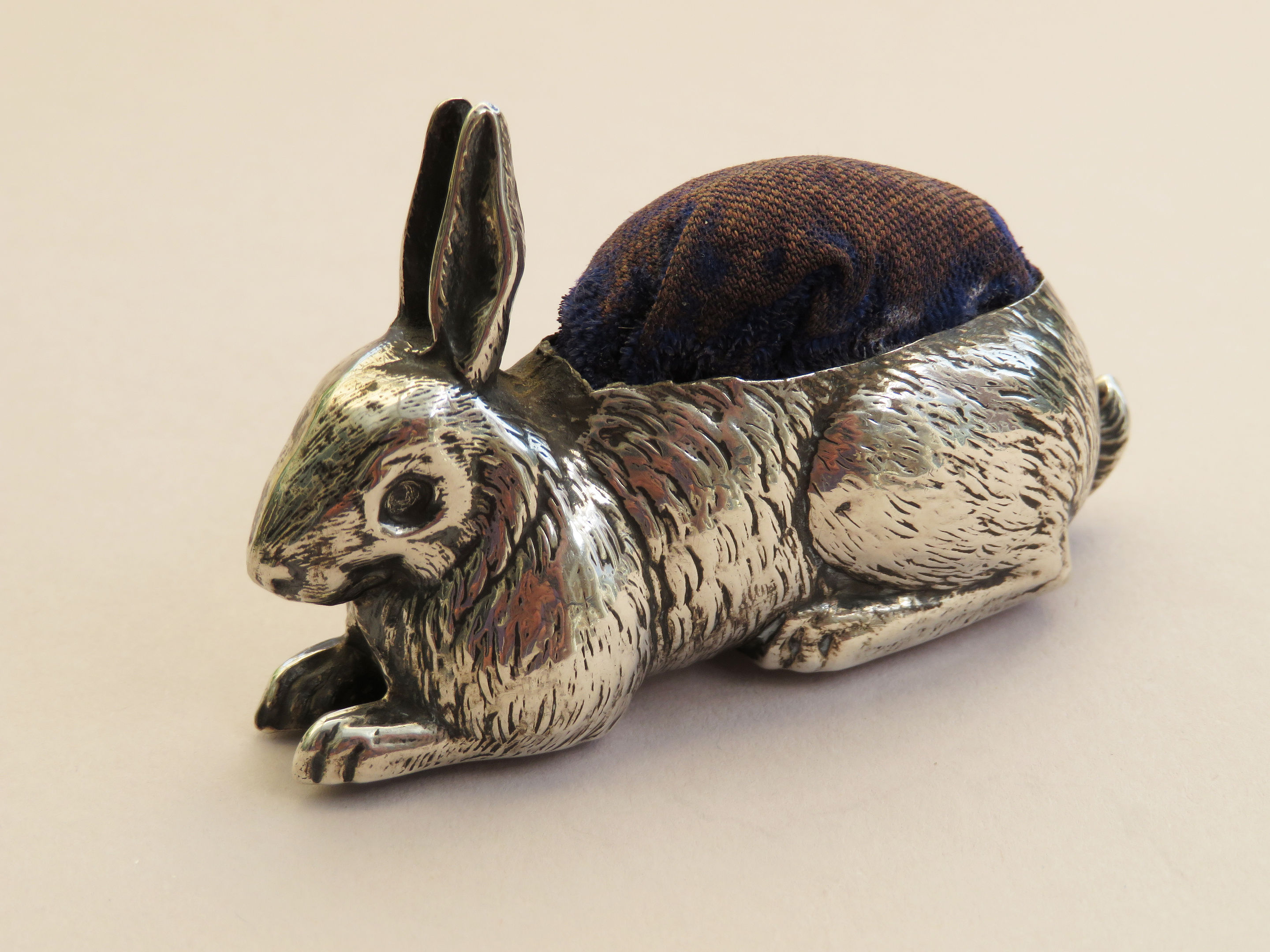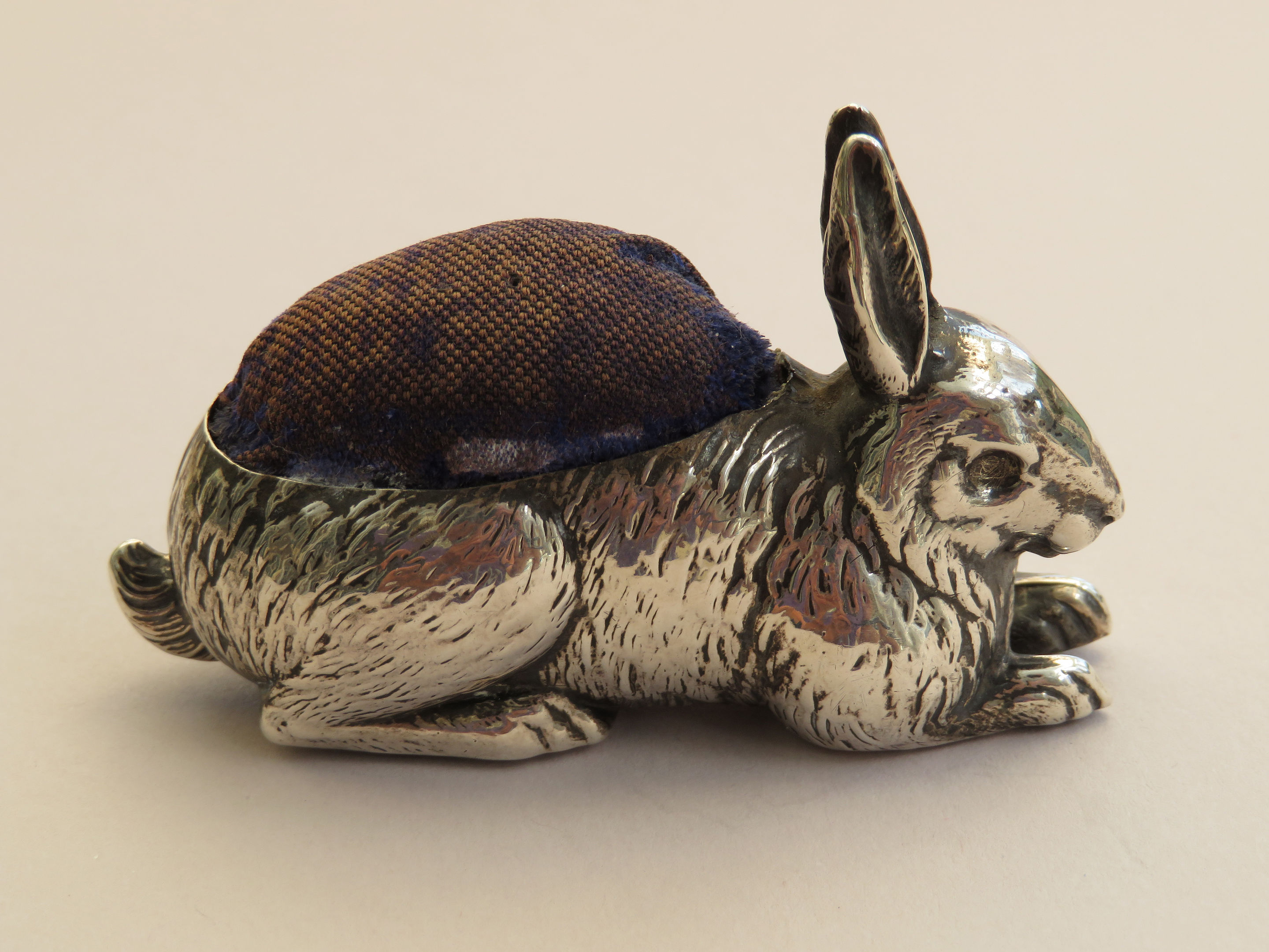 A good George V silver Pin Cushion realistically modelled as a crouching rabbit. Complete with original blue velvet cushion.