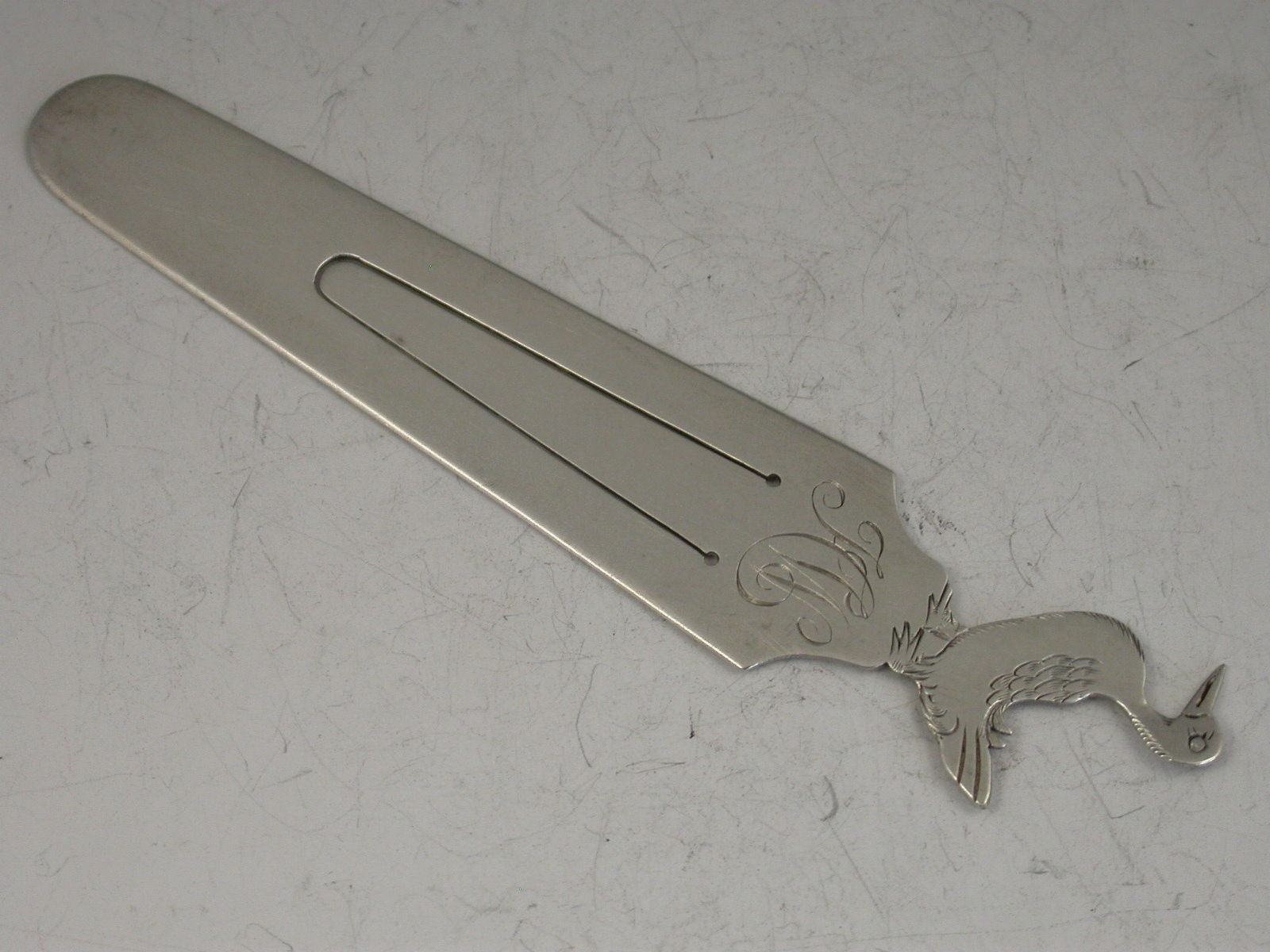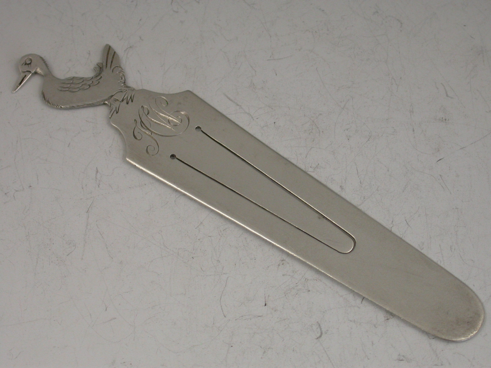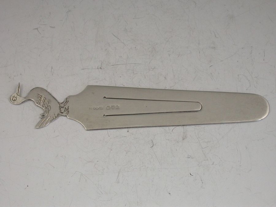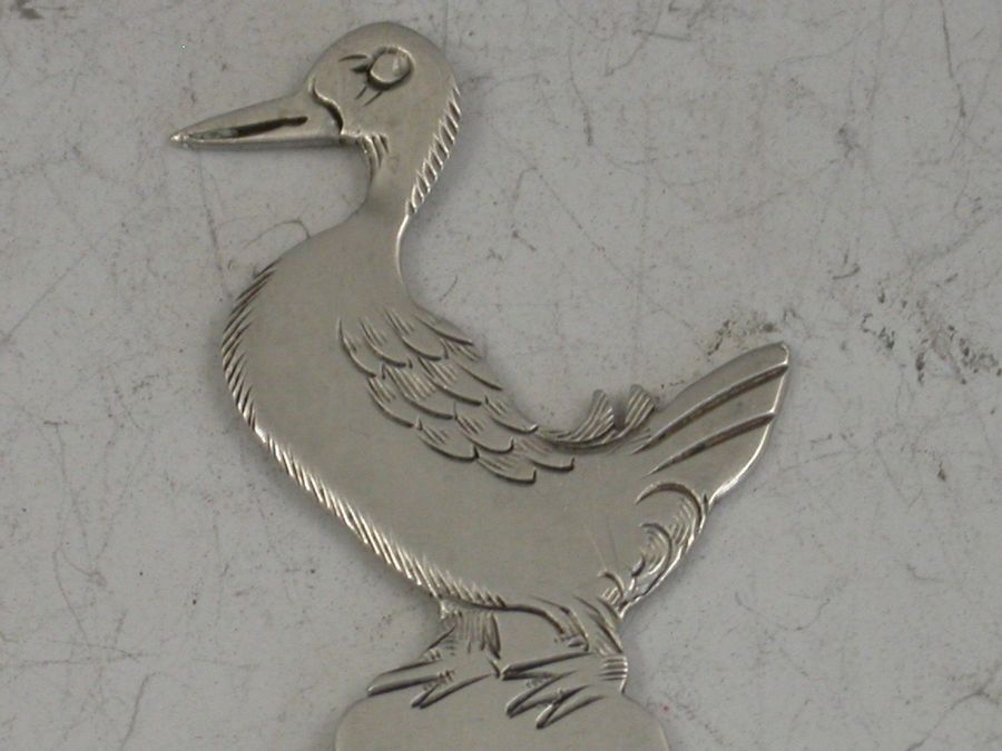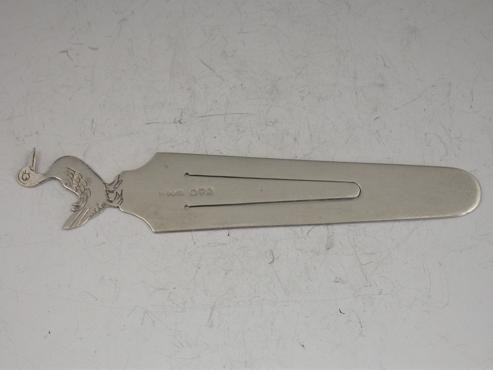 A rare George V novelty silver Bookmark, the plain tapering blade with shoulders and comical duck surmount, in the style of Benjamin Rabier. The blade engraved with script initials HW.