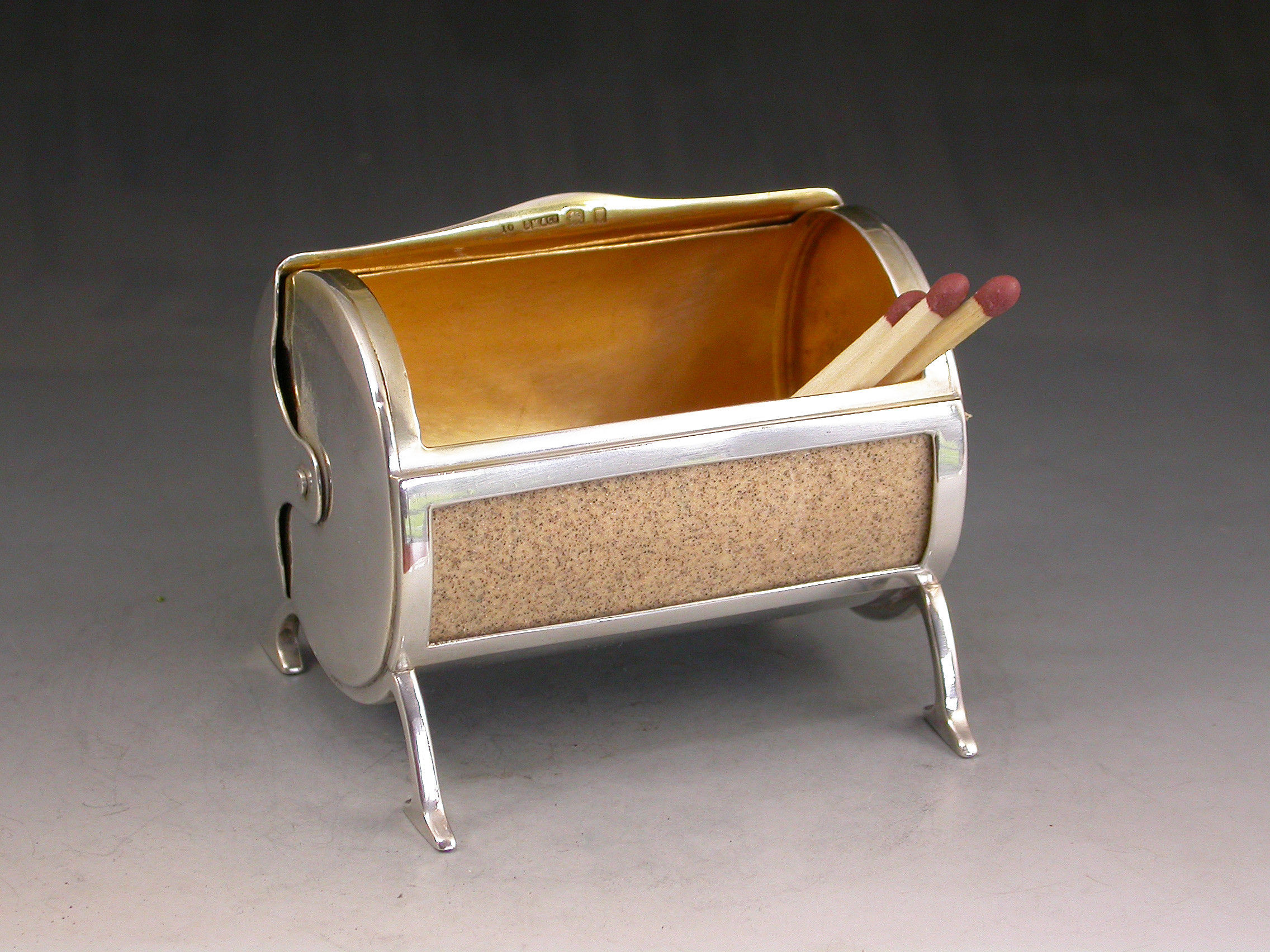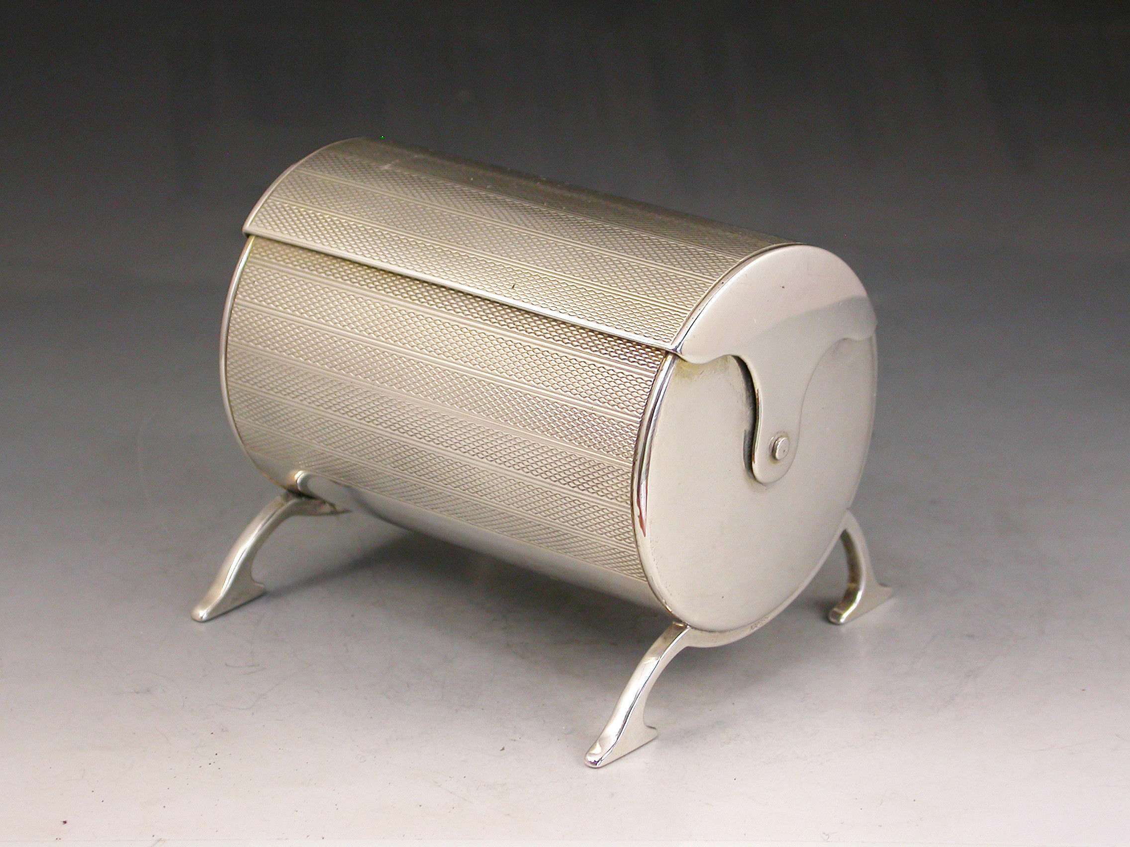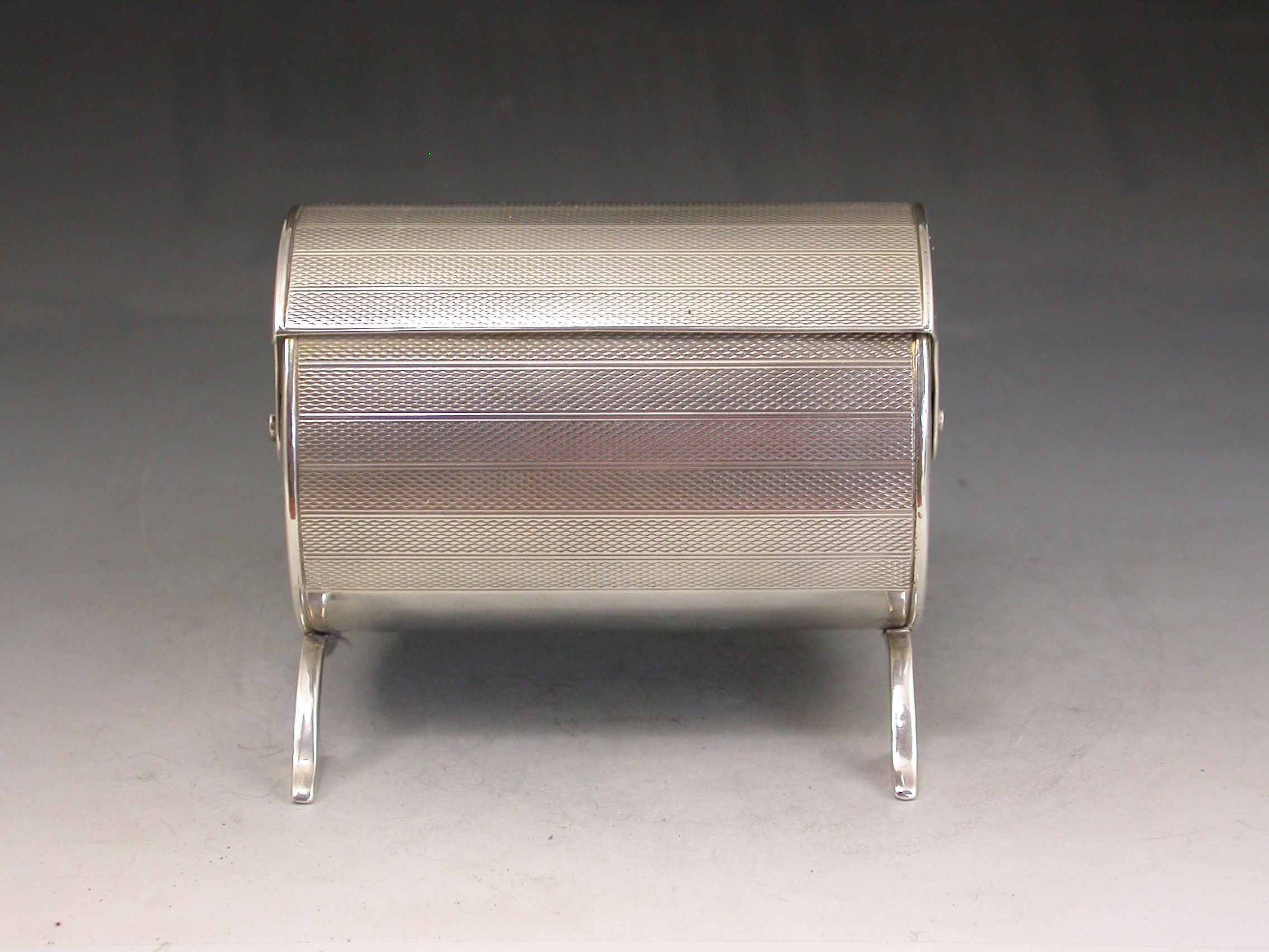 A fine quality George V silver revolving cylindrical Table Vesta Box, of a Patented design, standing on four spread feet, the pivoted cover revolving back and forth and forming an almost gasket like seal. A silver frame to the front holds the replaceable sandpaper striker. Art Deco style engine turned decoration to the lid and rear and a rich silver gilt interior.
