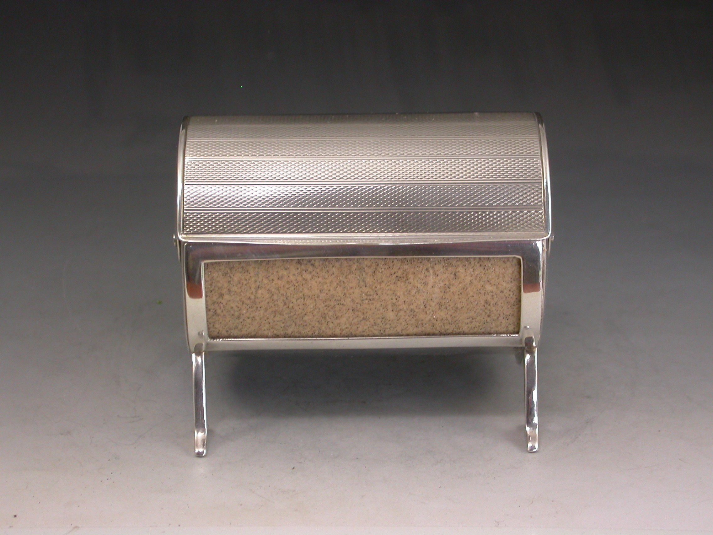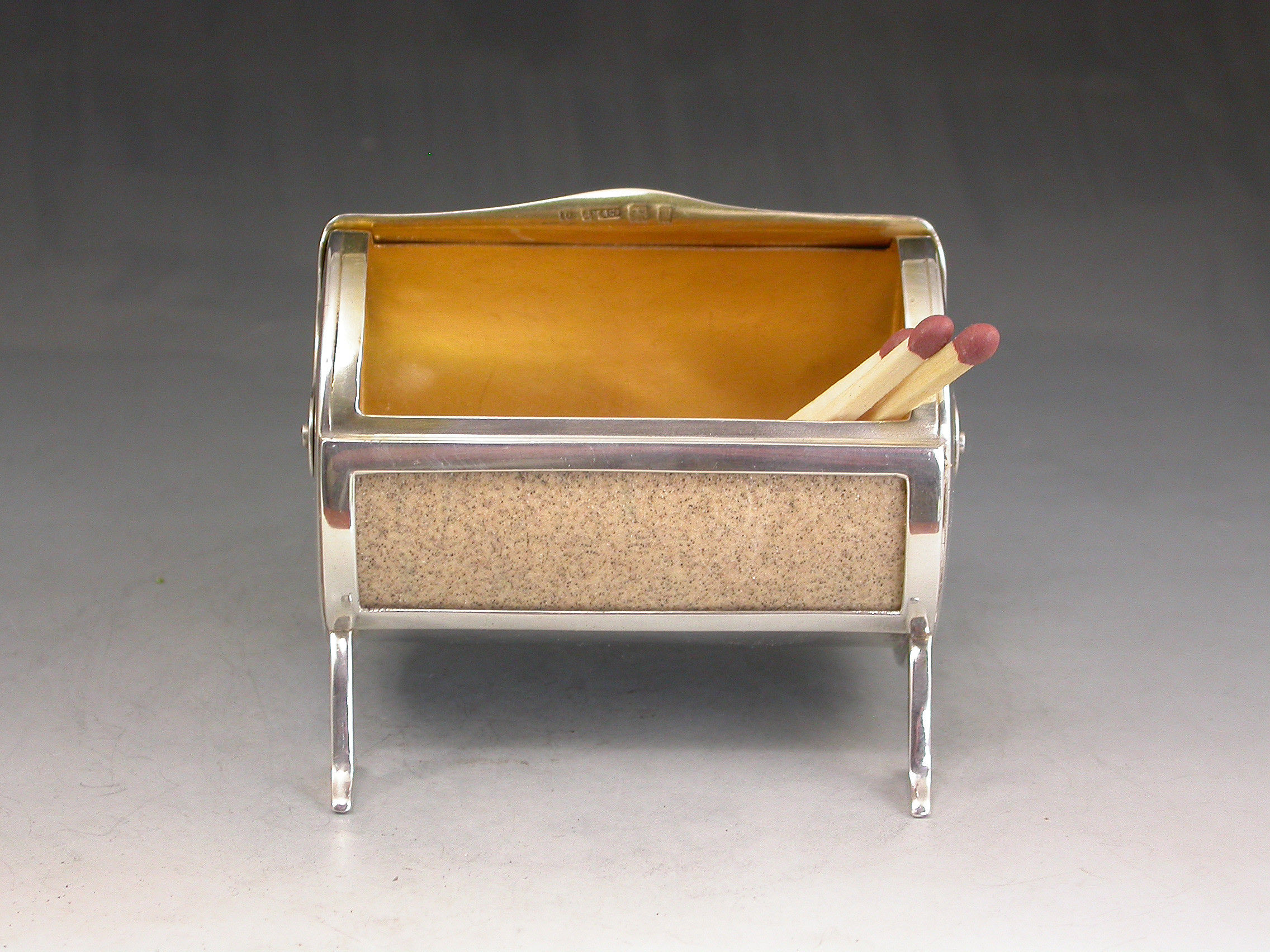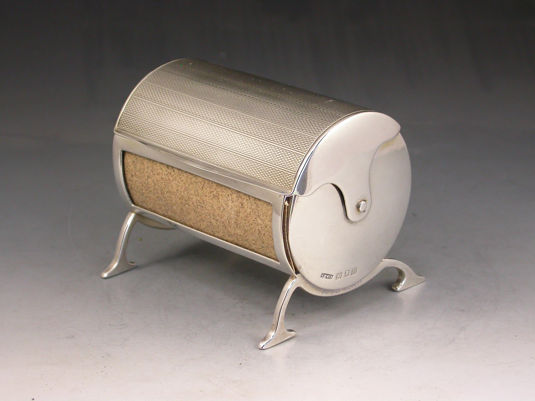 A fine quality George V silver revolving cylindrical Table Vesta Box, of a Patented design, standing on four spread feet, the pivoted cover revolving back and forth and forming an almost gasket like seal. A silver frame to the front holds the replaceable sandpaper striker. Art Deco style engine turned decoration to the lid and rear and a rich silver gilt interior.
