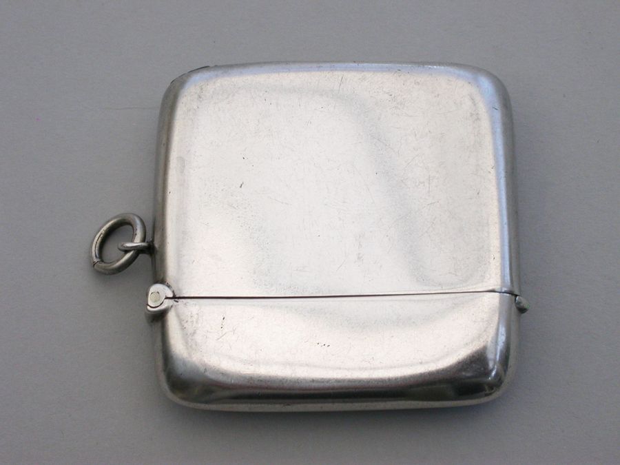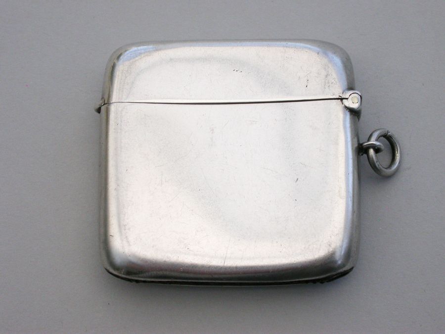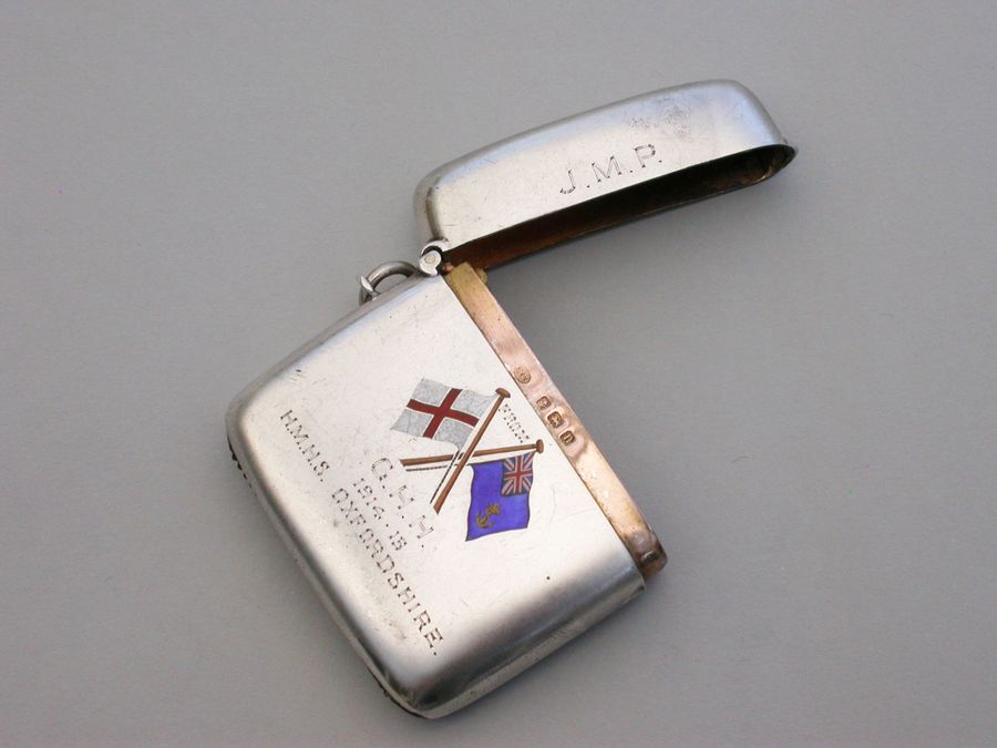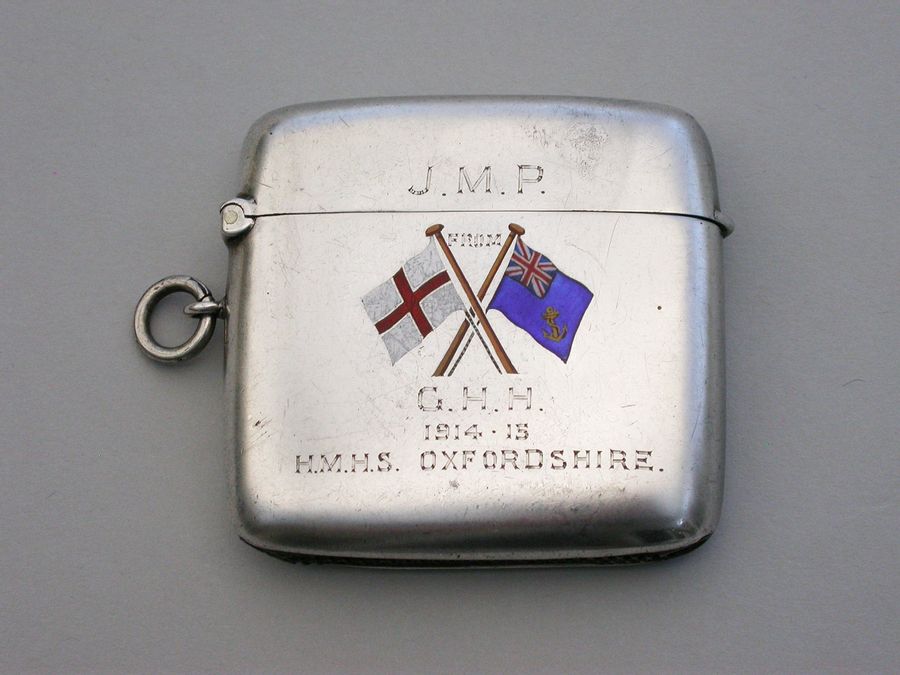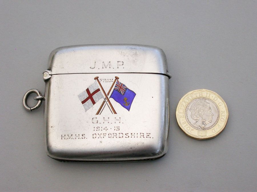 A good quality large early 20th century curved rounded rectangular silver Vesta Case with sprung hinged lid and attached suspension ring, the face enamelled with two crossed ensigns and a presentation inscription. Also stamped: 'HMHS Oxfordshire'. Silver gilt interior.