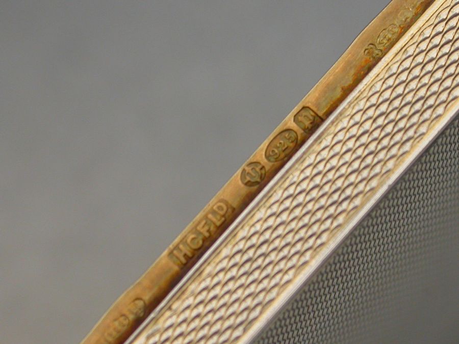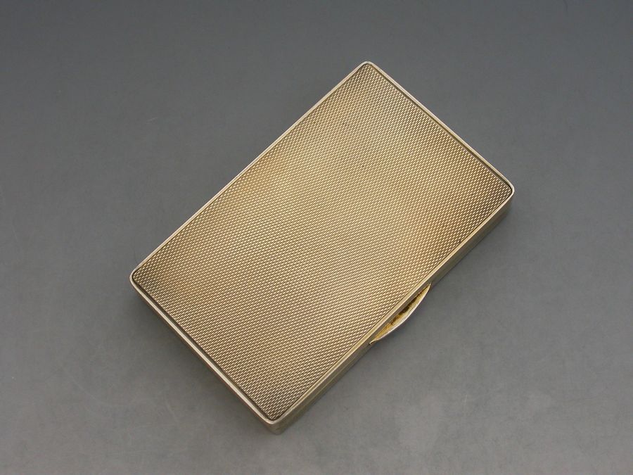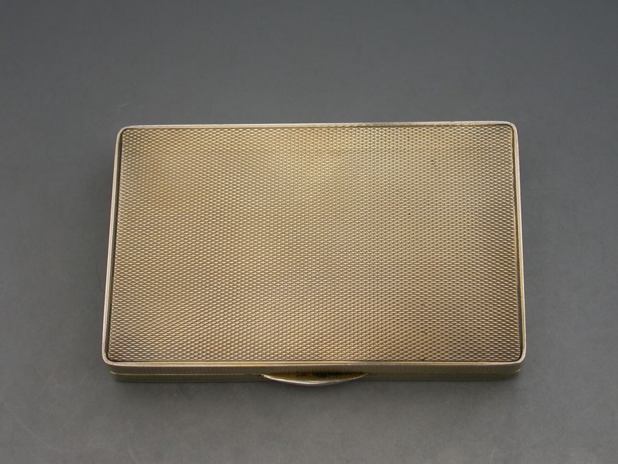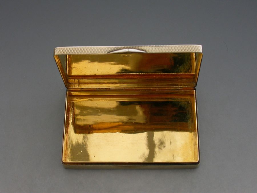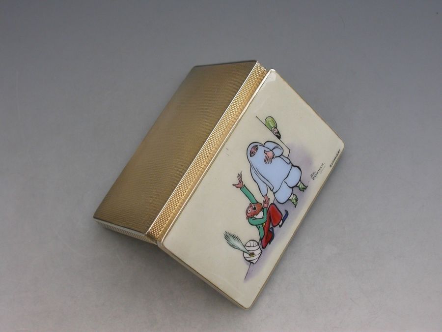 A rare early 20th century silver and enamel Snuff Box of rectangular form with engine turned base and sides, the lid inset with an enamel panel depicting a satirical cartoon by H M Bateman. Hinged lid and silver gilt interior.