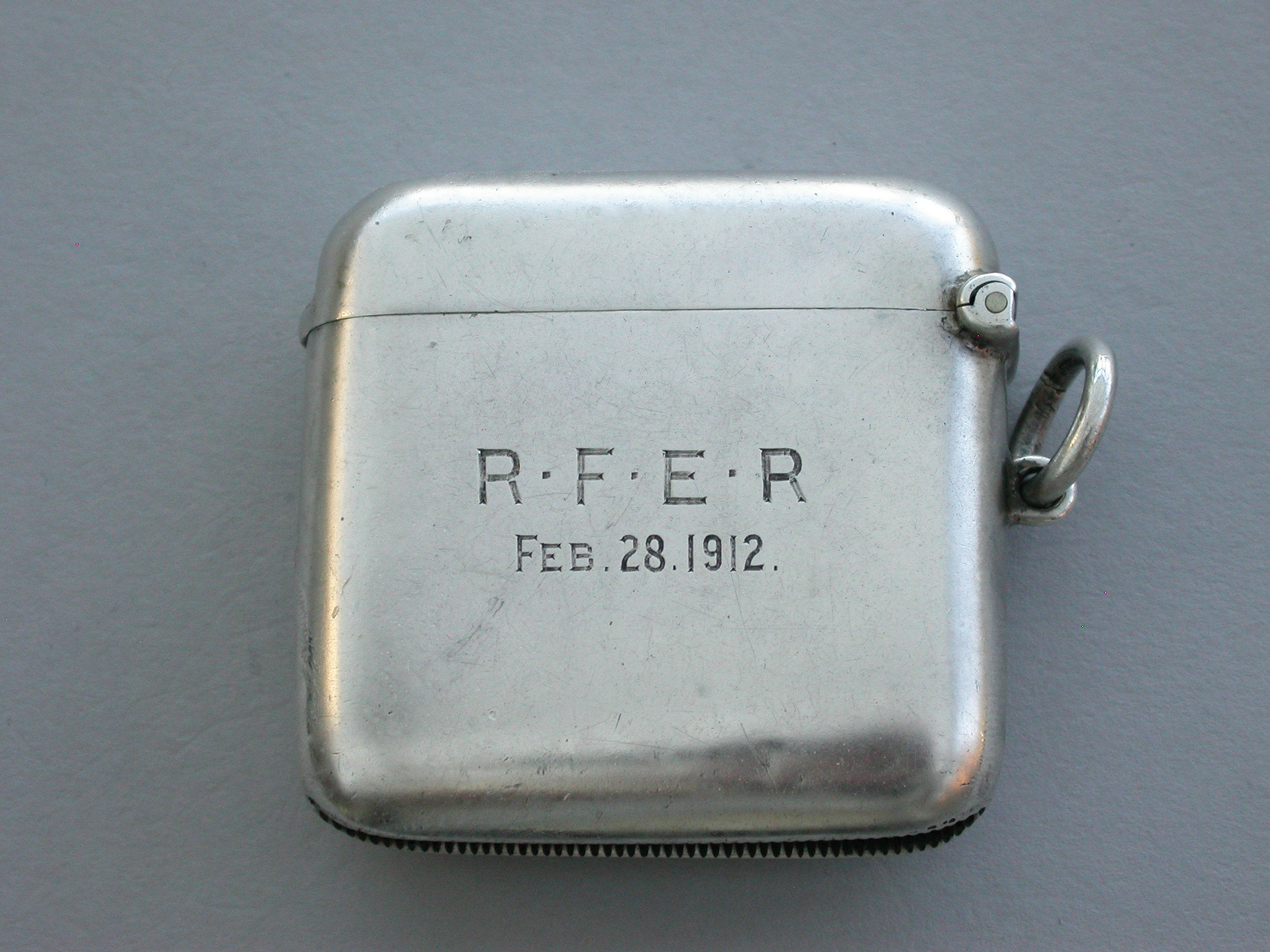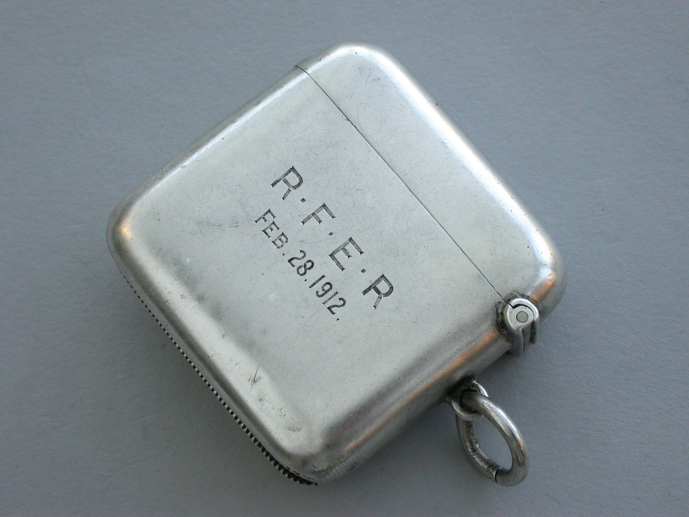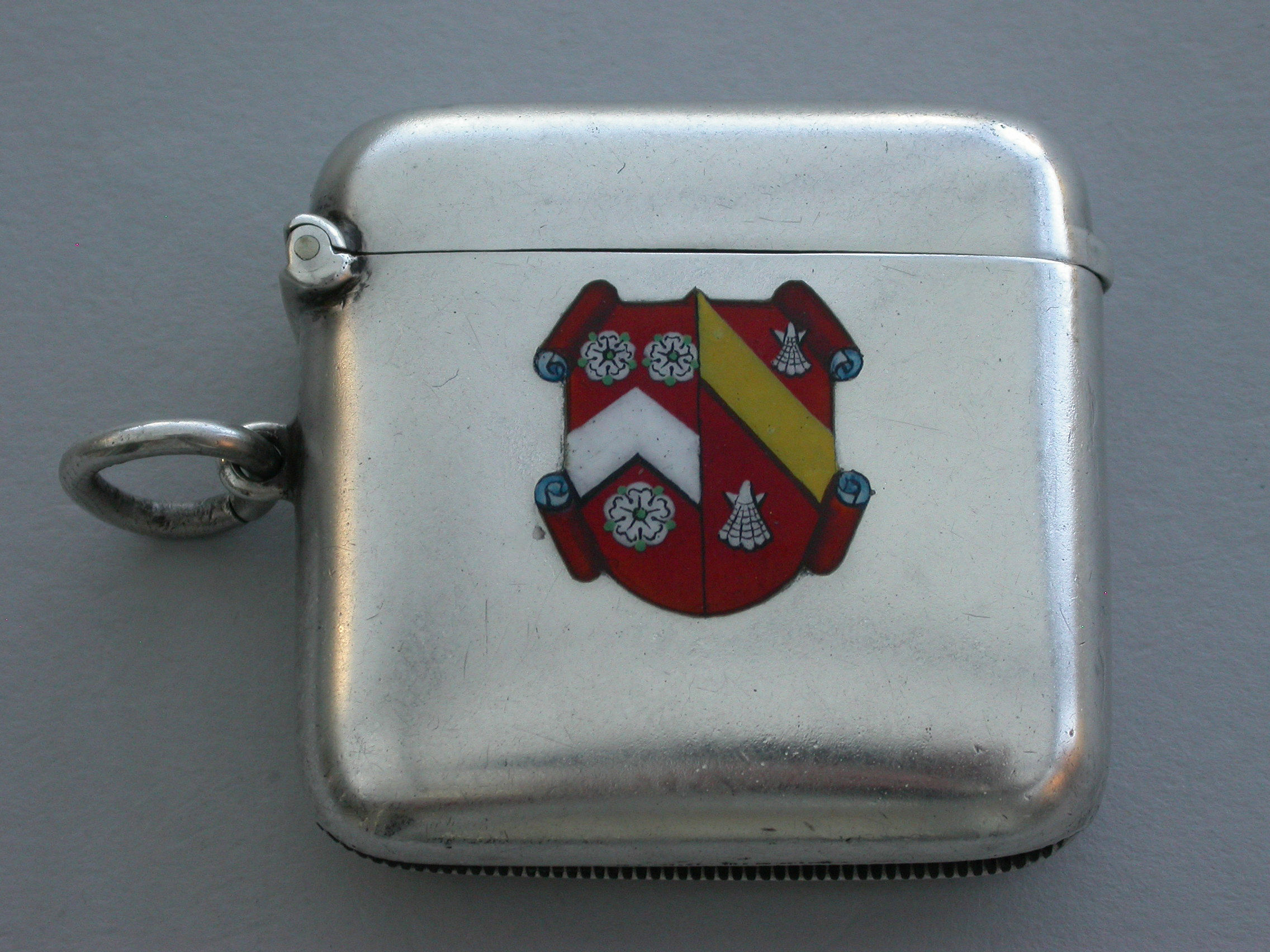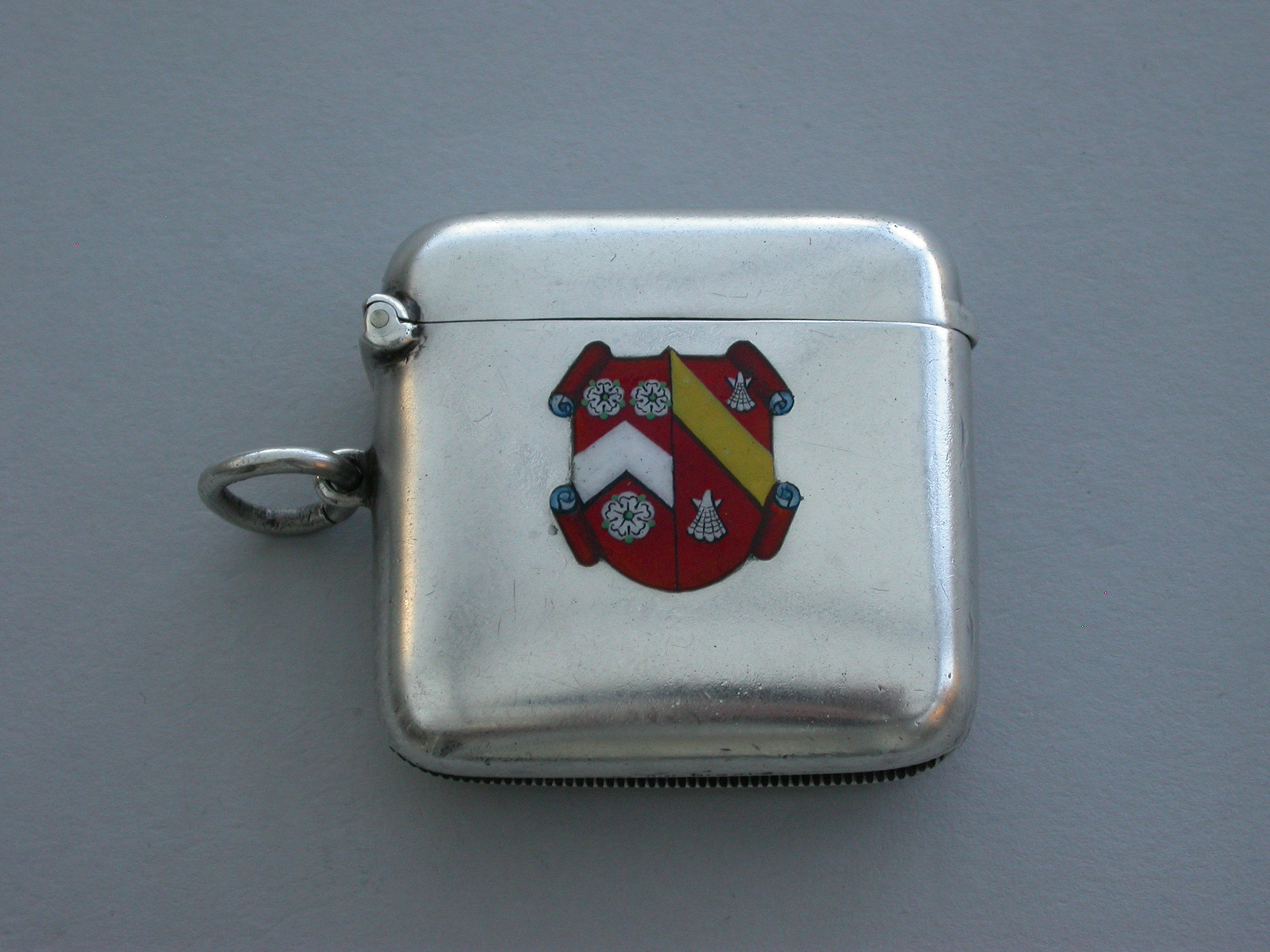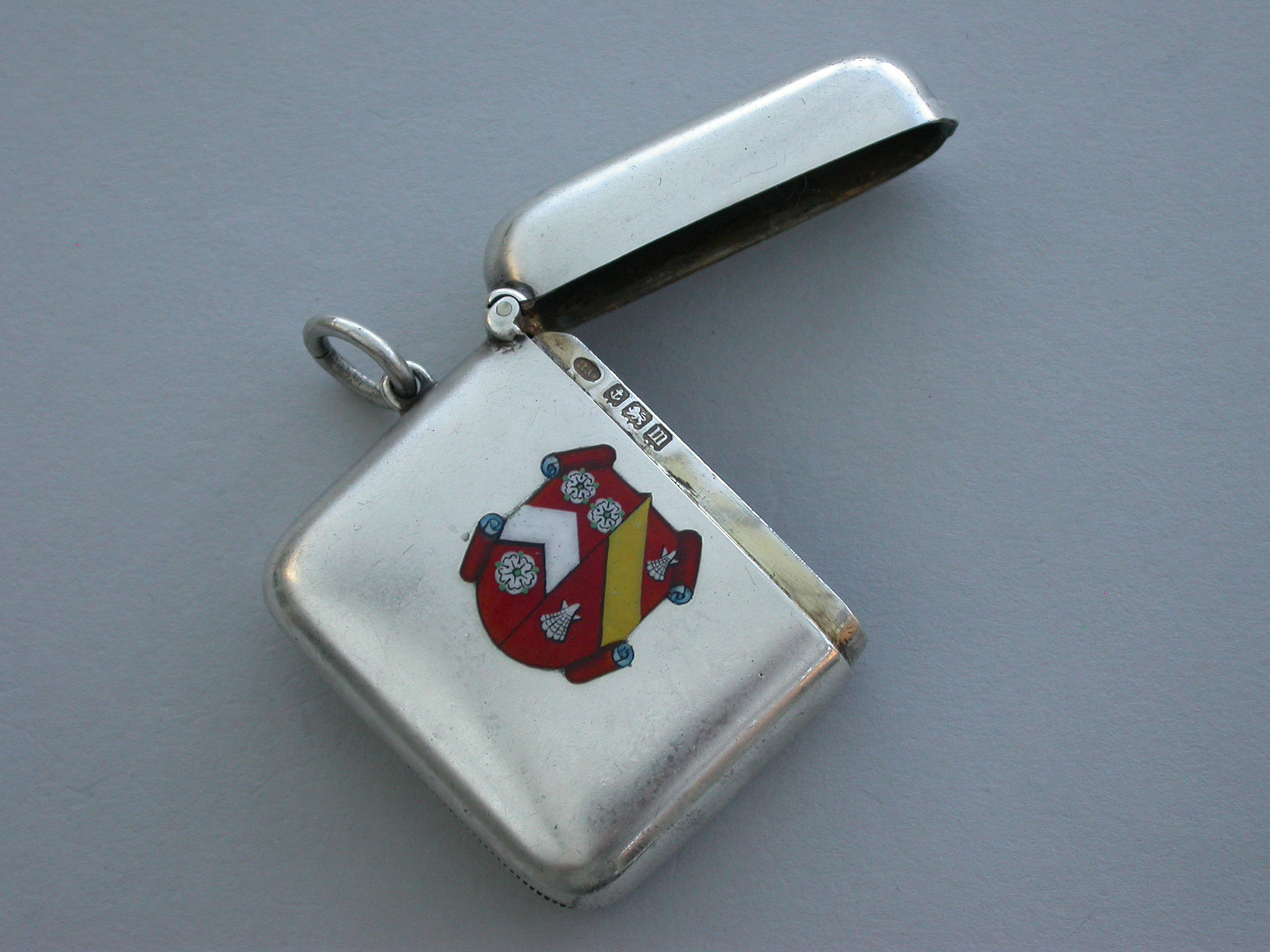 A good quality early 20th century silver and enamel Vesta Case of rounded rectangular form with sprung hinged lid and attached suspension ring, the face enamelled with the coat of arms of Wadham College, Oxford. The reverse engraved with initials and dated 1912.