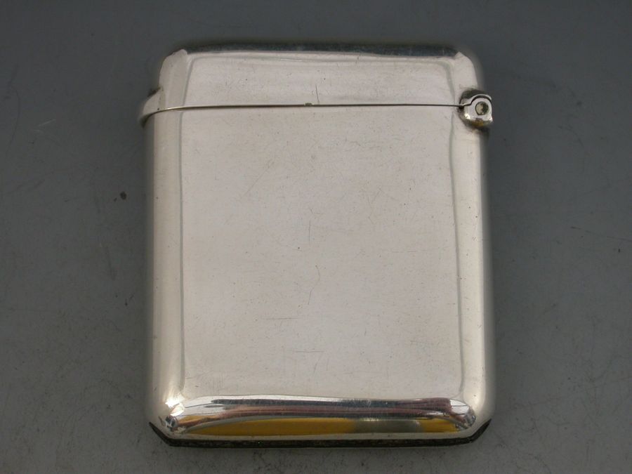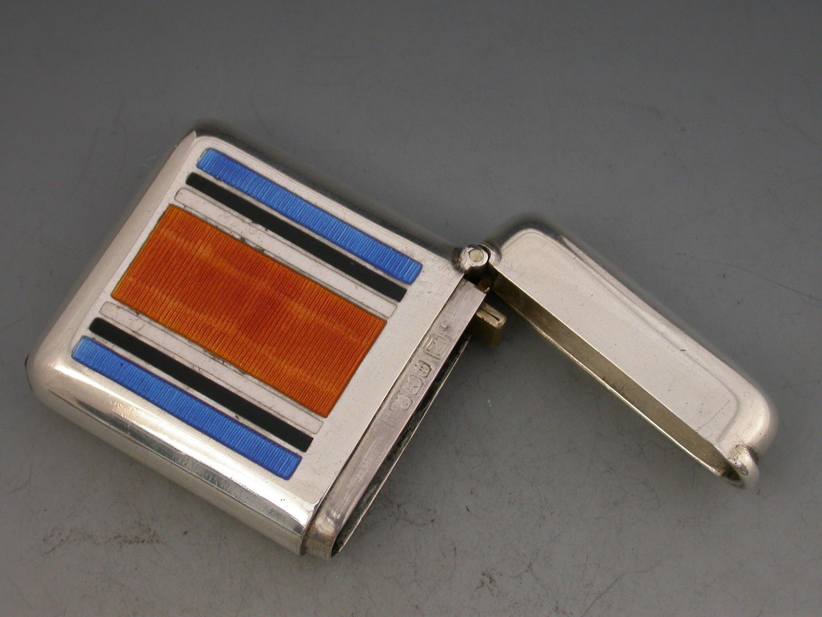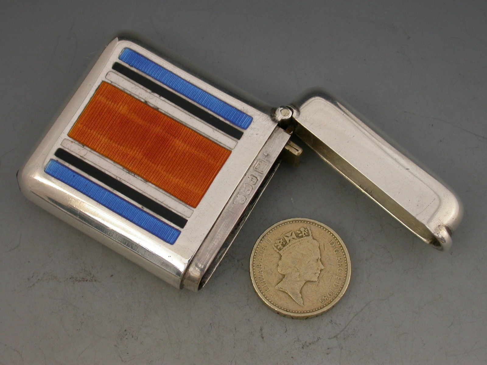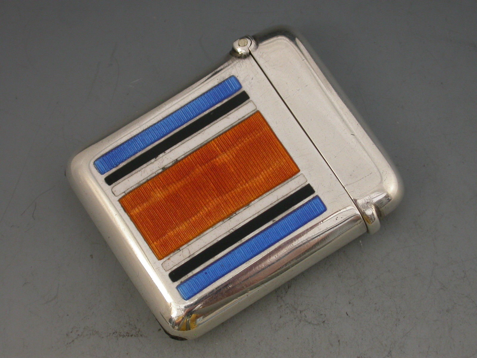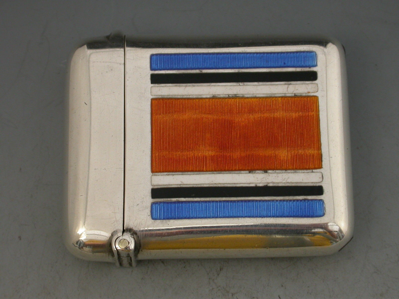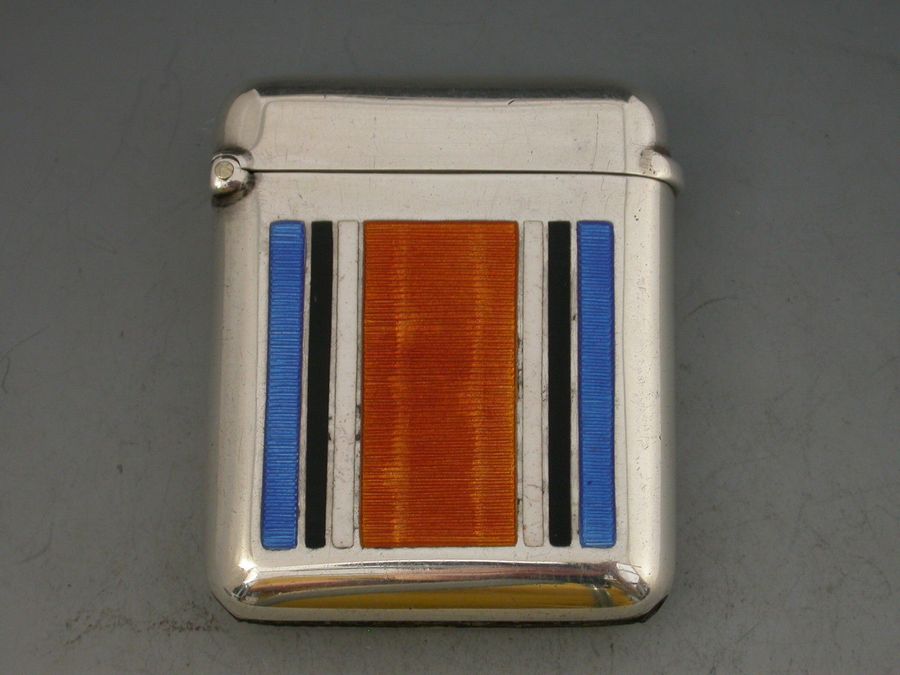 A good quality George V large silver and enamel Vesta Case of rounded rectangular form with hinged flip top lid. The face enamelled with the ribbon of The British War Medal 1914-18.