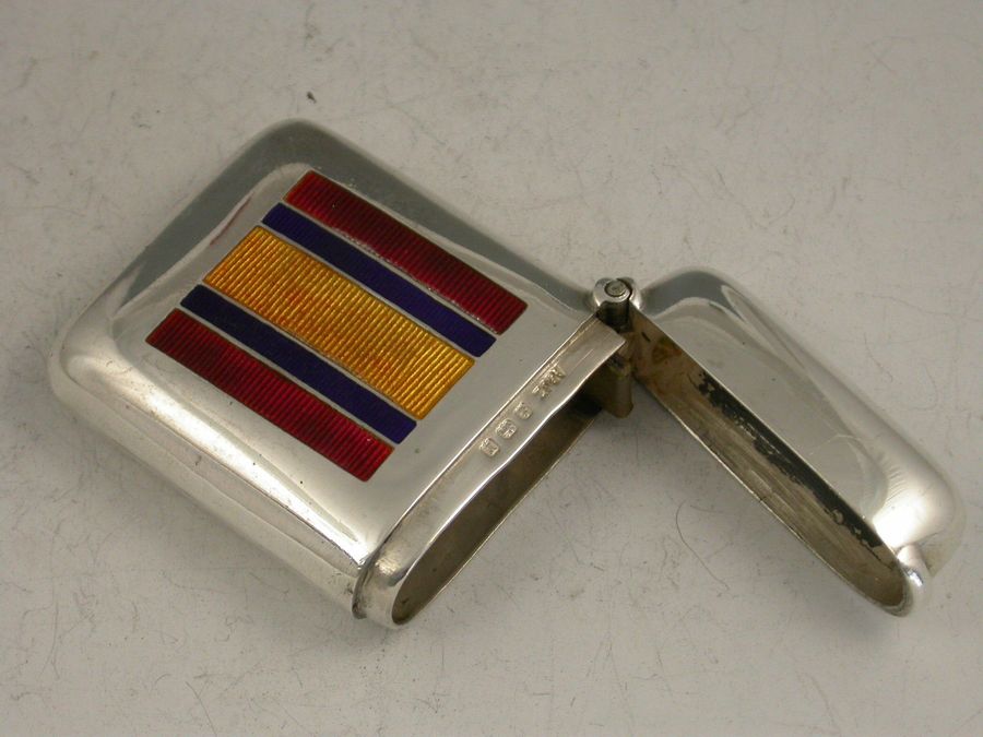 A rare George V silver and enamel Vesta Case of rounded rectangular form with hinged flip-top lid, the face enamelled with the Queens South Africa Medal Ribbon.