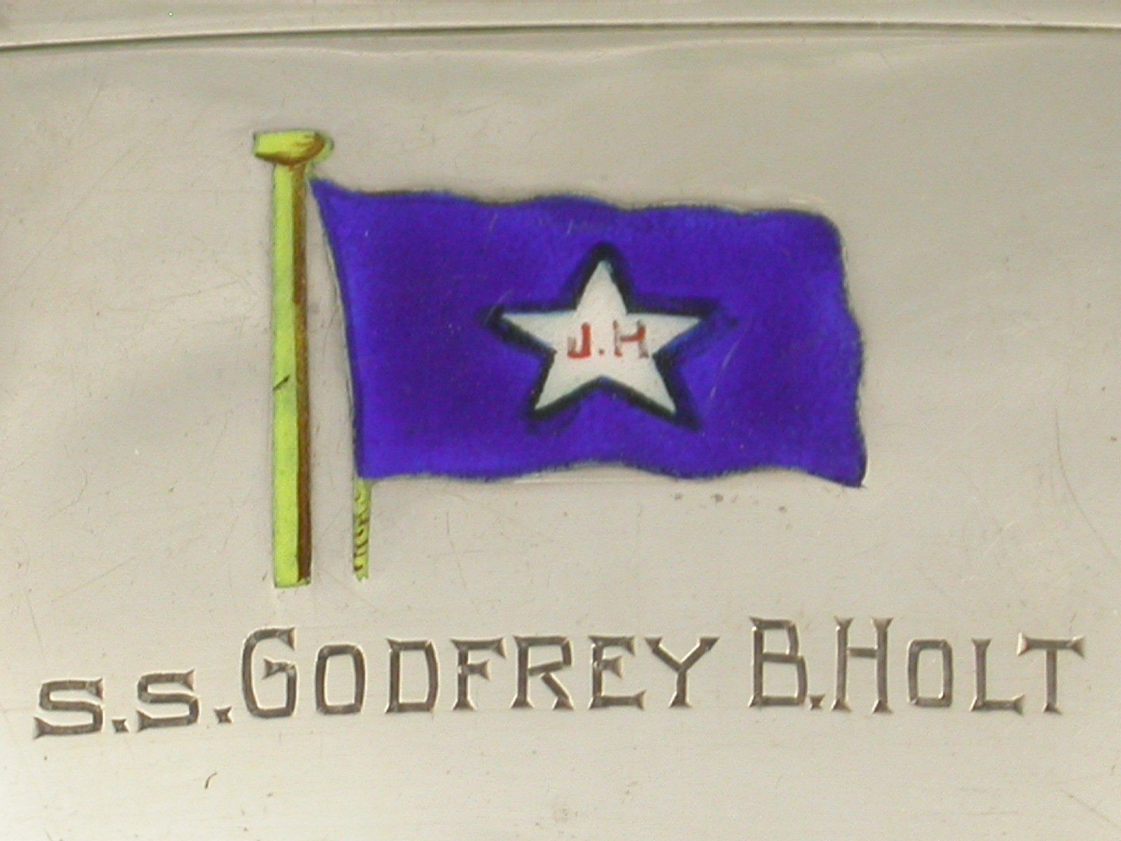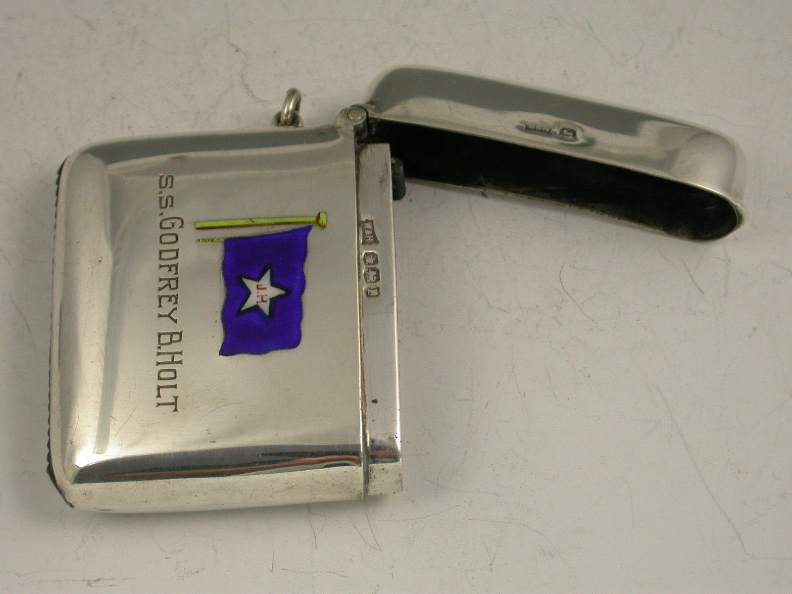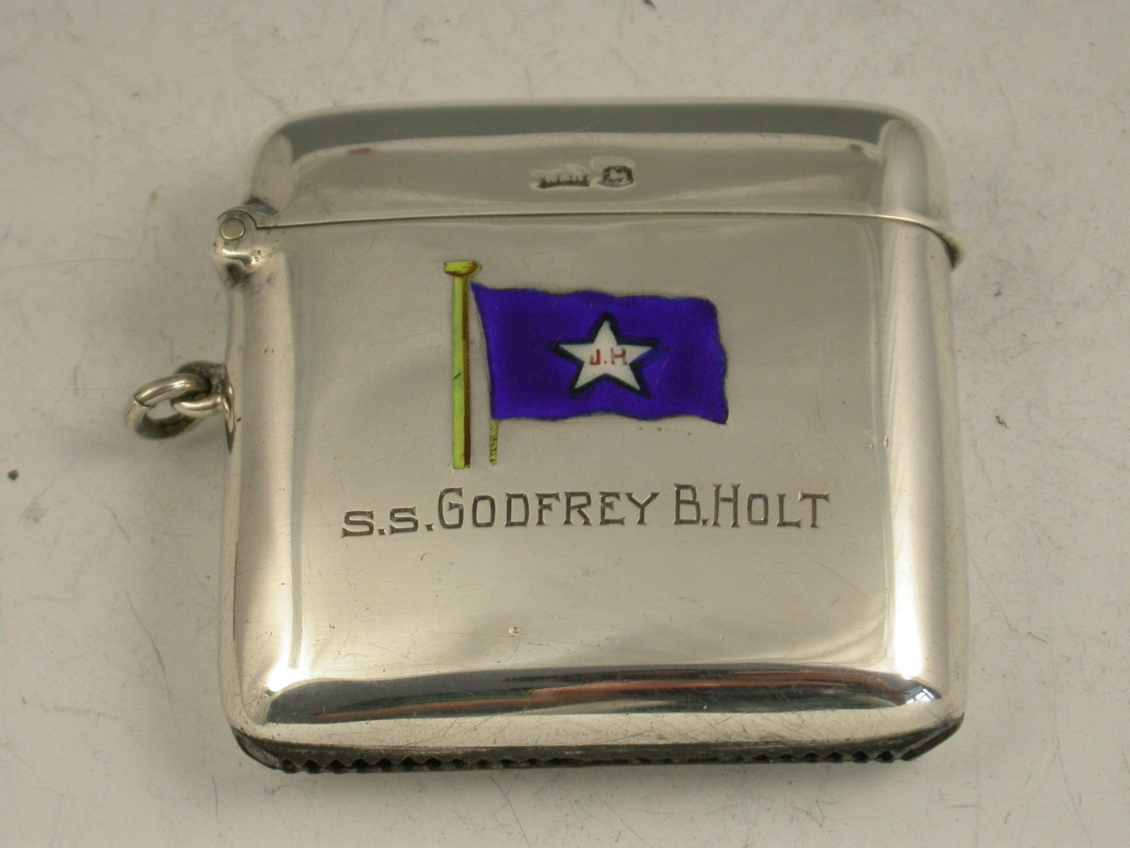 A good George V silver and enamel Vesta Case of large rounded rectangular form with sprung hinged flip top lid, the face enamelled with the flag of the John Holt & Co Shipping Company, and engraved 'S.S. Godfrey B'. Holt. Made to commemorate the launch of the ship - Godfrey B Holt in 1929. Built by Cammel Laird & Co Ltd, Birkenhead.
