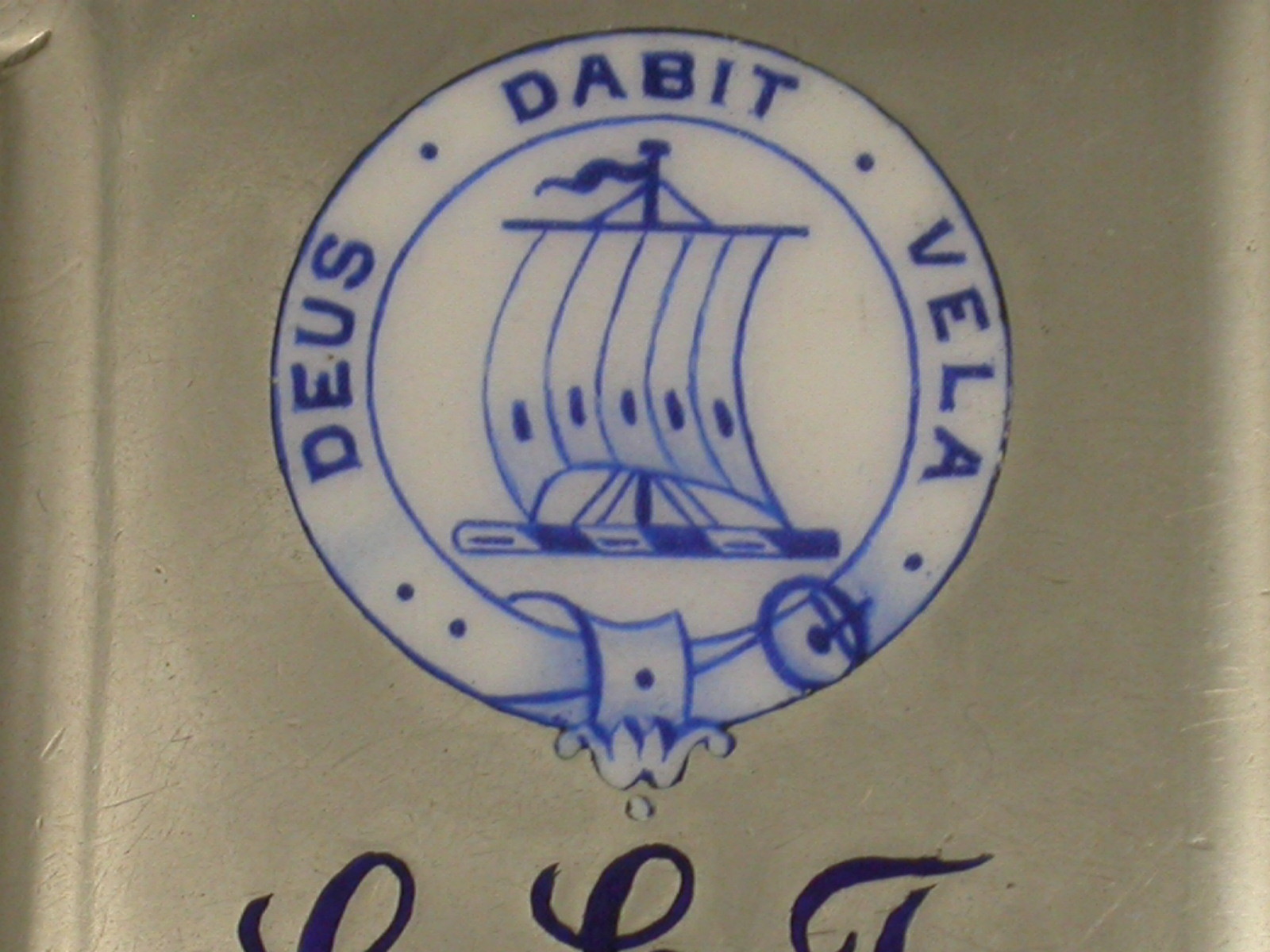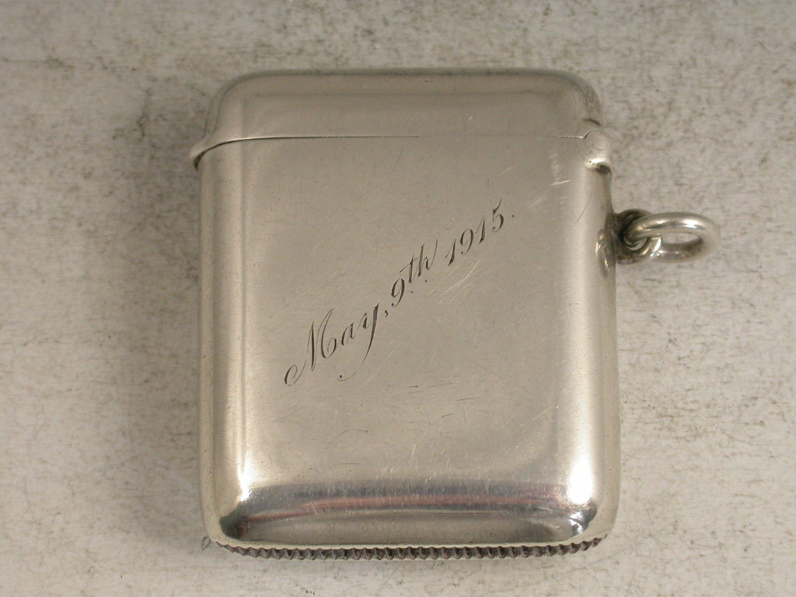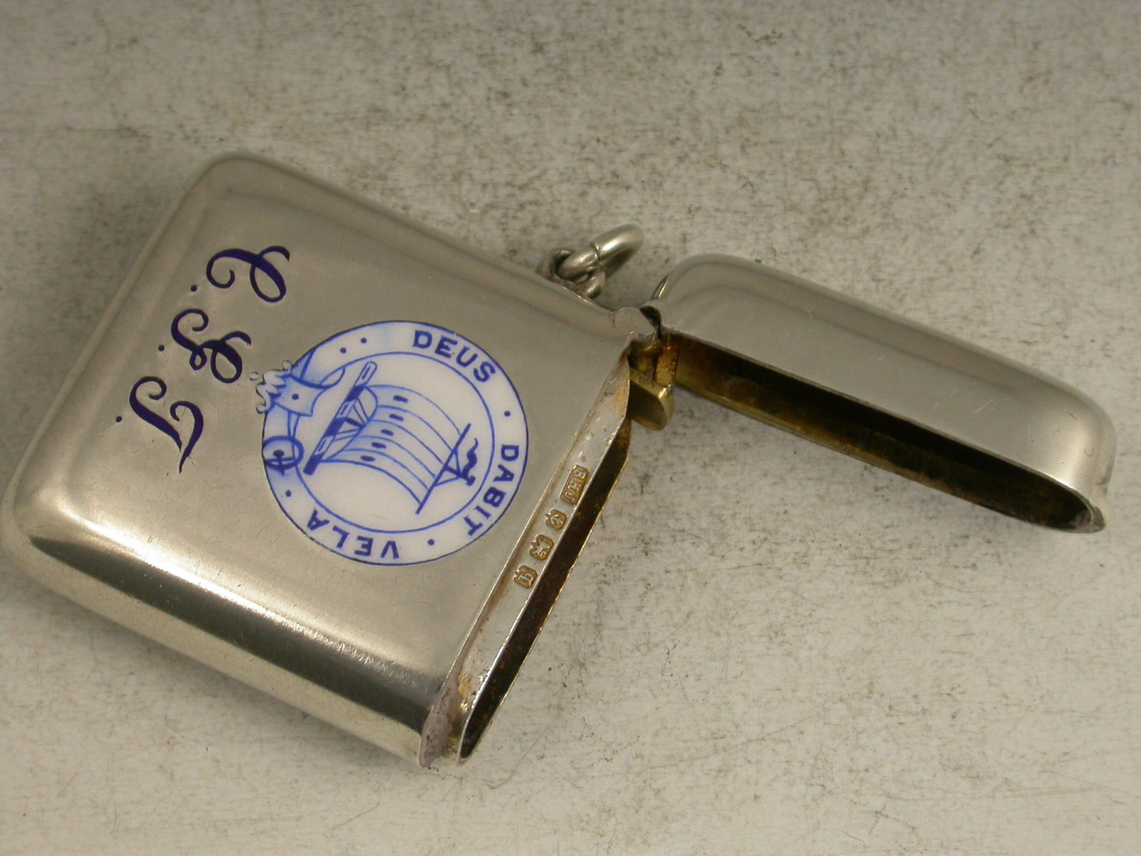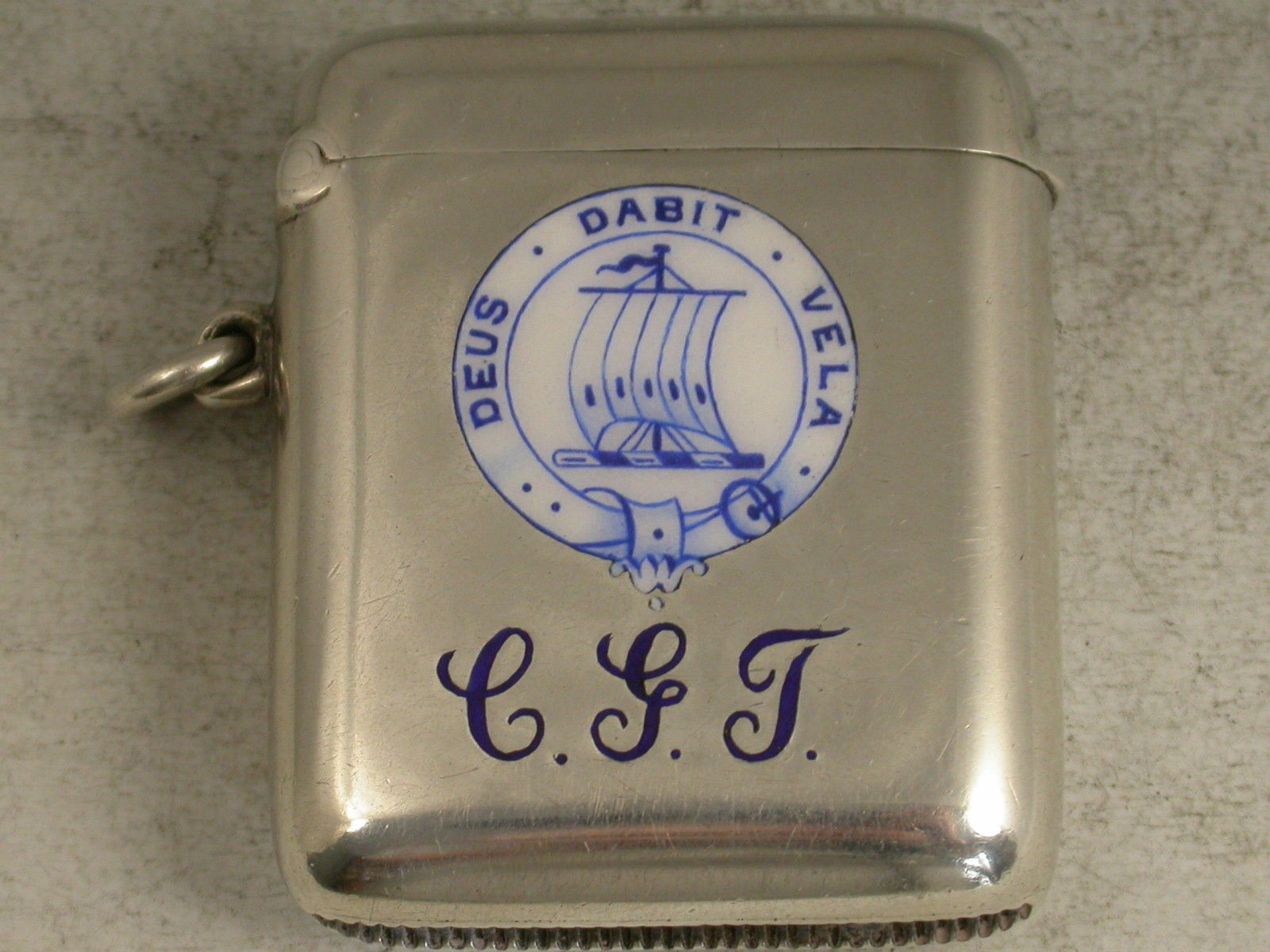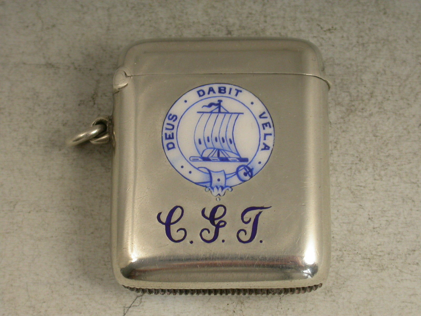 A rare George V silver Vesta Case of rounded rectangular form with hinged flip-top lid, the face enamelled with the Crest, Garter, motto and initials of Christopher Grey Tennant, 2nd Baron Glenconner. The reverse engraved May 9th 1915. (See: The Steppes Hill Farm Antiques Newsletter, No 16, October 2012 for more information).