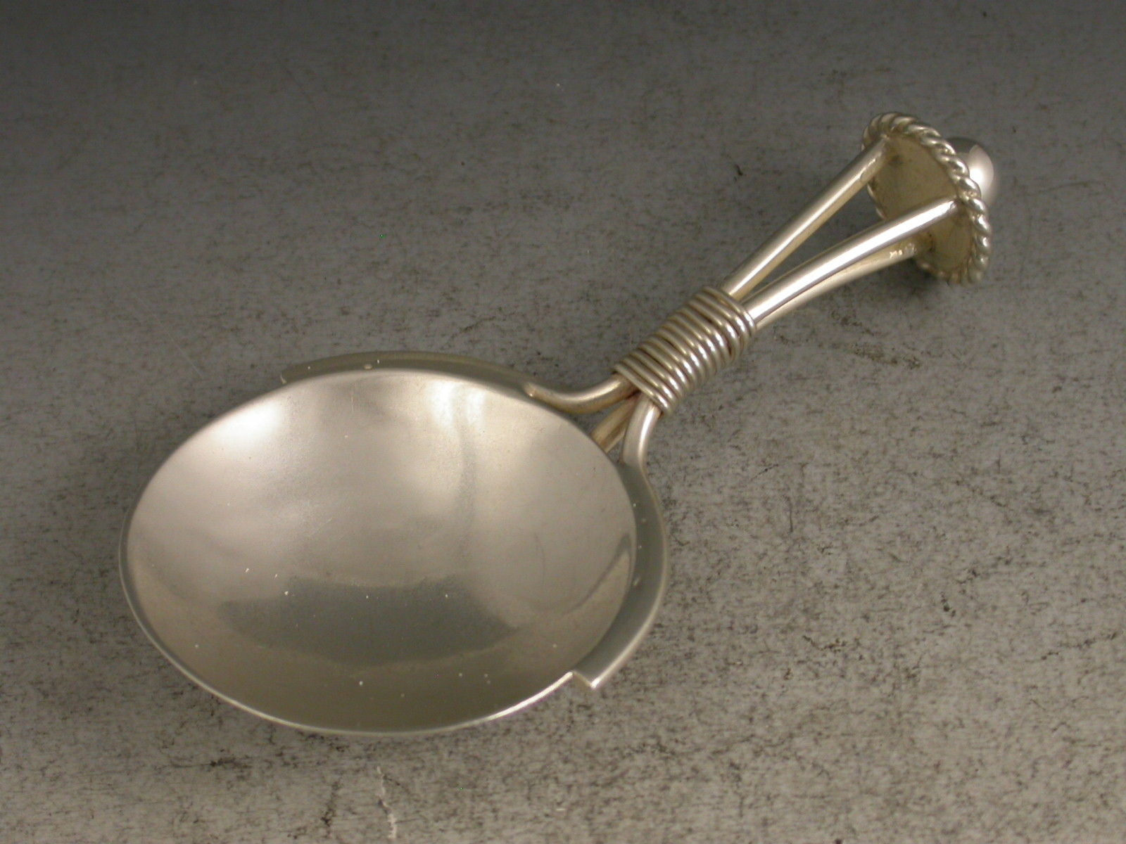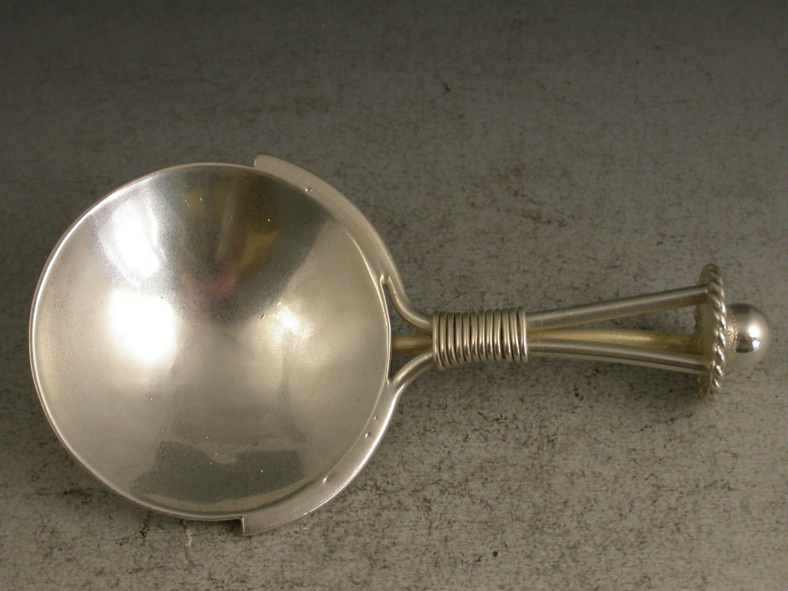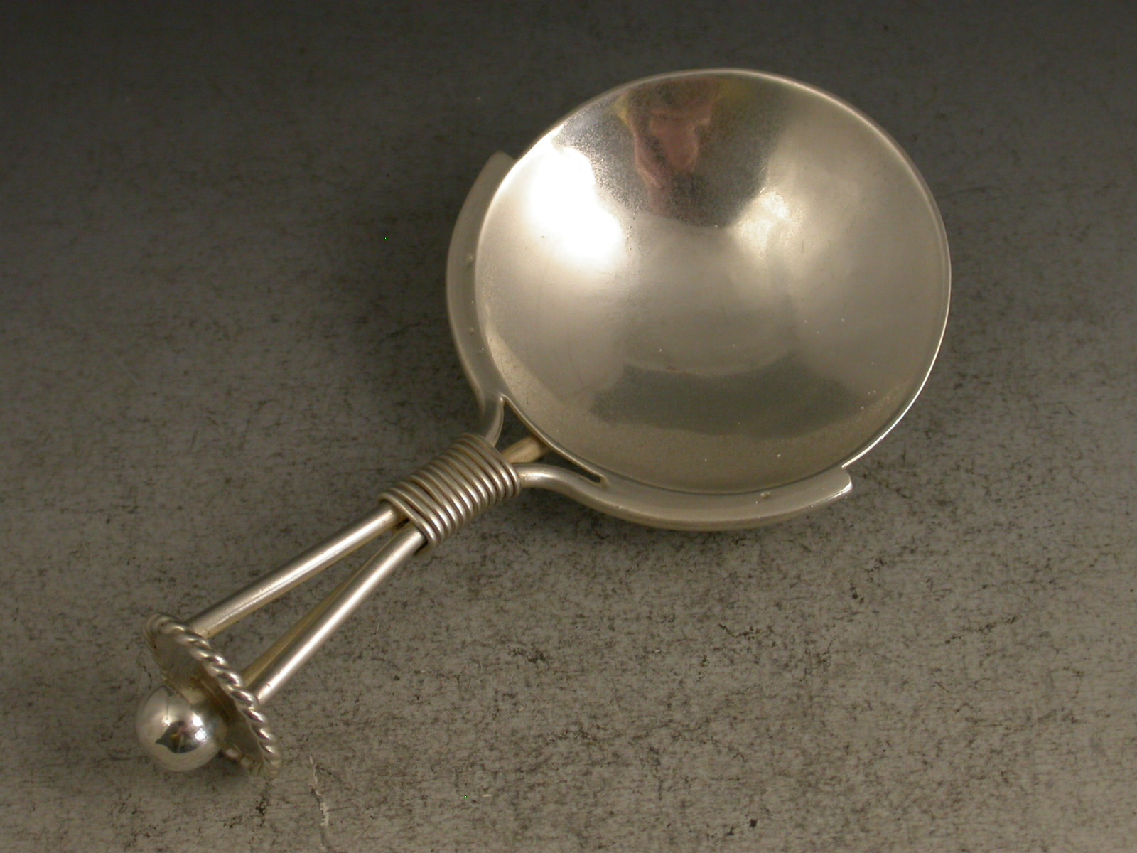 An early 20th century Arts & Crafts style Caddy Spoon with hammered circular bowl and tri-furcated handle supporting a disc surmounted by a ball.
