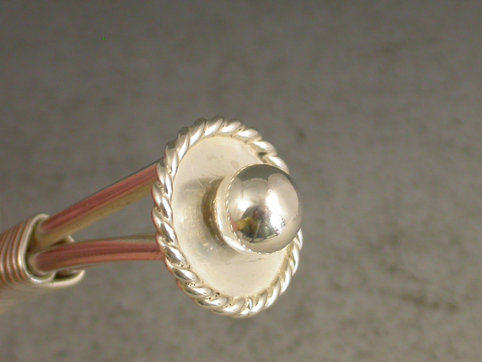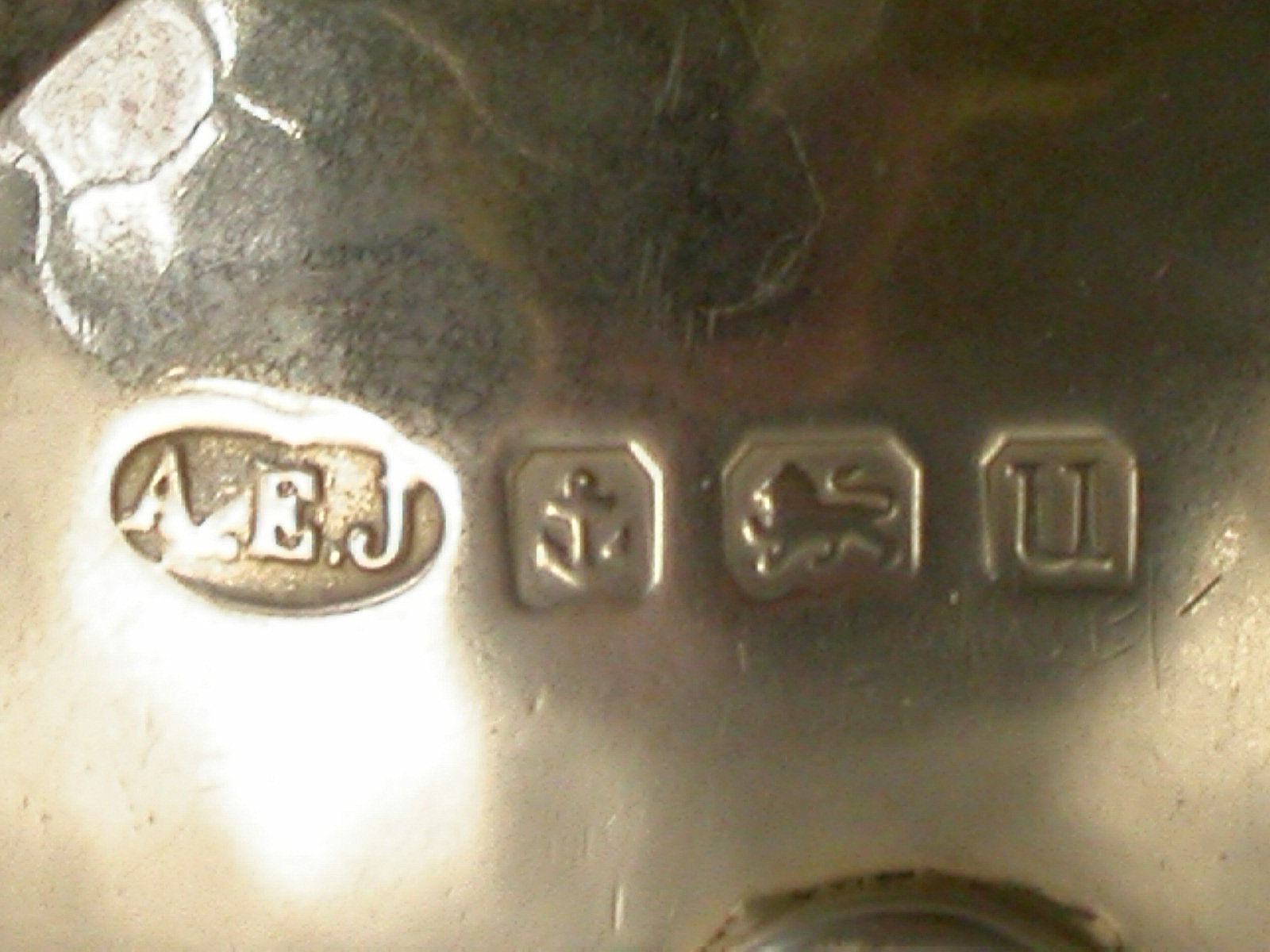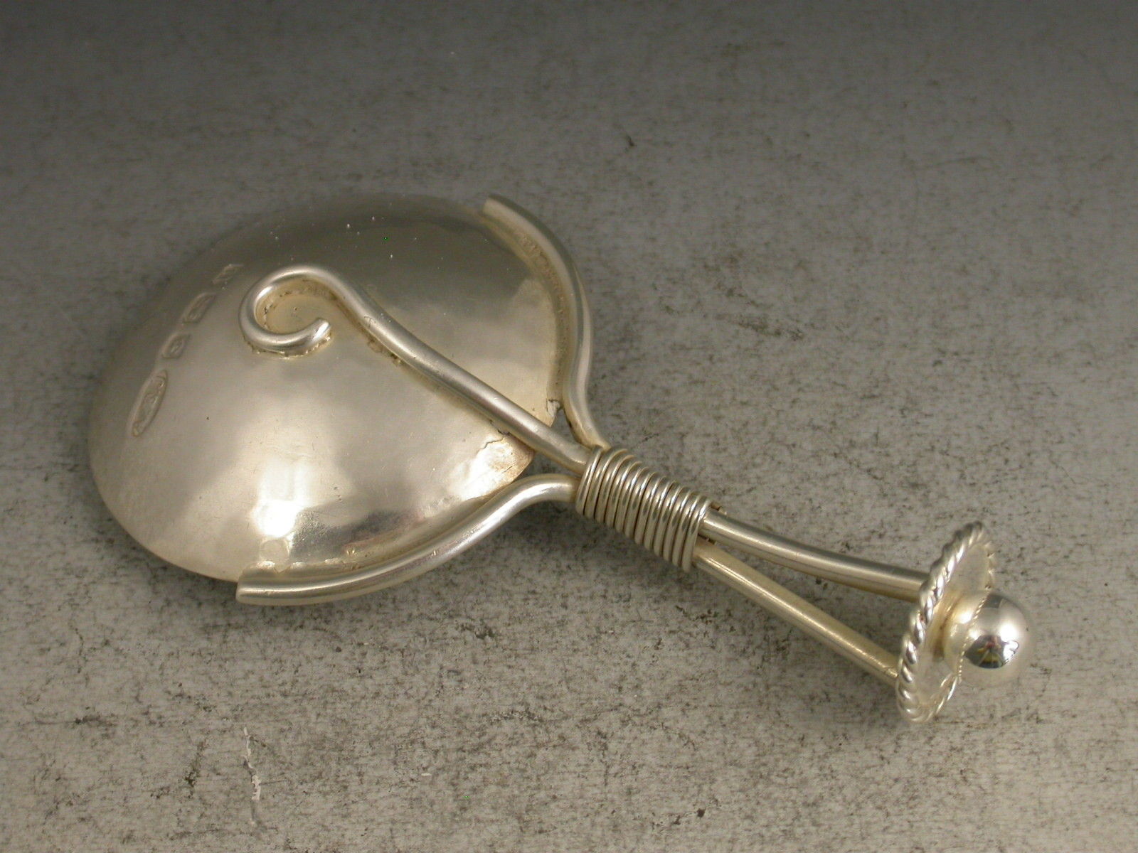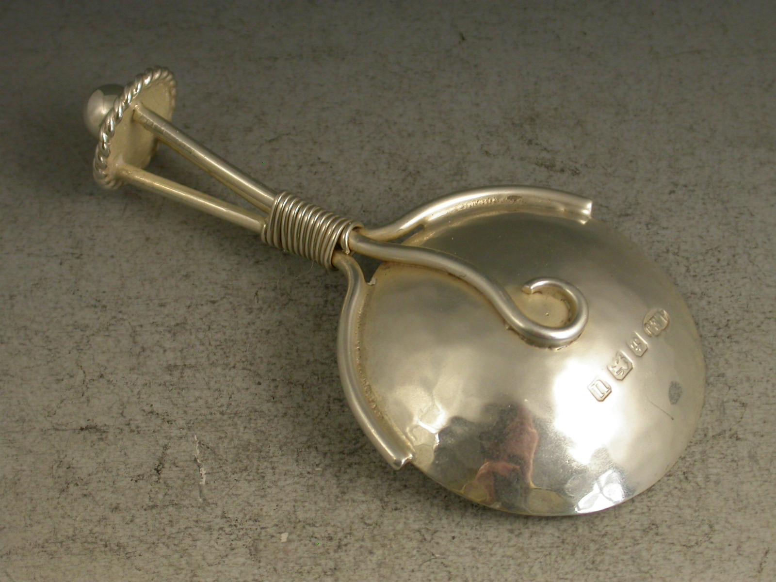 An early 20th century Arts & Crafts style Caddy Spoon with hammered circular bowl and tri-furcated handle supporting a disc surmounted by a ball.