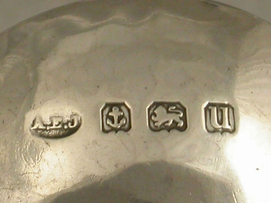 An early 20th century Arts & Crafts style Caddy Spoon with hammered circular bowl and tri-furcated handle supporting a disc surmounted by a ball.