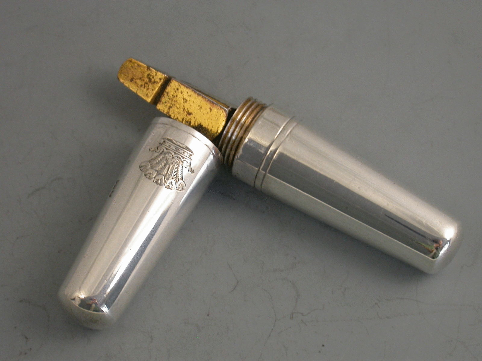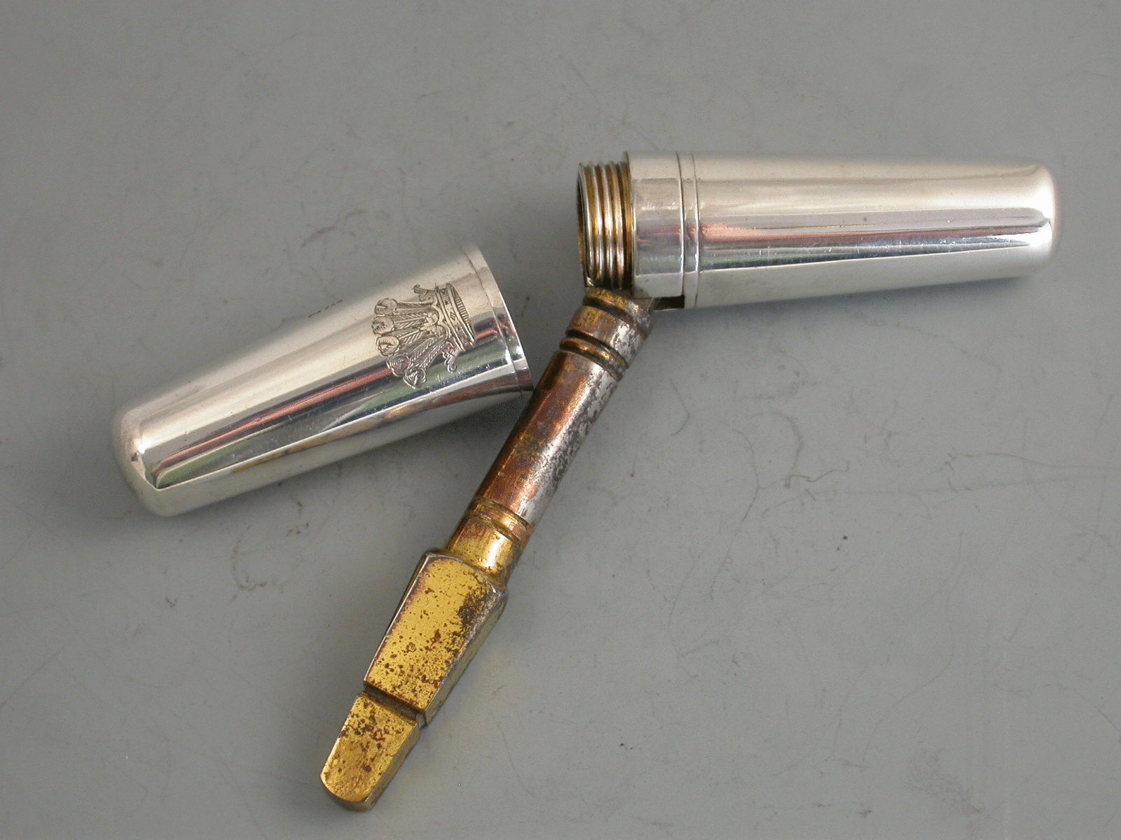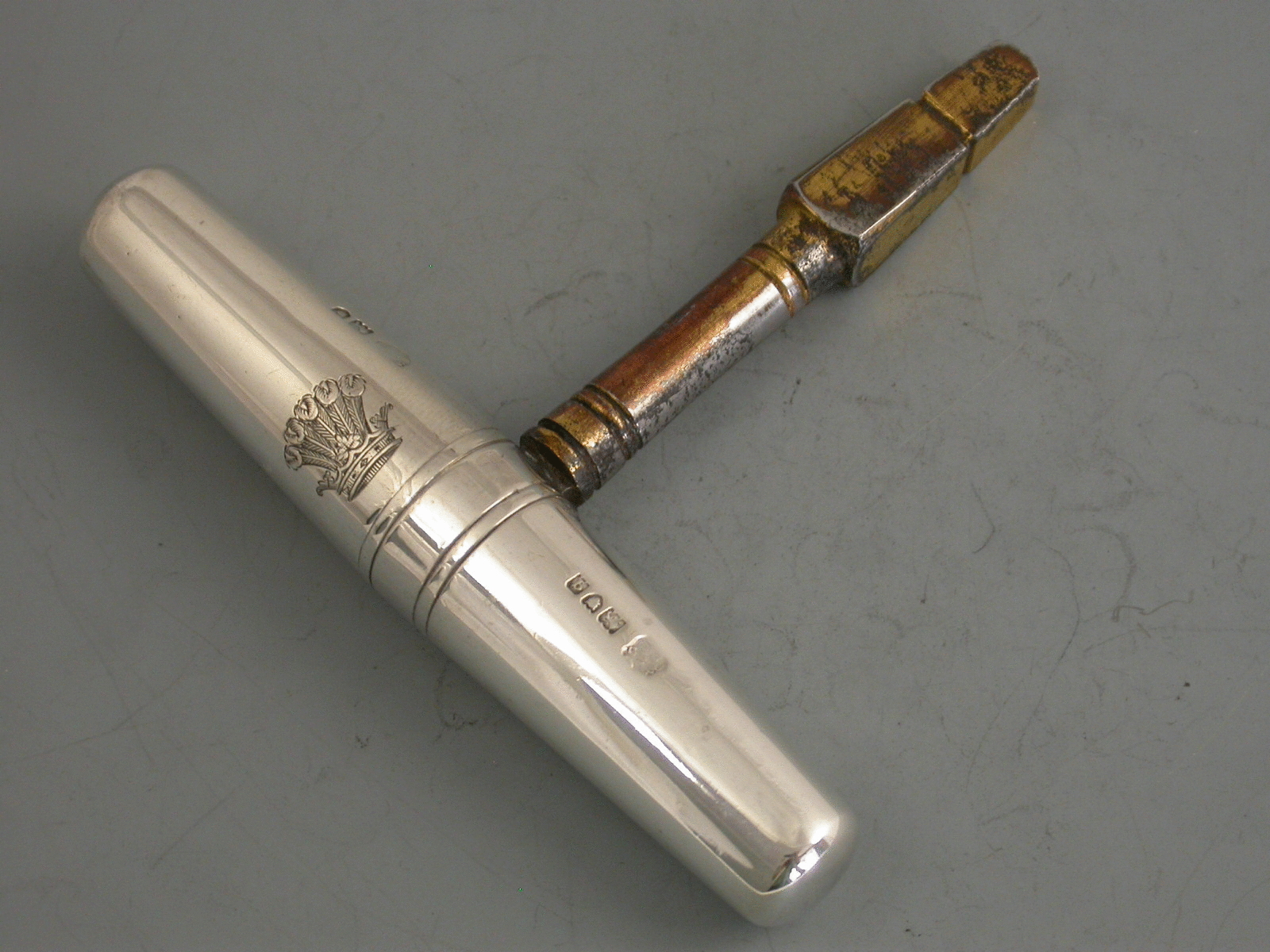 A George V silver mounted steel pocket Carriage Key, the double tapering body unscrewing at the centre to reveal the foldout key. Engraved with a crest of five Ostrich feathers issuing out of a coronet (that of many families).