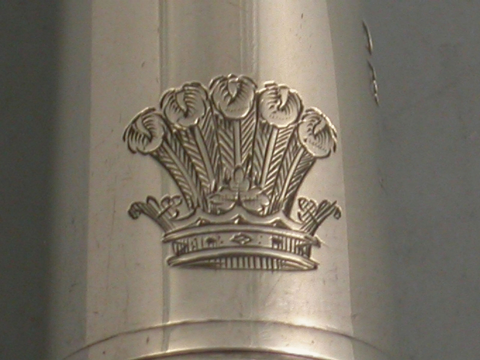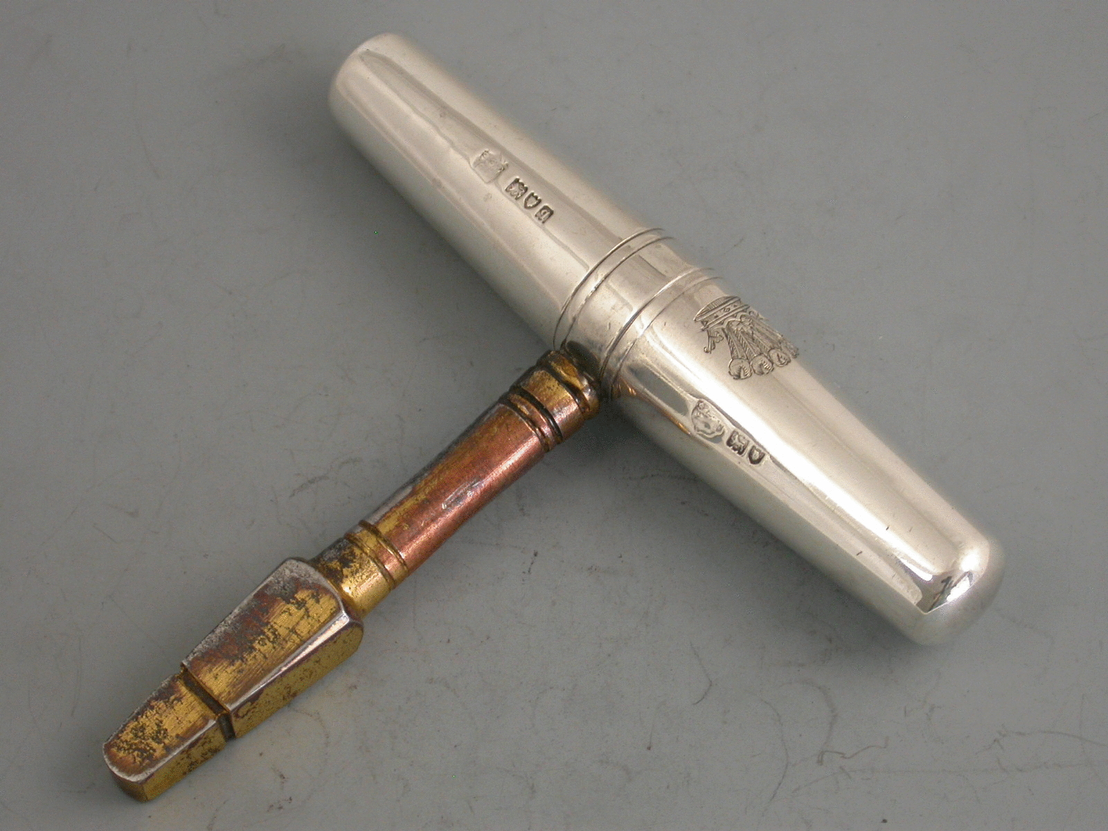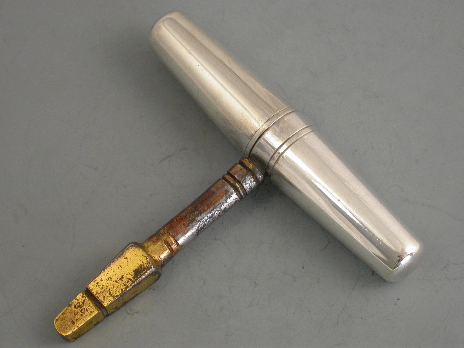 A George V silver mounted steel pocket Carriage Key, the double tapering body unscrewing at the centre to reveal the foldout key. Engraved with a crest of five Ostrich feathers issuing out of a coronet (that of many families).