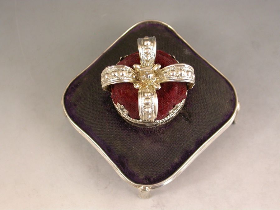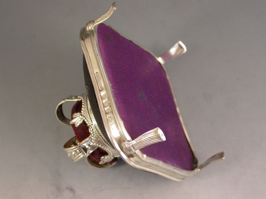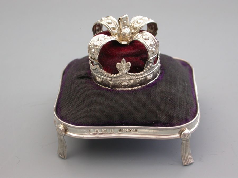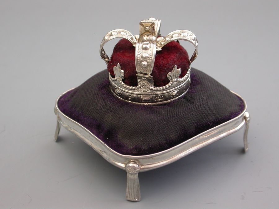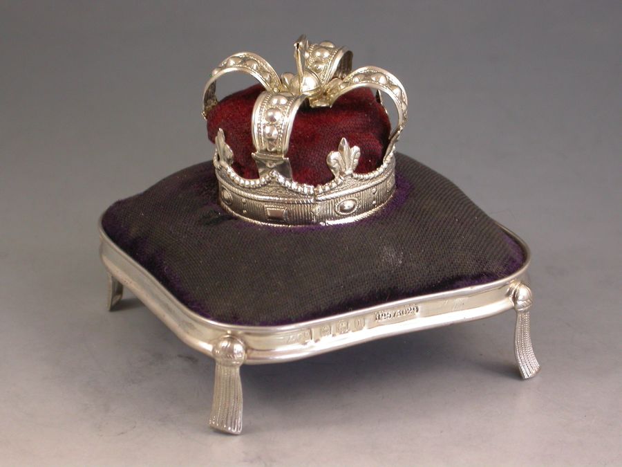 A good early 20th century novelty silver Pin Cushion formed as the Coronation Crown of George V sitting on a cushion, the tassels forming the four legs. Complete with original red and blue velvet cushions.