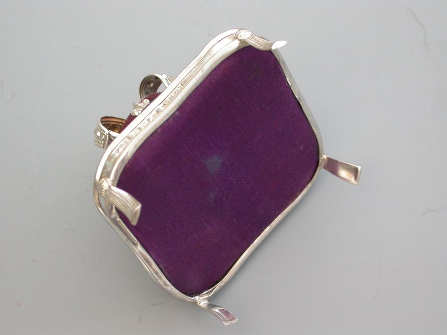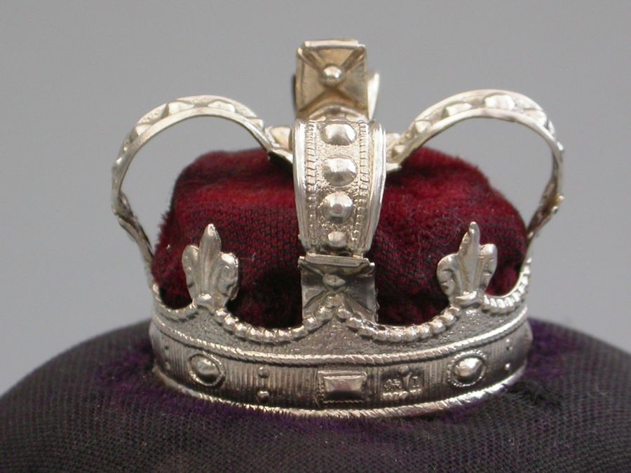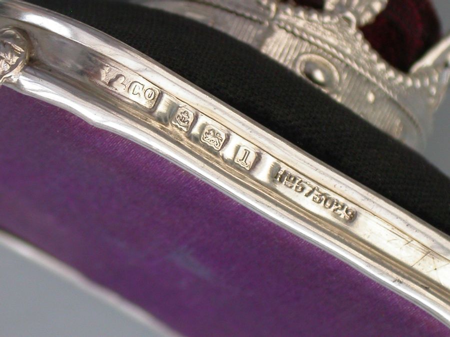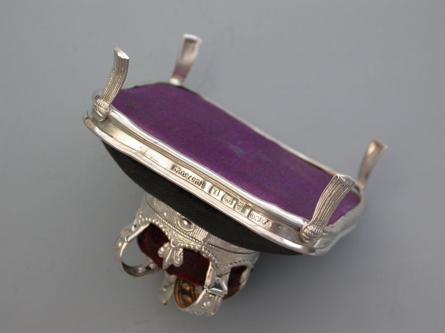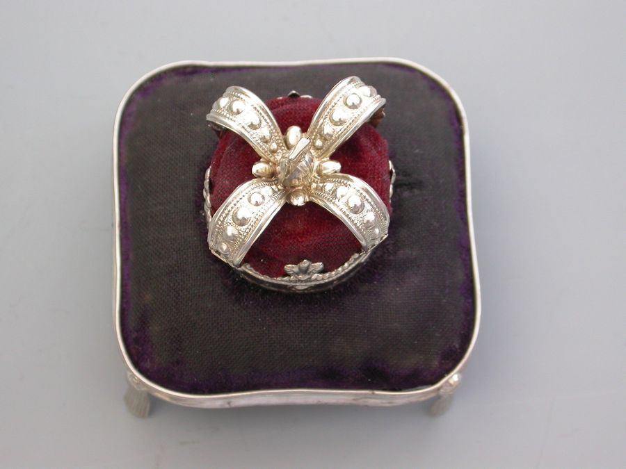 A good early 20th century novelty silver Pin Cushion formed as the Coronation Crown of George V sitting on a cushion, the tassels forming the four legs. Complete with original red and blue velvet cushions.