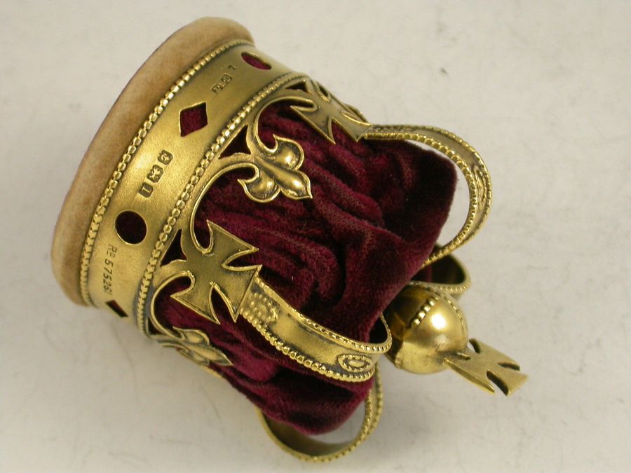 An early 20th century silver gilt and velvet Pin Cushion formed as the Coronation Crown of George V. Complete with original burgundy coloured velvet cushion.