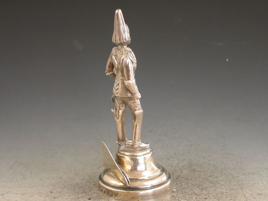 A very fine quality early 20th century cast silver Menu Holder made in the form of a Soldier from the Household Cavalry (either The Life Guards or The Blues and Royals) standing on a circular pedestal base.