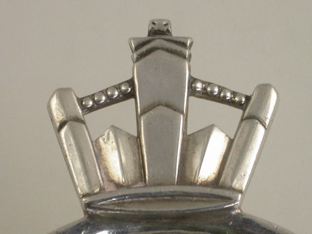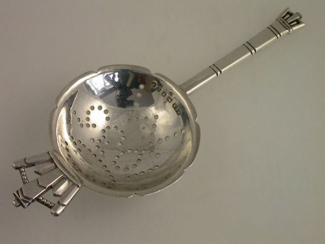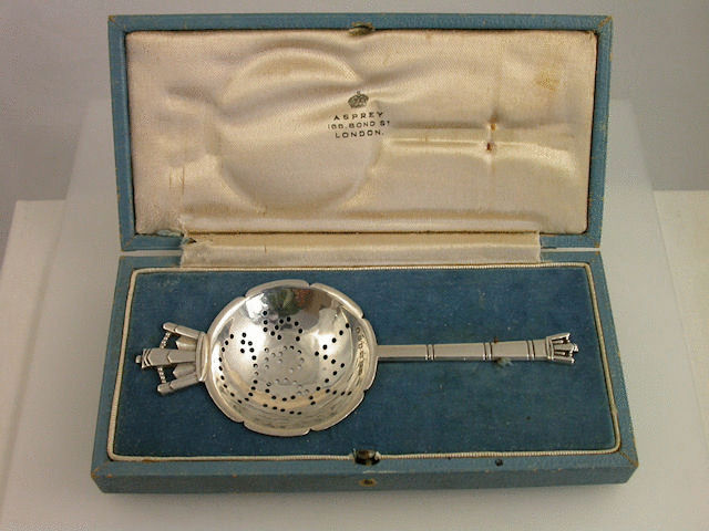 A cased silver Commemorative Tea strainer in the Art Deco style with crown shaped handles, the shaped circular bowl pierced ‘G 1935 M’ to commemorate the silver jubilee of George V and Queen Mary in 1935. Complete with original silk and velvet lined fitted case and retailed by Asprey of Bond Street, London.