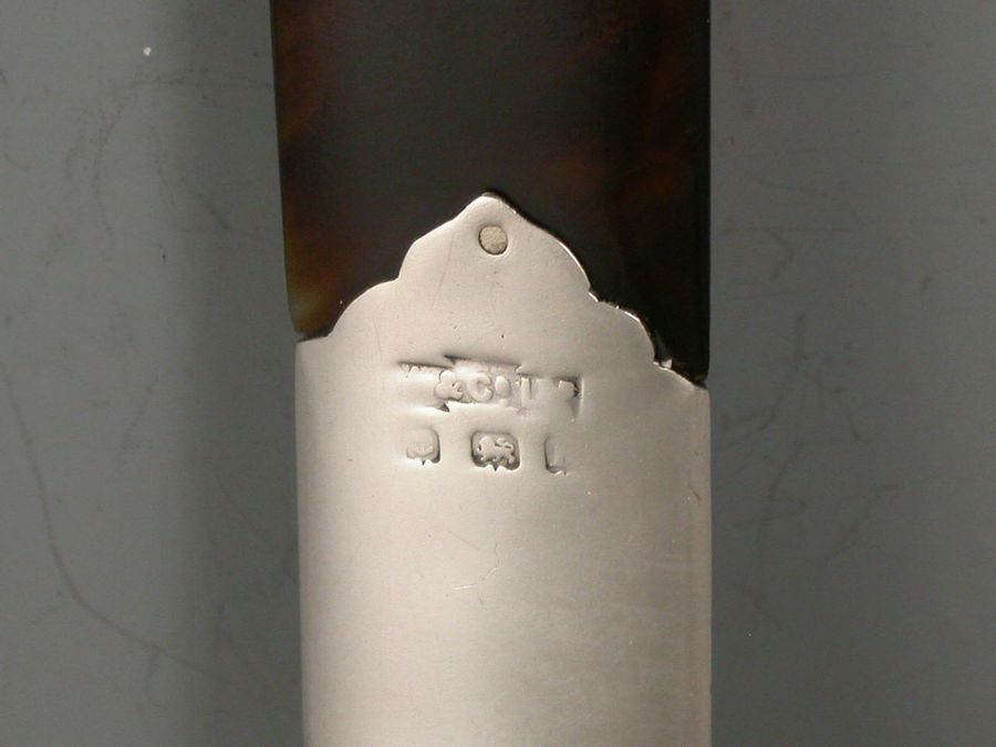A fine quality and large George V silver mounted tortoiseshell Paper Knife/Page Turner/ Perpetual Calendar, the seven sides handle enameled with days and dates in black enamel, Sunday in red. The dates are changed by turning the knurled wheel against a ratchet.