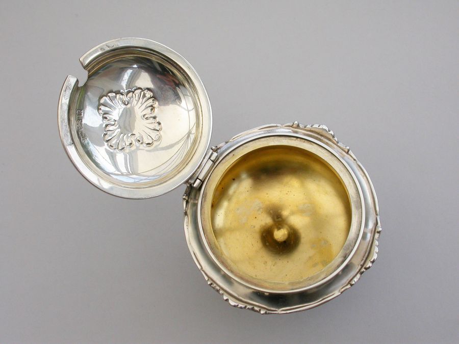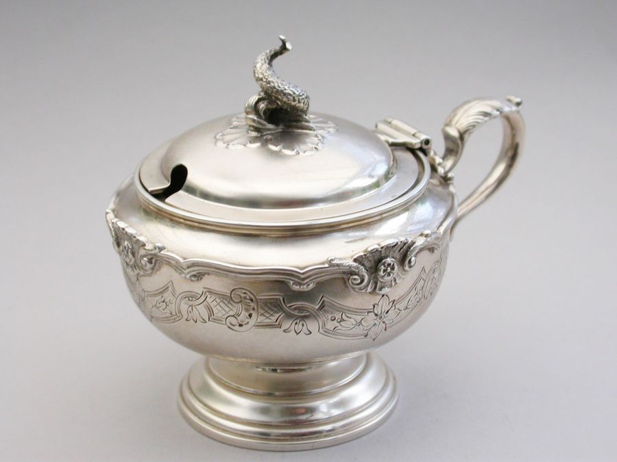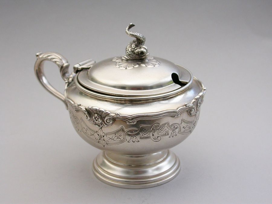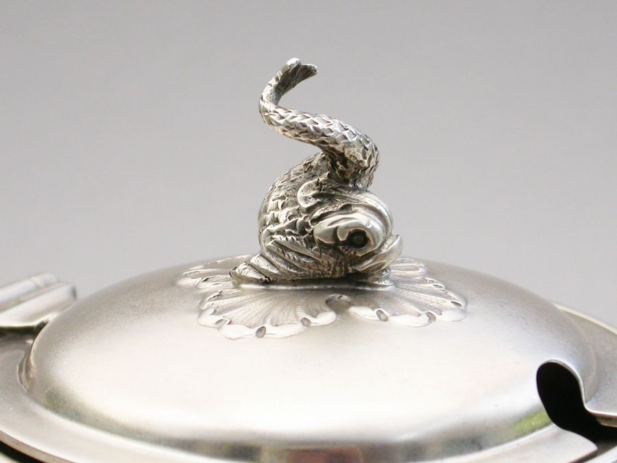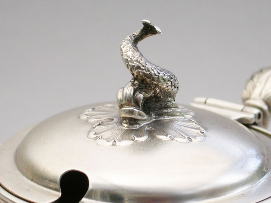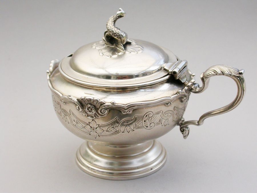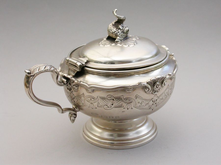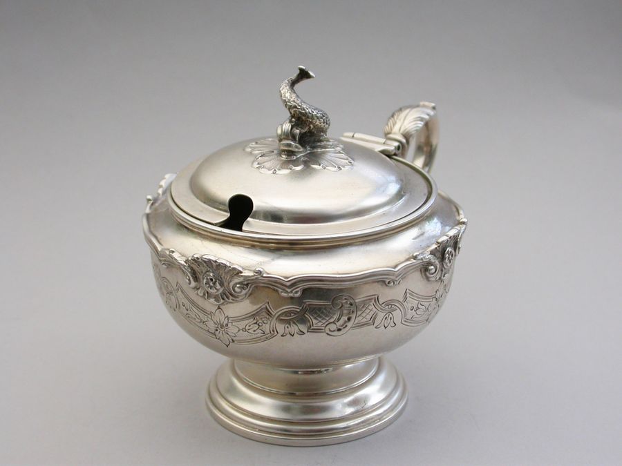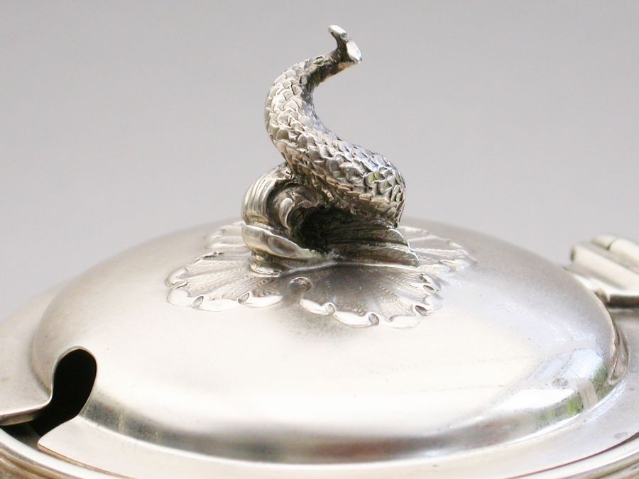 A good quality early 20th century silver Mustard Pot made in the Georgian style, of compressed circular form with leaf capped scroll handle and shaped reeded border decorated with shells, a band of engraved foliate scroll decoration to the body and a cast Dolphin finial to the lid. Silver gilt interior.
