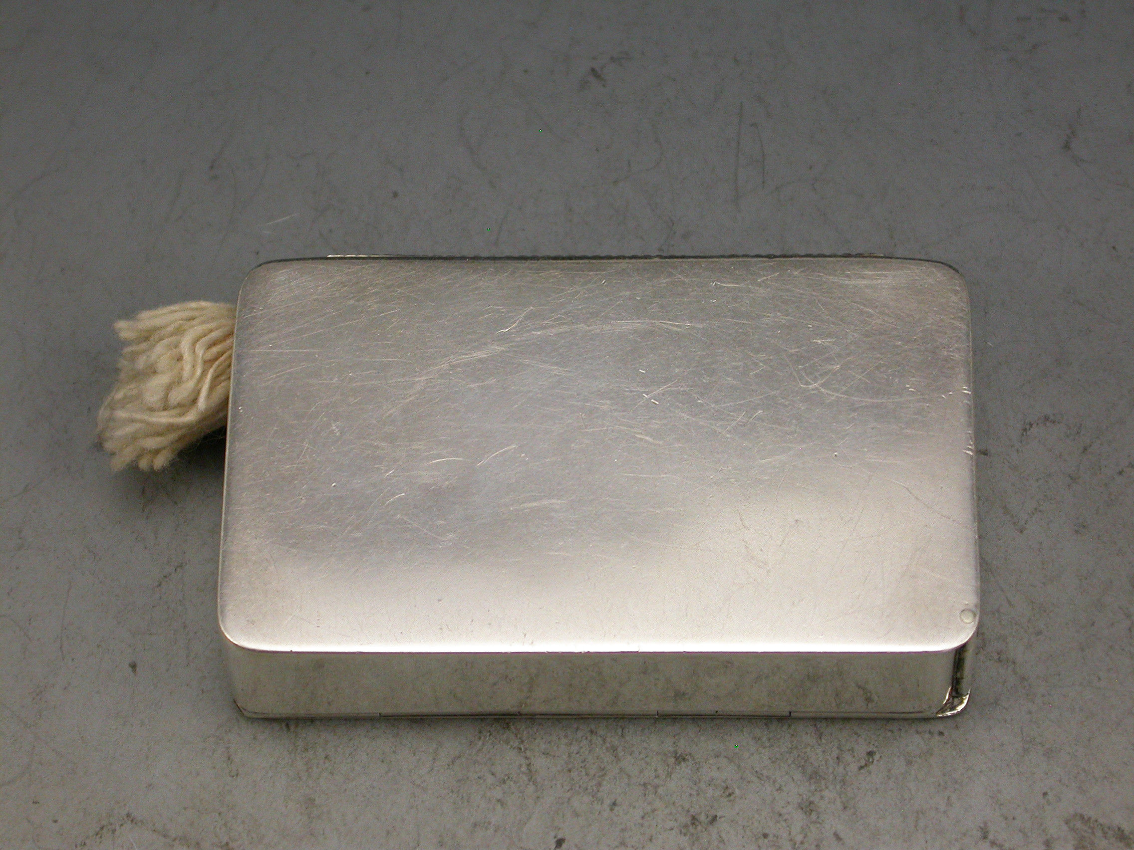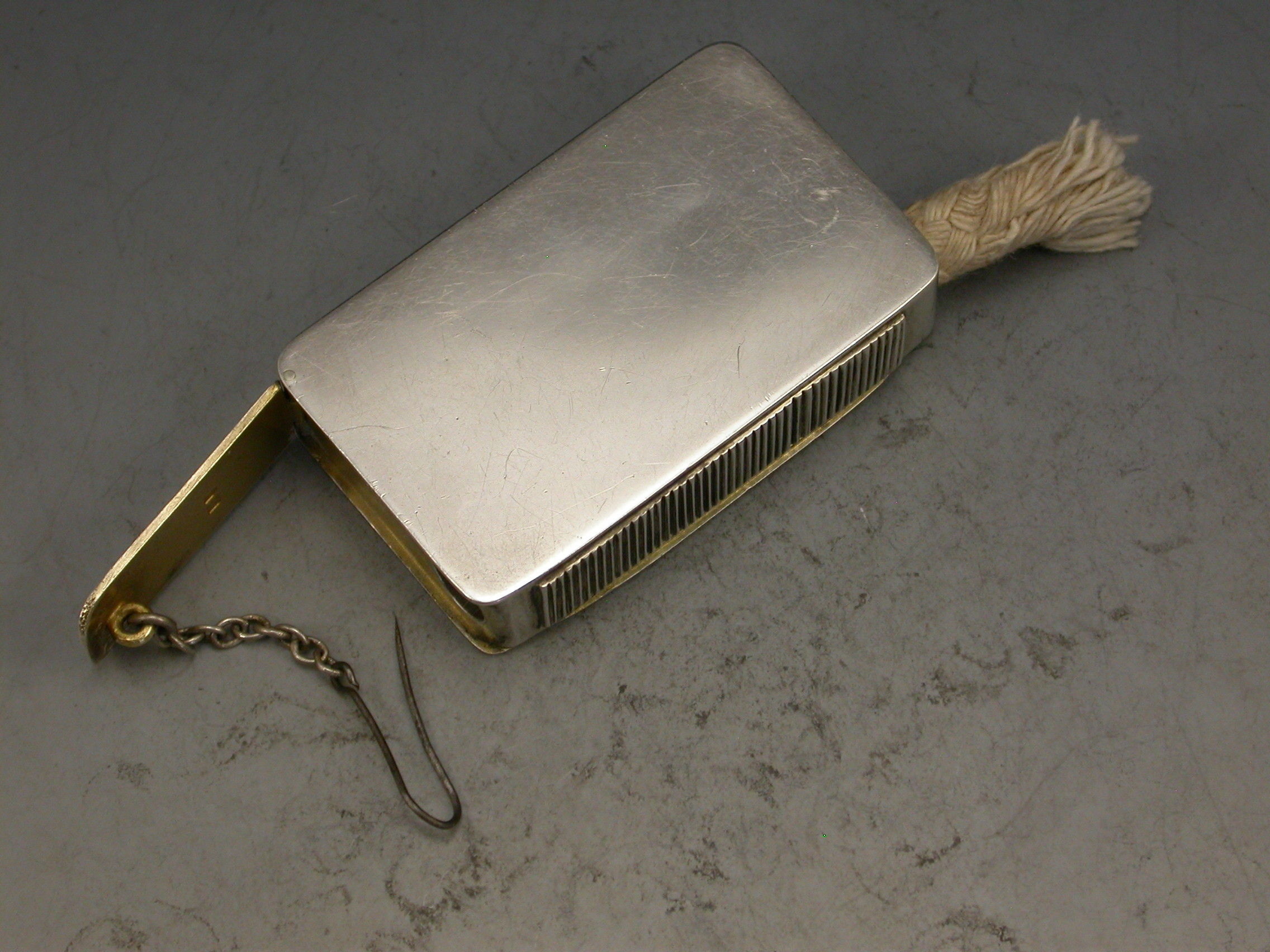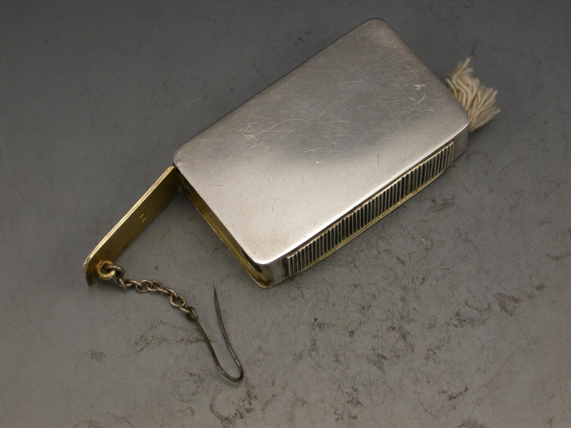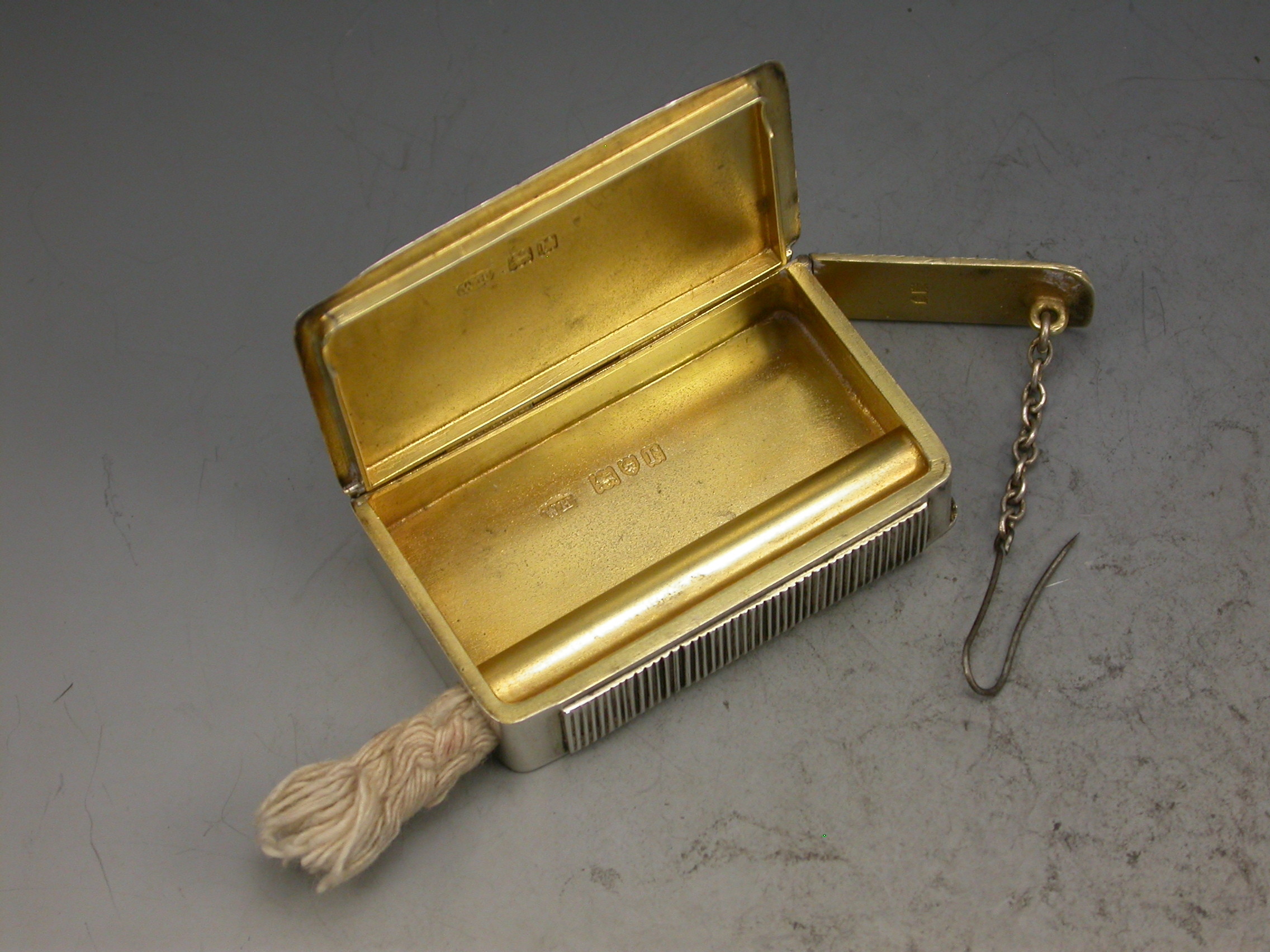 A good quality early 20th century silver Vesta Case of plain rectangular form with hinged lid and silver gilt interior, a tube to one side containing an Alma cord or wick that would be attached to the retaining pin and chain on a separate hinged lid.