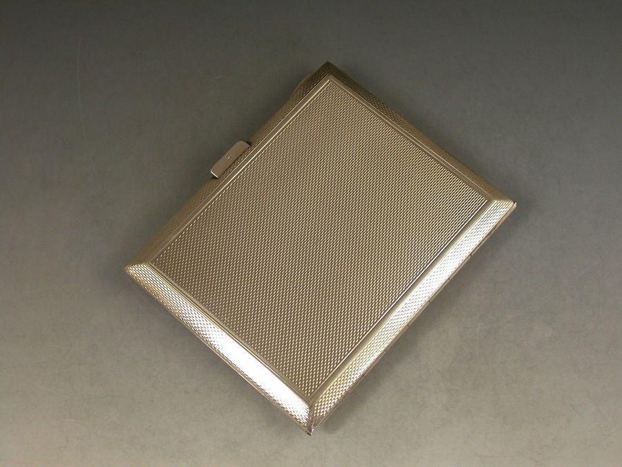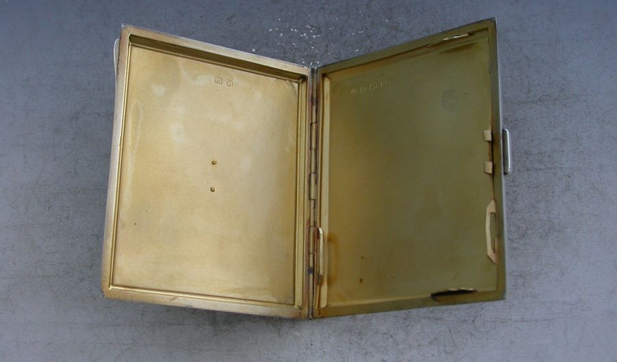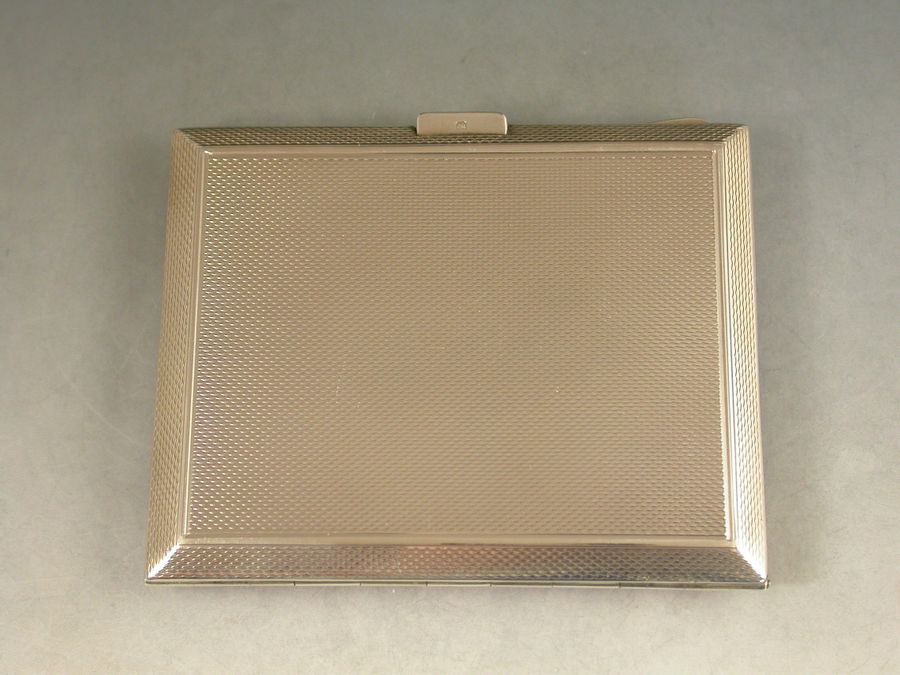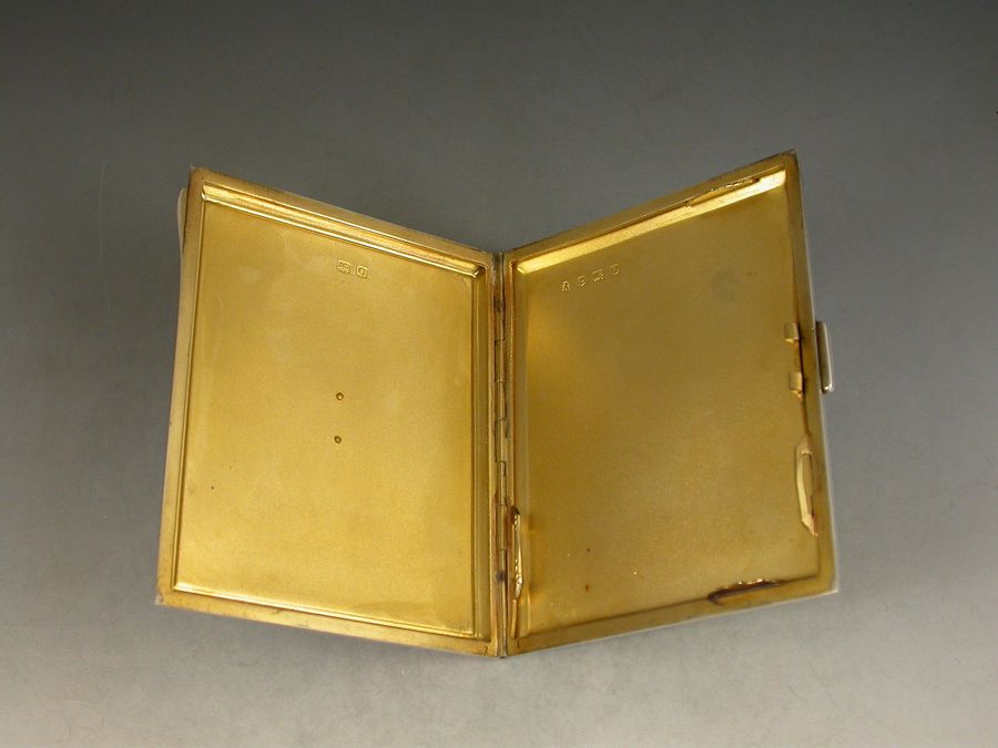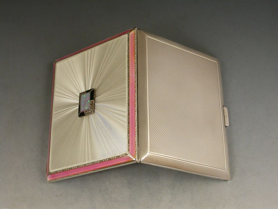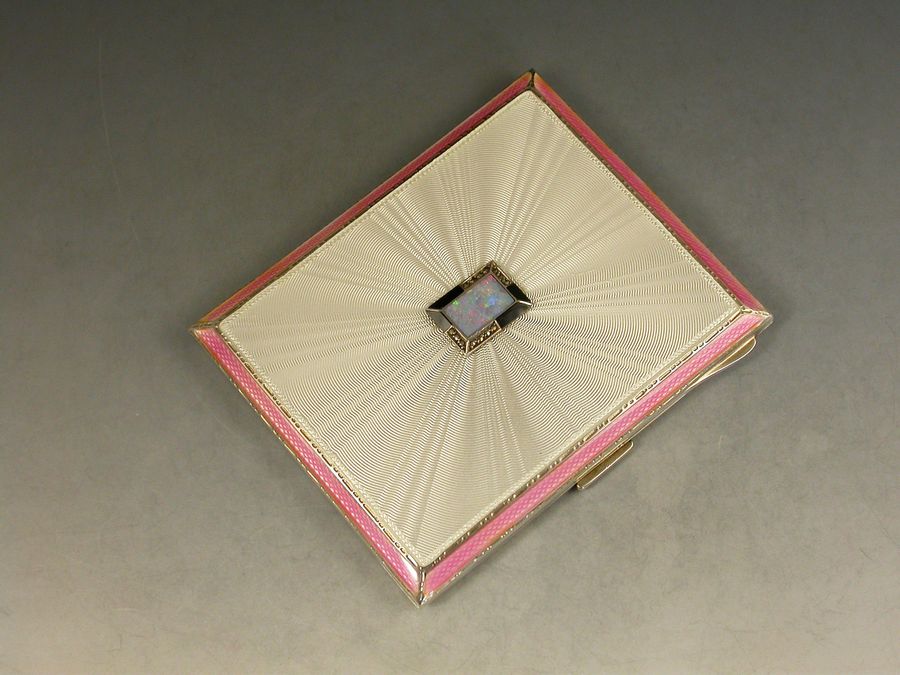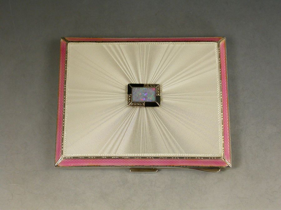 A good quality Art Deco English silver and guilloche enamel Cigarette Case, applied with a rectangular cartouche set with opal and marcasite, the lid with pink enamel border and a white rayed background. Engine turned base and silver gilt interior.
