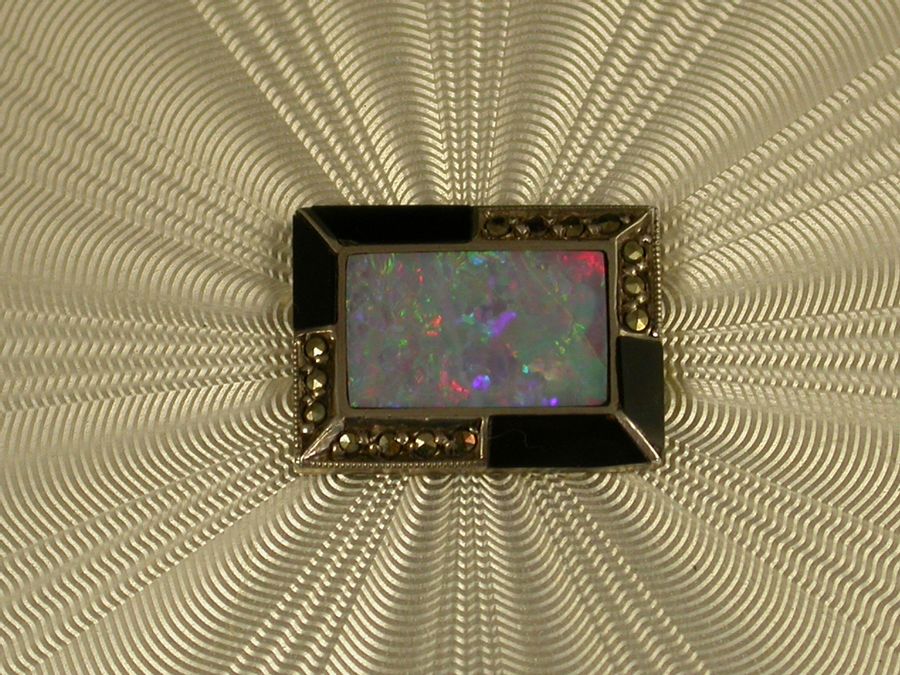 George VI Art Deco Silver Enamel Opal & Marcasite Cigarette Case