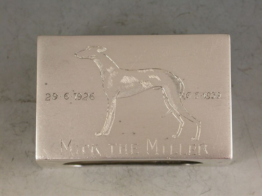 A good quality George VI commemorative silver Matchbox Cover engraved with an image of ""Mick the Miller"", the famous greyhound.