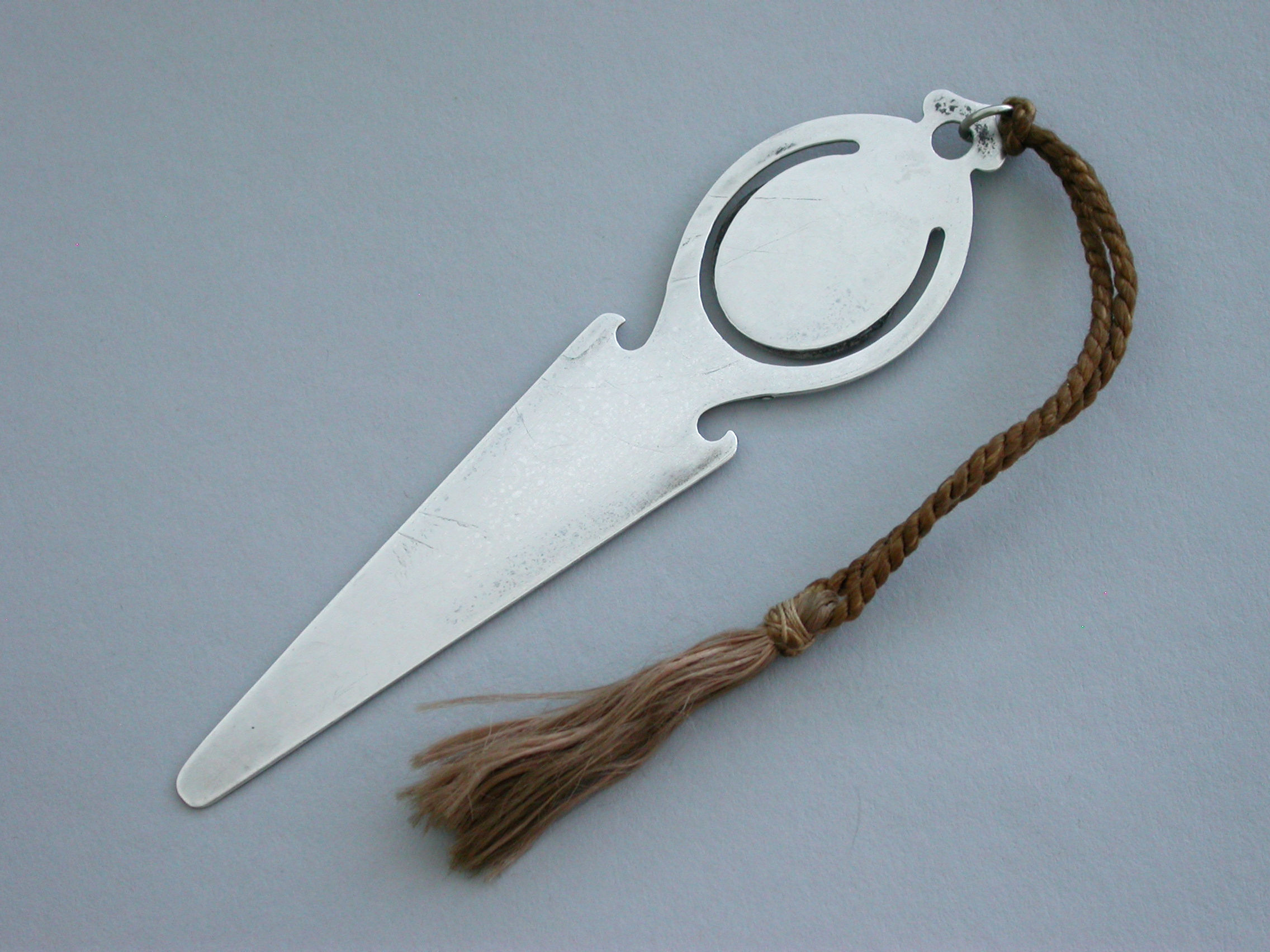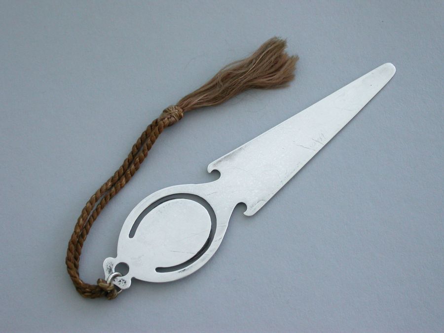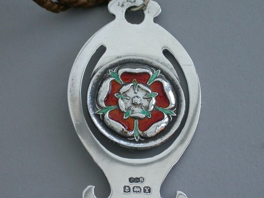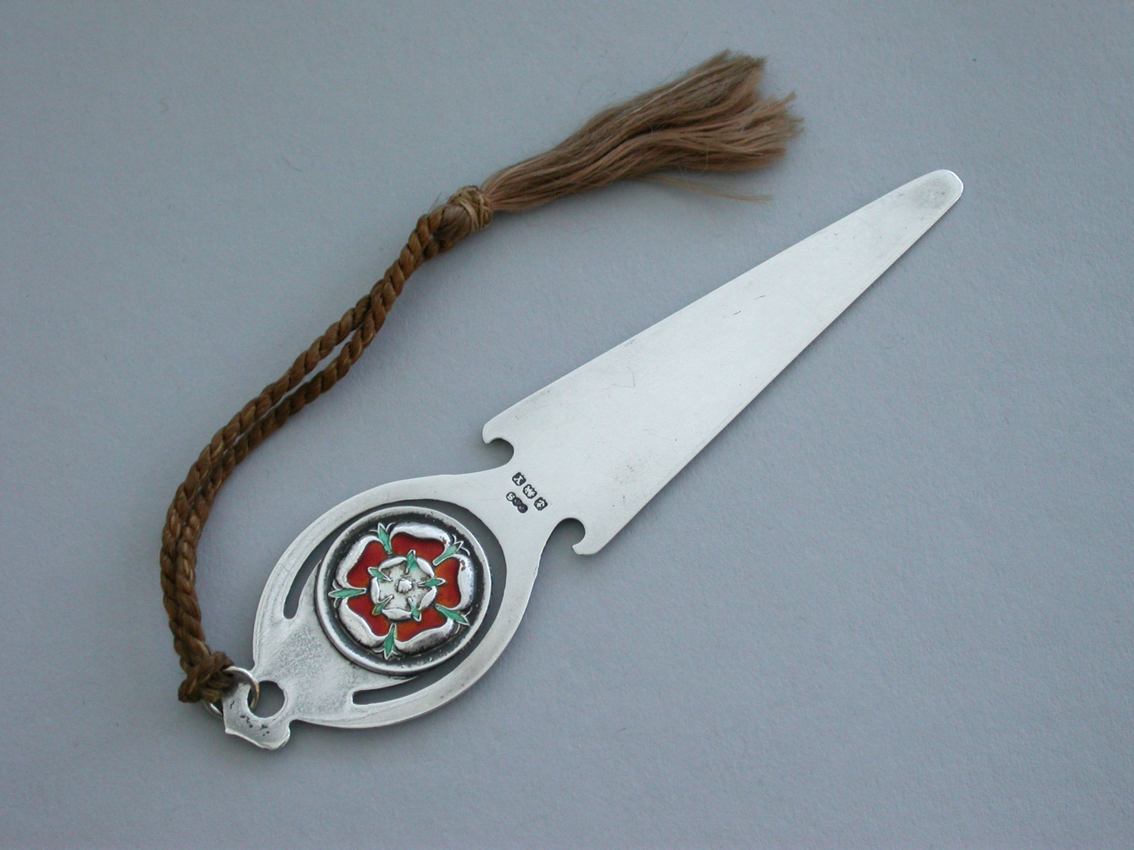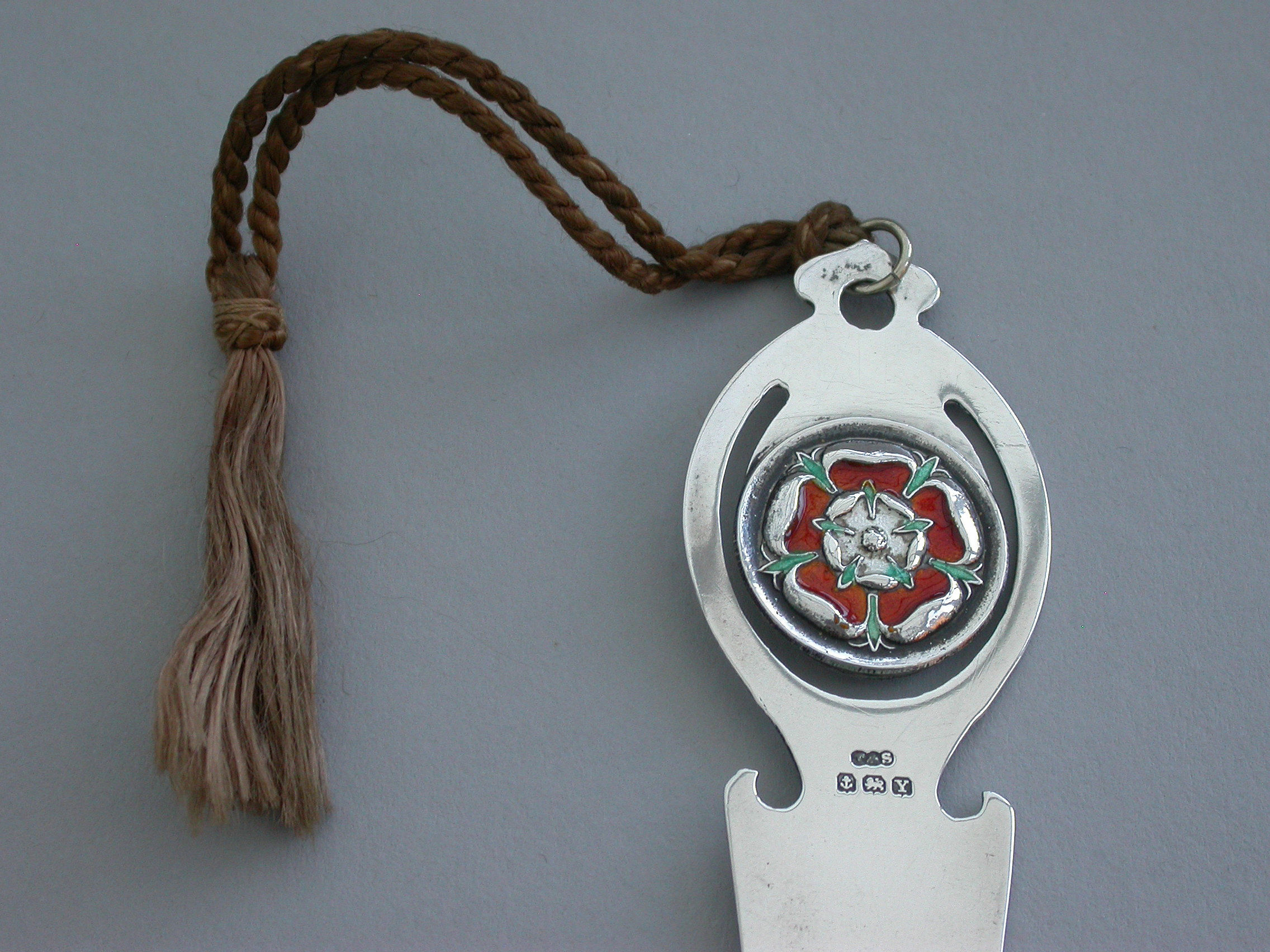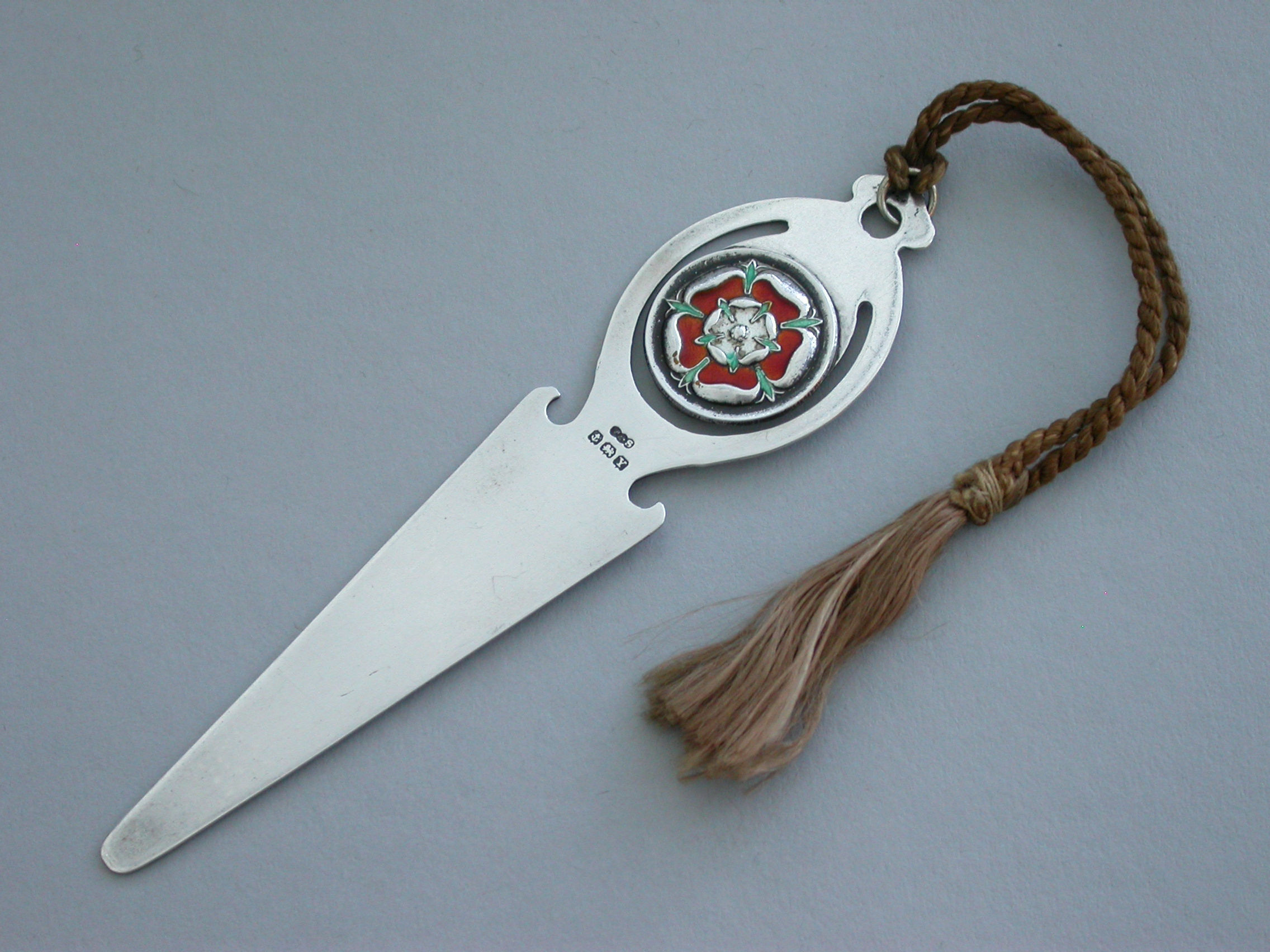 A good quality George VI silver and enamel Bookmark, the pierced terminal decorated with an enamel Tudor Rose for England. Complete with original silk tassel.