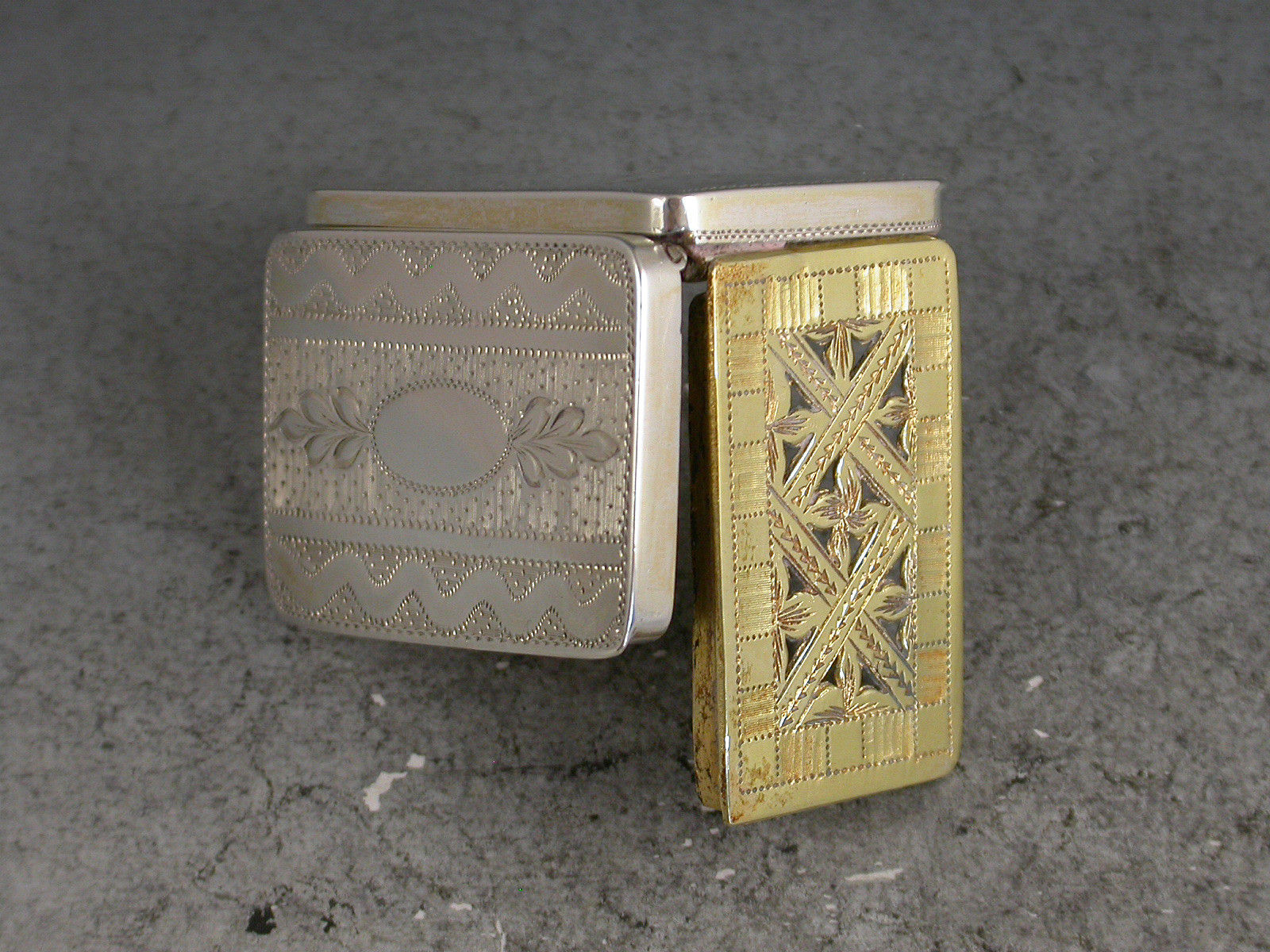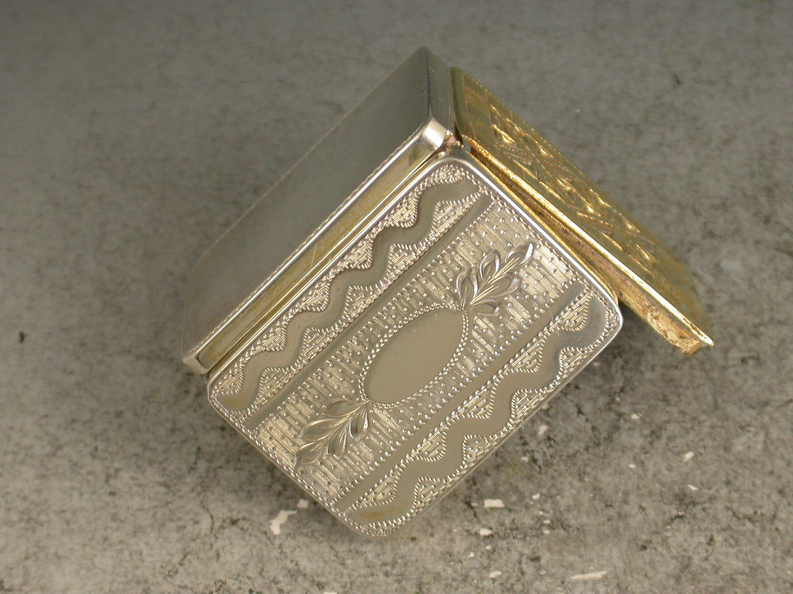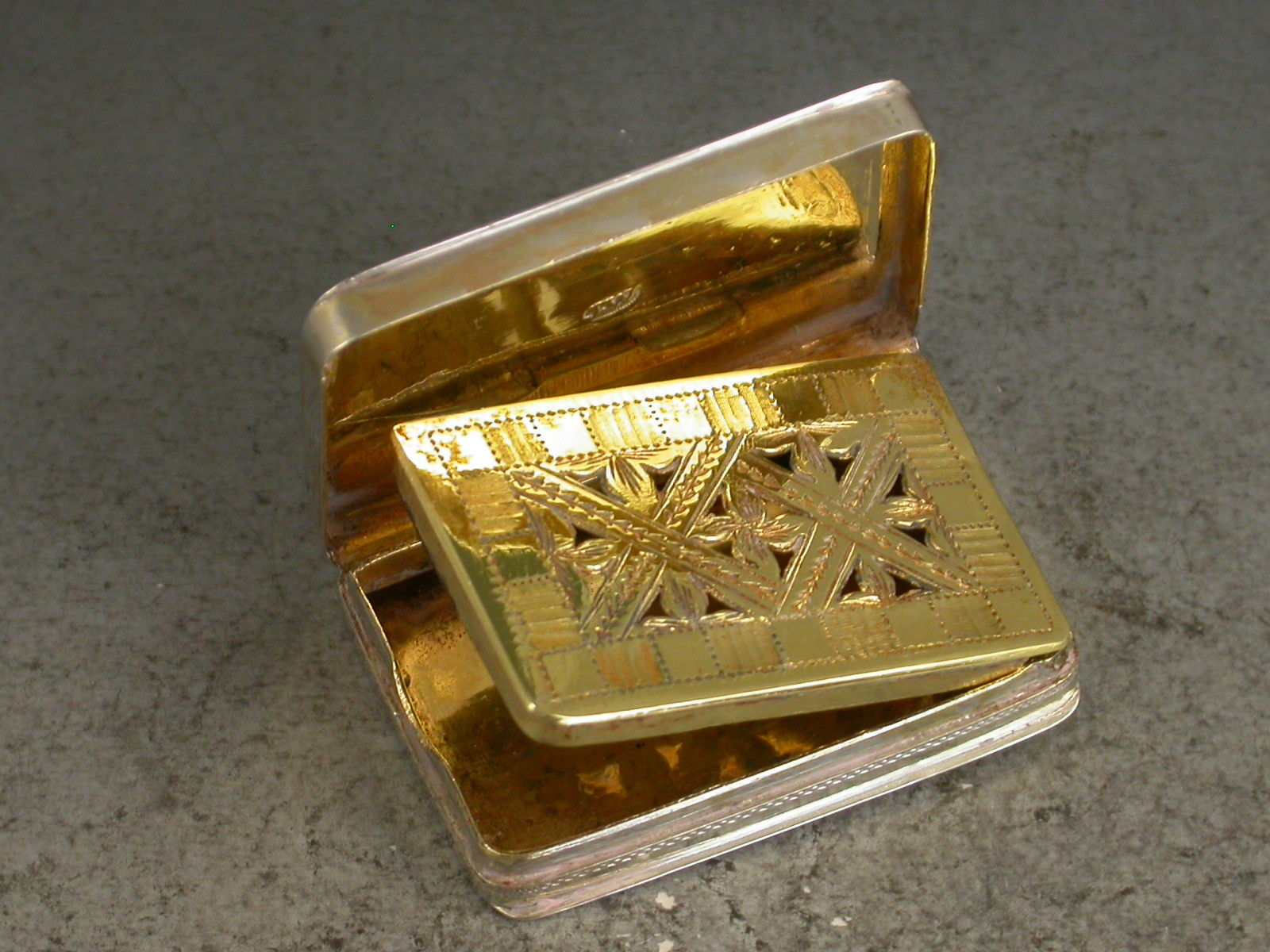 A fine Georgian silver gilt Vinaigrette of rectangular form, the lid with bright-cut and prick-dot engraved decoration, the interior with unusual pierced trelliswork grille.