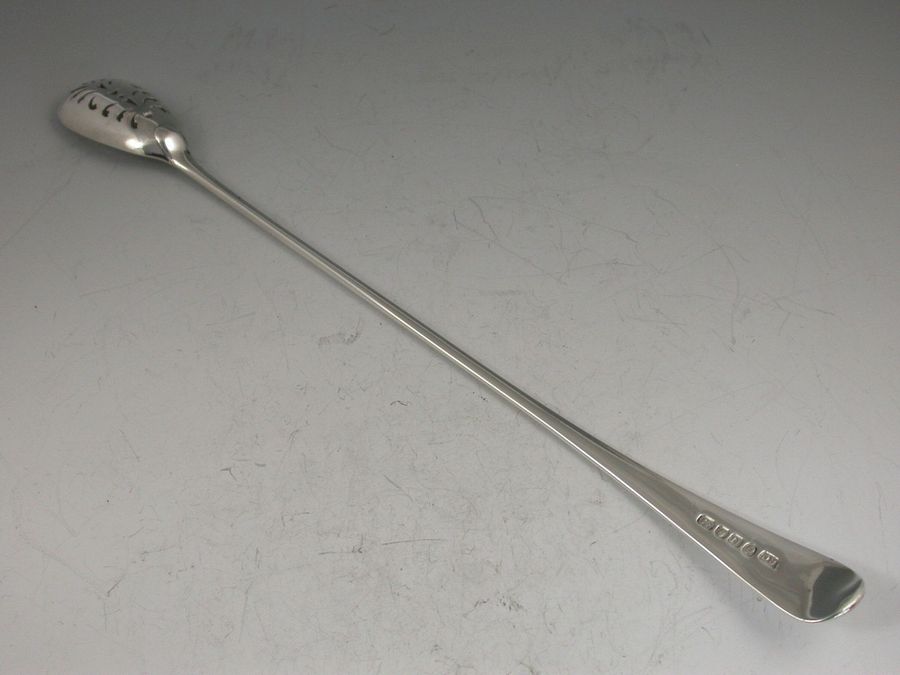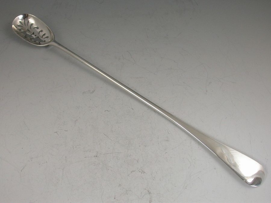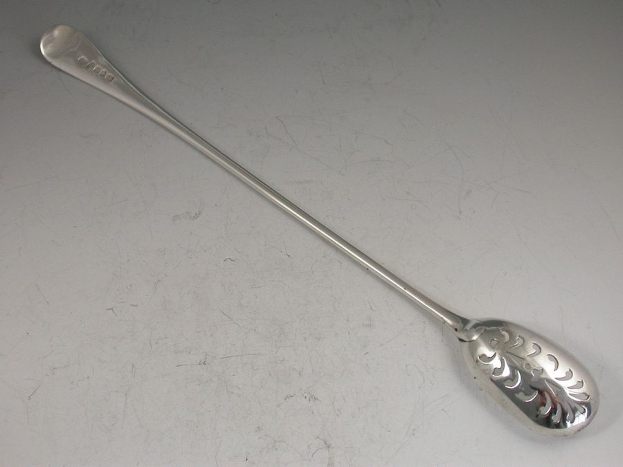 An unusual Georgian silver Spoon of unknown use (possibly for olives) with long plain Old English handle and pierced oval bowl similar to a Mote Spoon in design.