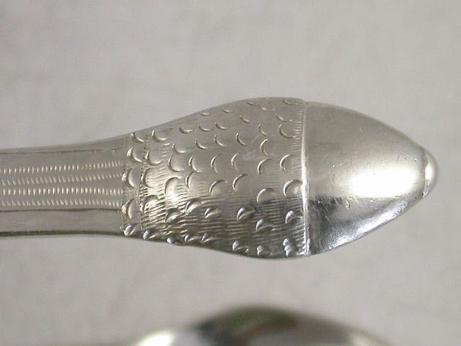 A good pair of George III 18th century silver Sugar Tongs with flared Old English type handles and acorn bowls, bright-cut engraved decoration to the arms and an oval cartouche to the bow engraved with the letter J.