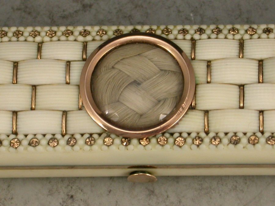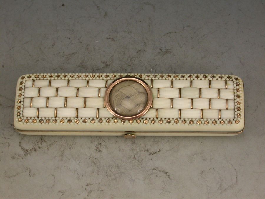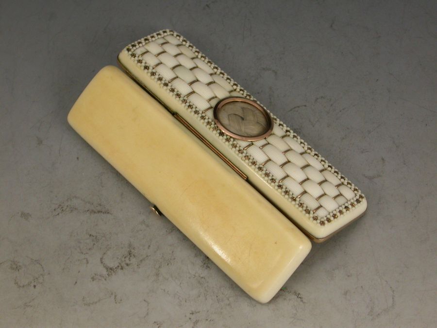 A very fine quality early 19th century English carved ivory gold mounted Toothpick Case of rounded rectangular form, the lid set with a basket weave inlay of ivory. Each section is carved individually giving very good definition, and held by gold bars within the framework of the lid border. The border of the lid is finely carved and inset with gold flower heads. The centre has a panel of plaited hair under glass within a gold frame. The lid base is gold mounted and the case has its original mirror and lining.