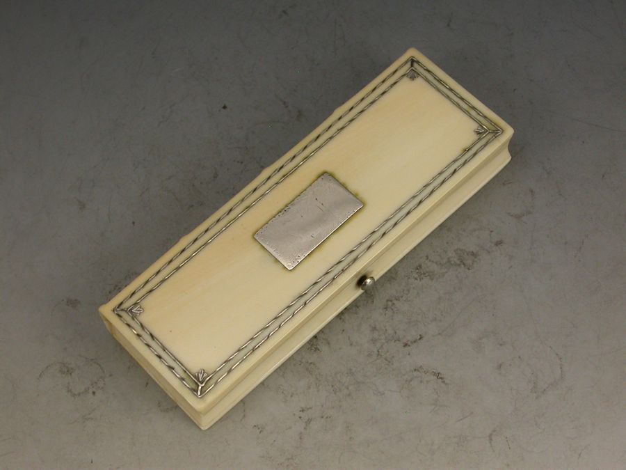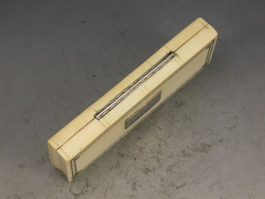 A good Georgian English ivory Toothpick Case made in the form of a book with carved spine to resemble book binding. A double line of silver stringing to the border of the lid and a central rectangular silver plaque. Velvet lined interior with mirror to the lid.