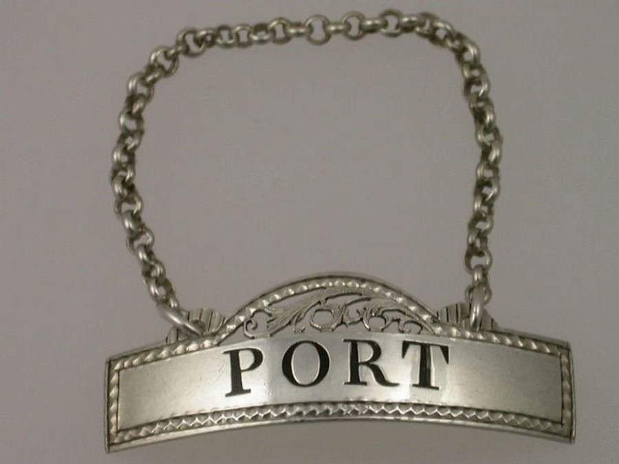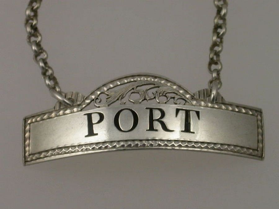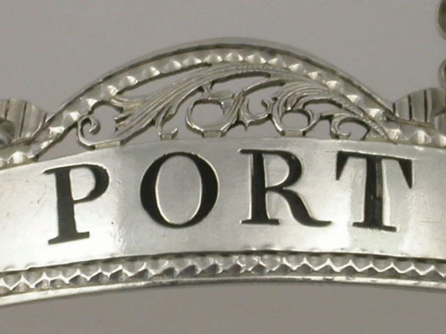 A very fine George III 18th century silver Wine Label of Fret Domed rectangular form with crisp bright-cut engraved border and raised eyelets, incised and niello filled for PORT.