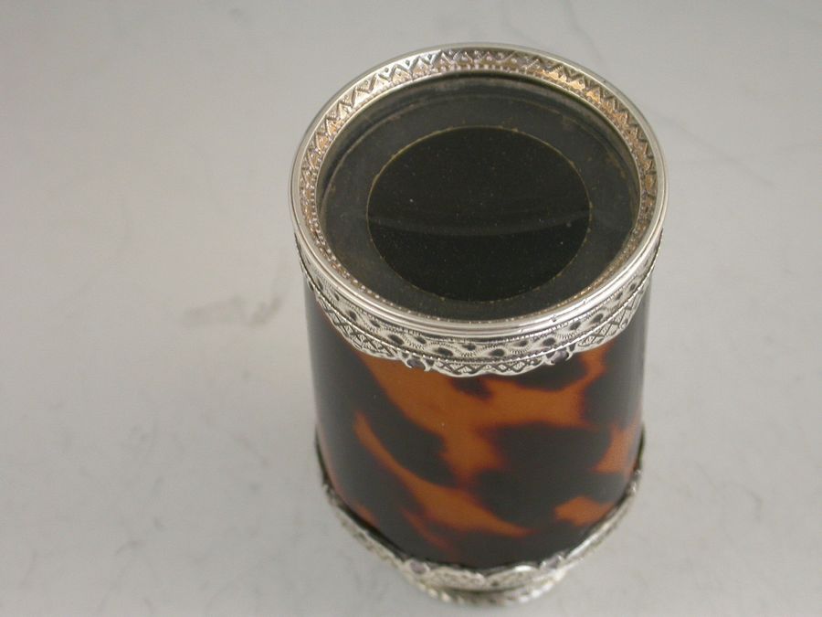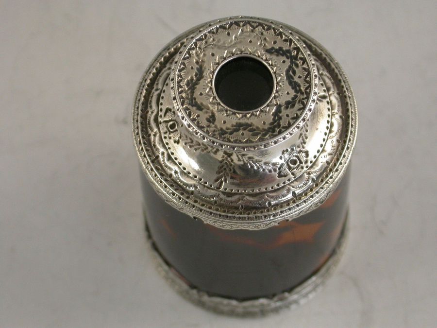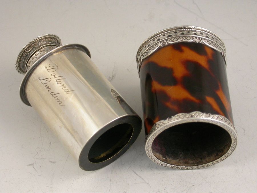 A good Georgian silver mounted two piece Monocular with tortoiseshell body and bright cut engraved decoration, the barrel engraved Dollond, London.