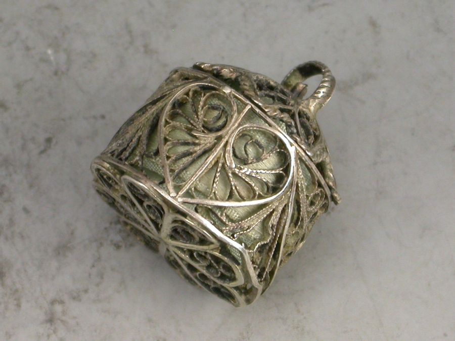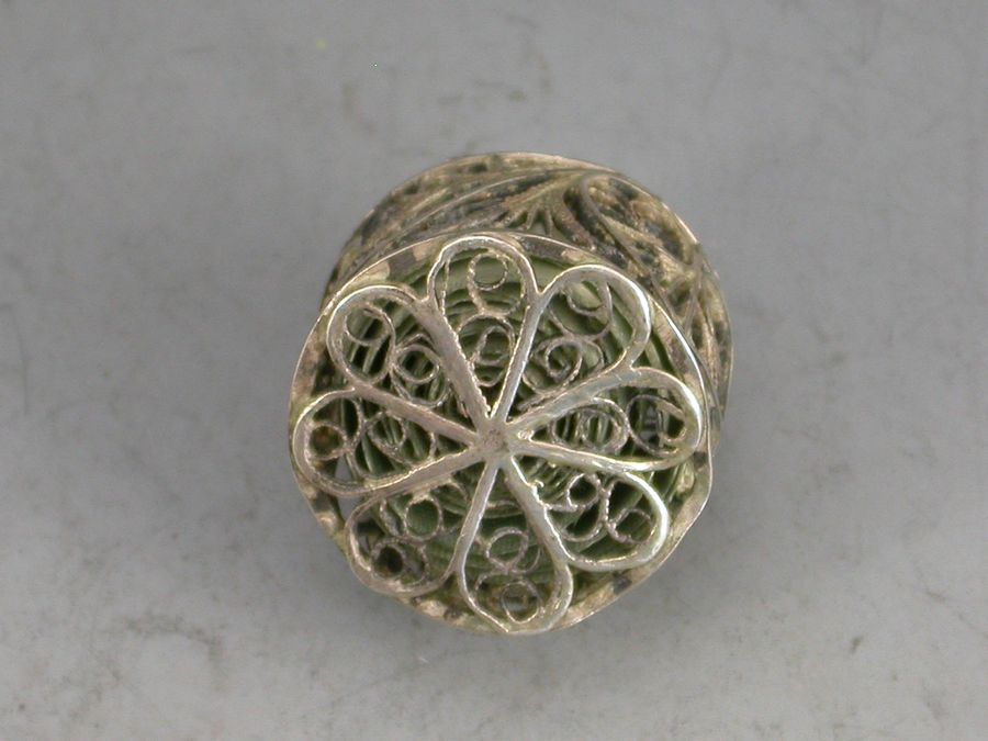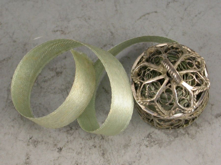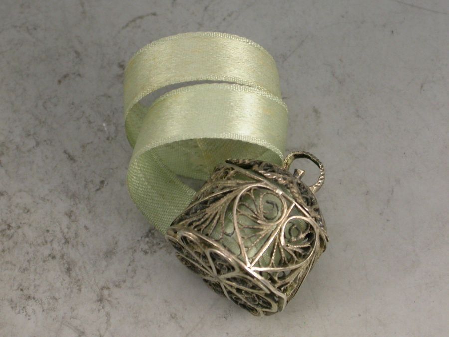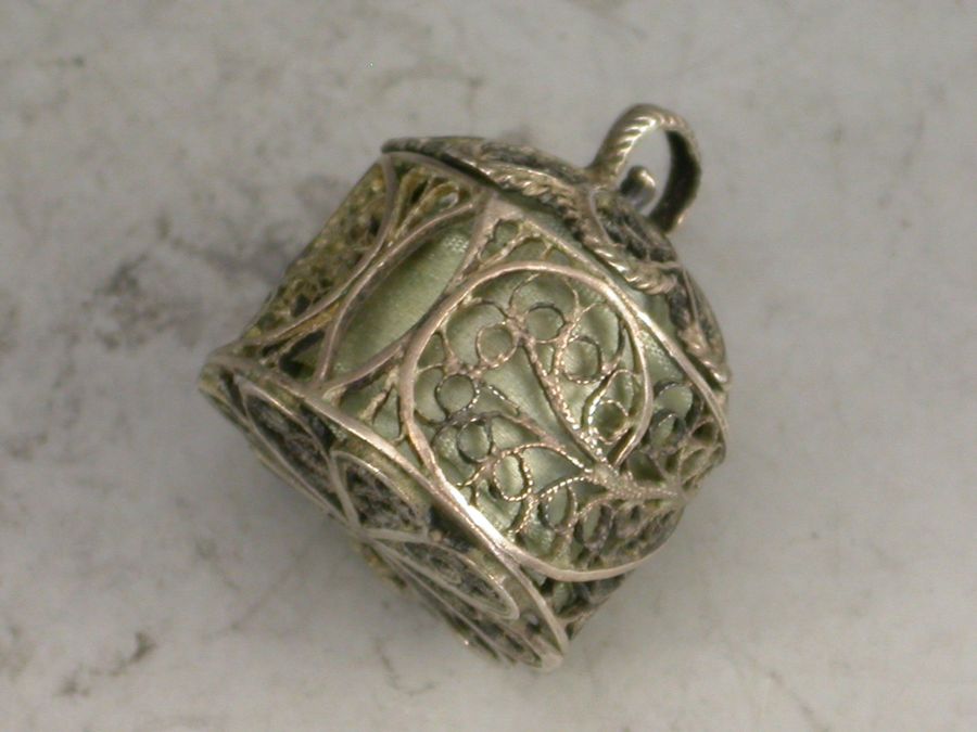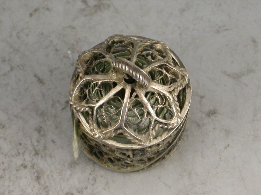 A Georgian pierced silver filigree Tape Measure of domed cylindrical form with attached suspension ring and silk tape.