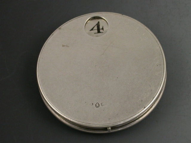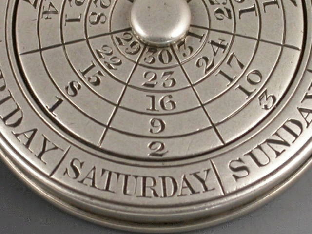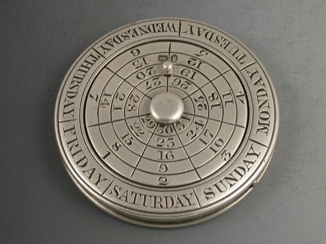 An extremely rare George IV silver Pocket Perpetual Calendar, of circular disc form with reeded borders. The face engraved and niello filled with the days of the week and the dates 1-31 on a sprung movable and lockable dial to facilitate setting the day to the date at the start of the month. A second movable internal dial numbered 1-10 with an aperture to the reverse.