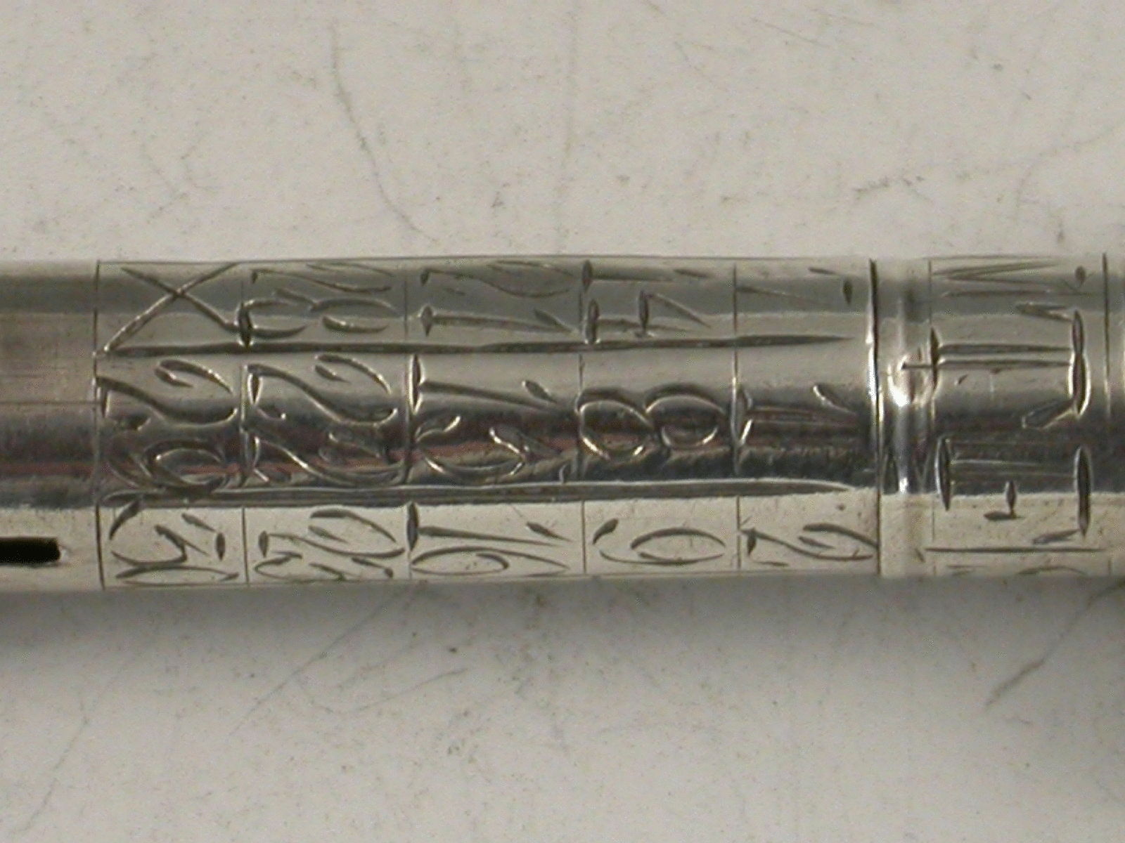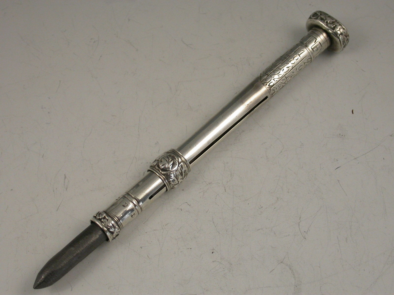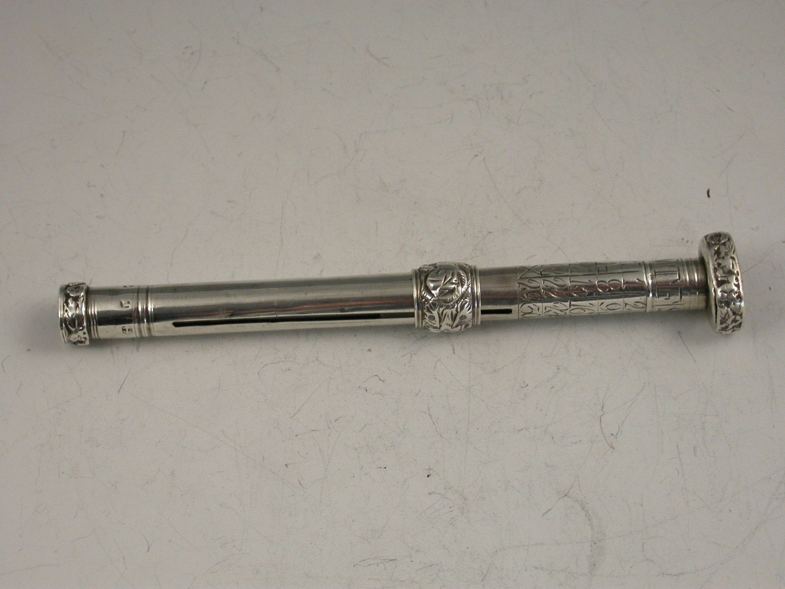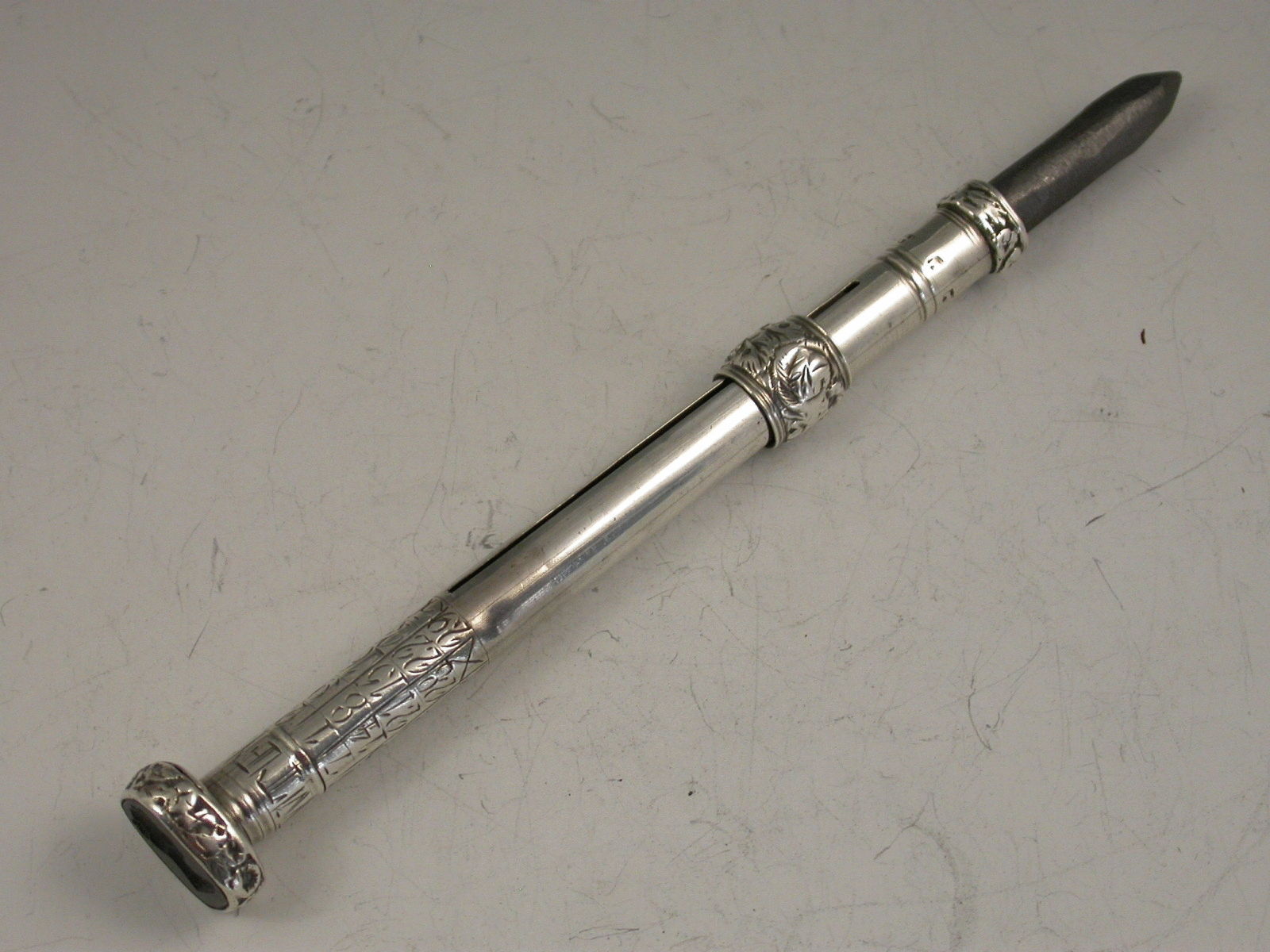 A rare Georgian silver Porte Crayon with integral Perpetual Calendar, the days of the week engraved on a moveable collar which is held in place by the screw off Seal cap. Unusual black agate Seal engraved with a ‘classical’ lady’s head. Repousse decorated sliding ring.
