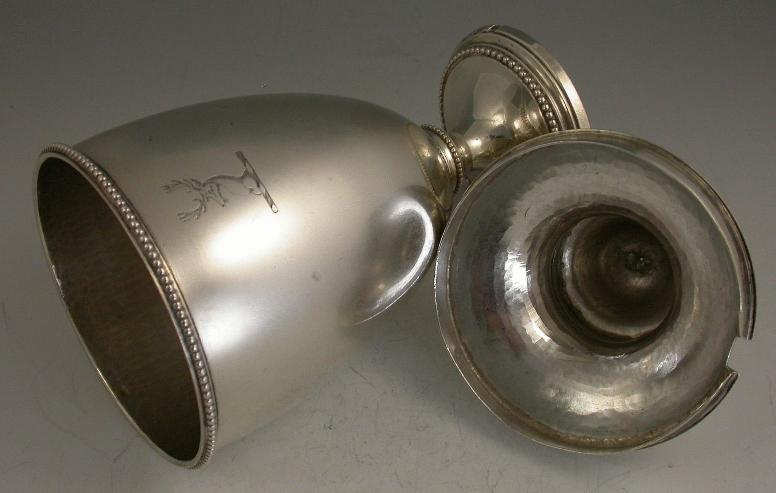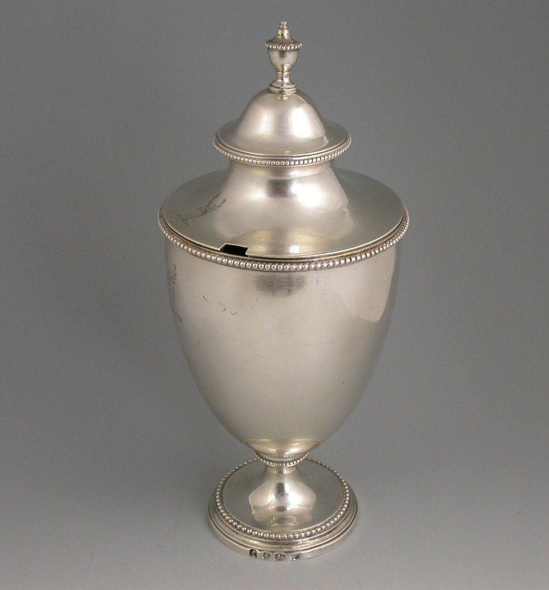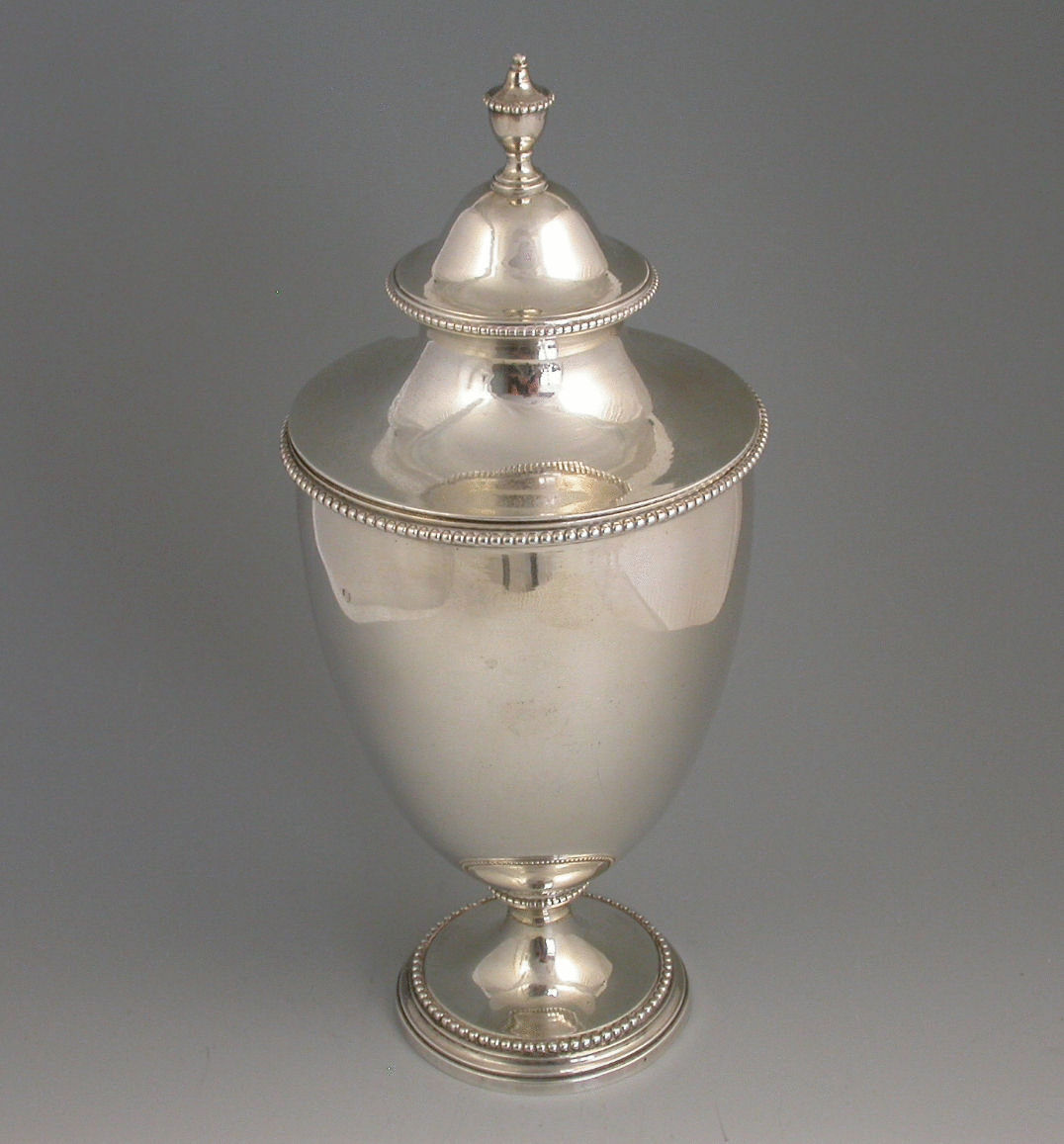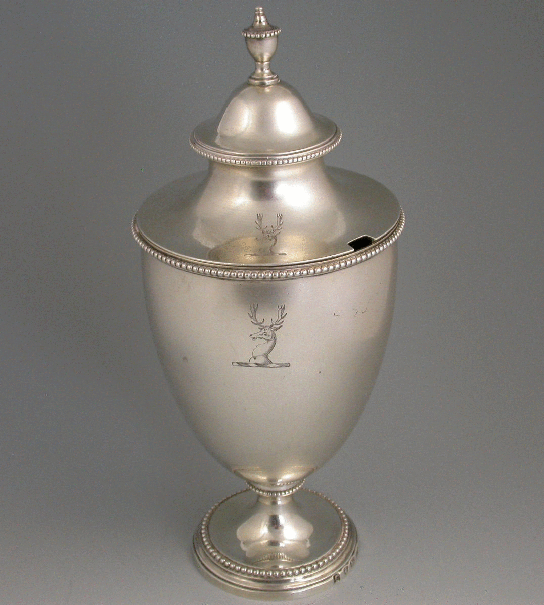 A fine George III silver Sugar Vase and Cover of plain urn shape with beaded rims and urn shaped finial, standing on pedestal foot, both body and cover engraved with a stags head crest.