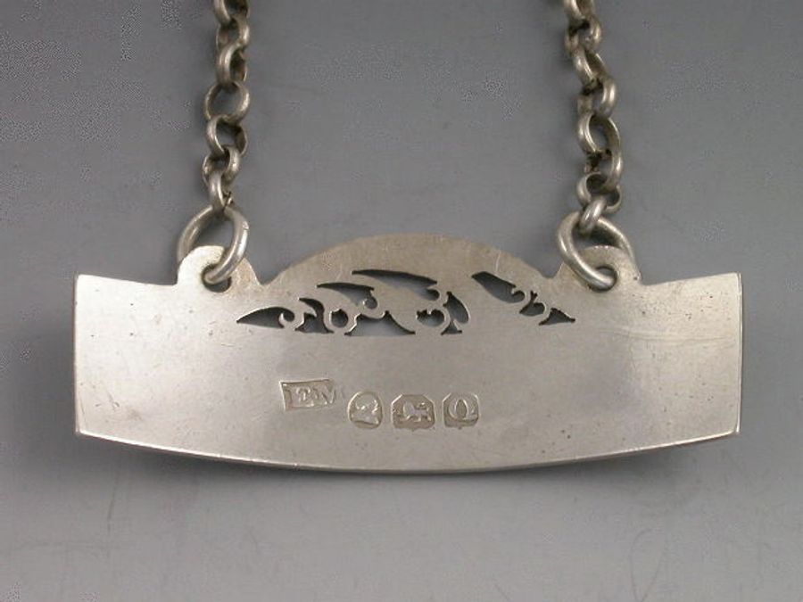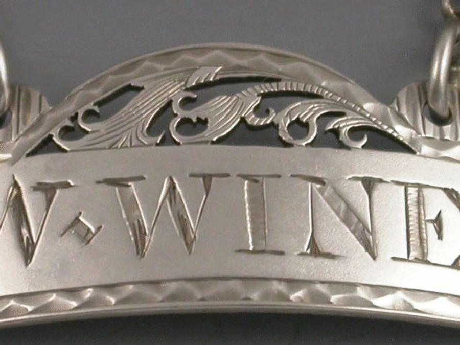 A fine George III silver Wine Label of fret domed rectangular form with bright cut engraved feather edge border and raised eyelets, the dome pierced with scroll work, incised for W * WINE.