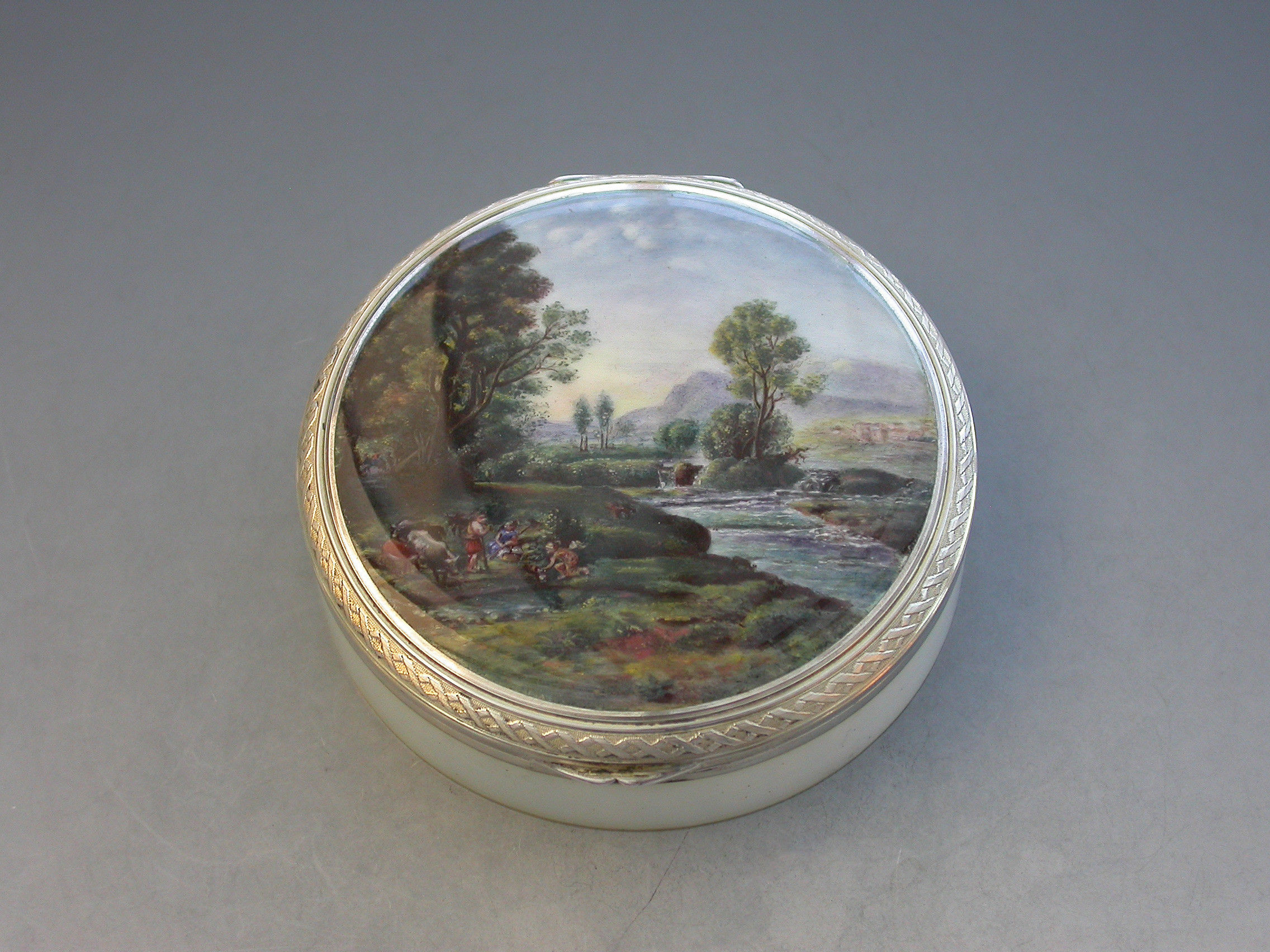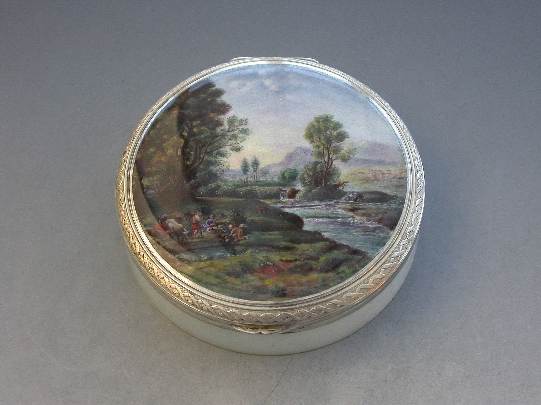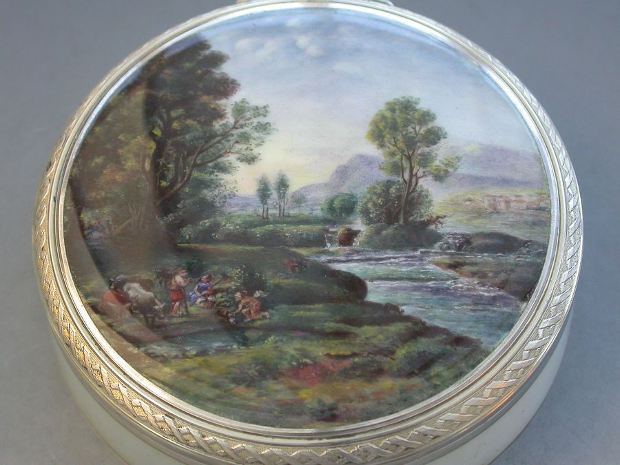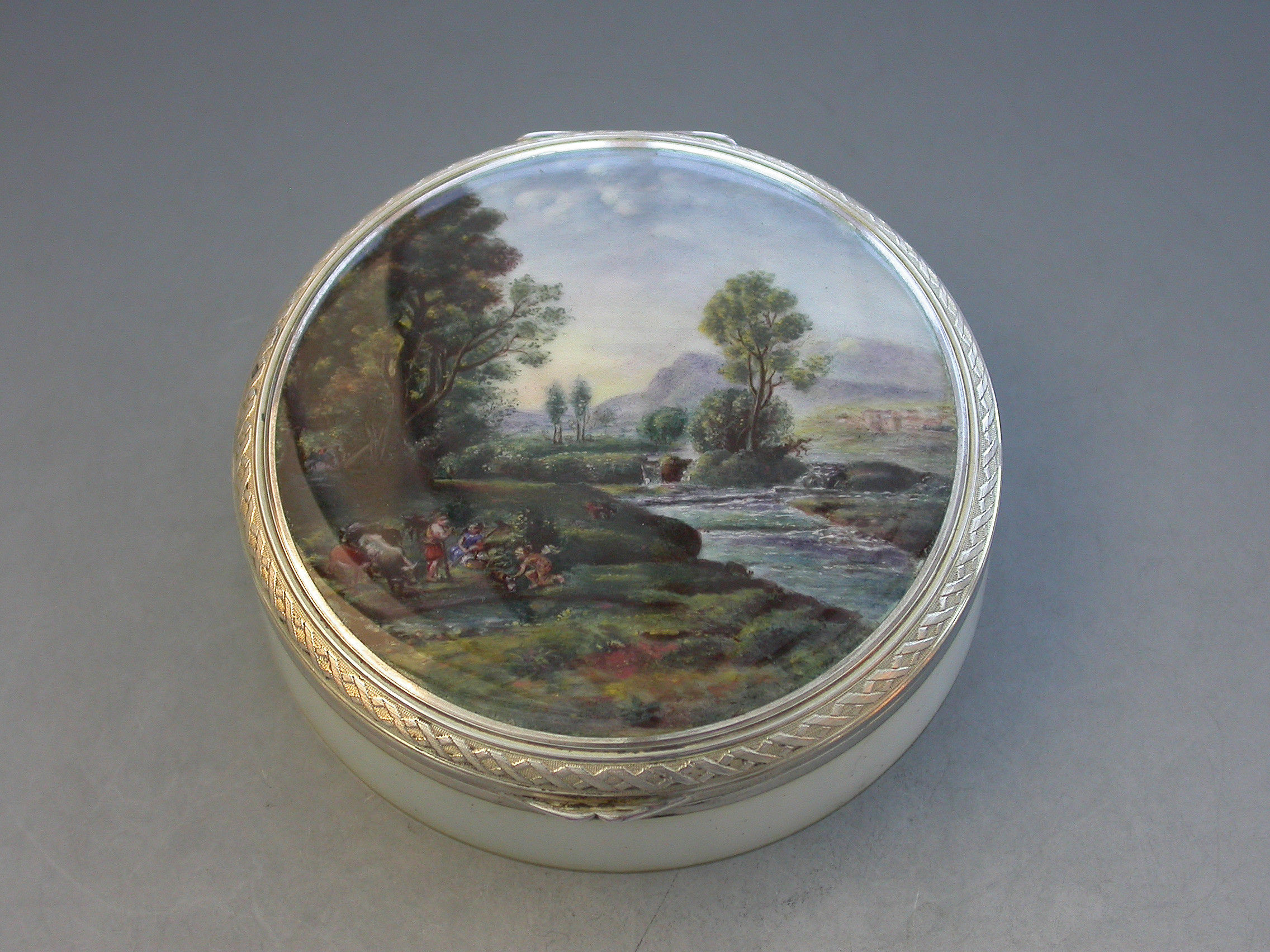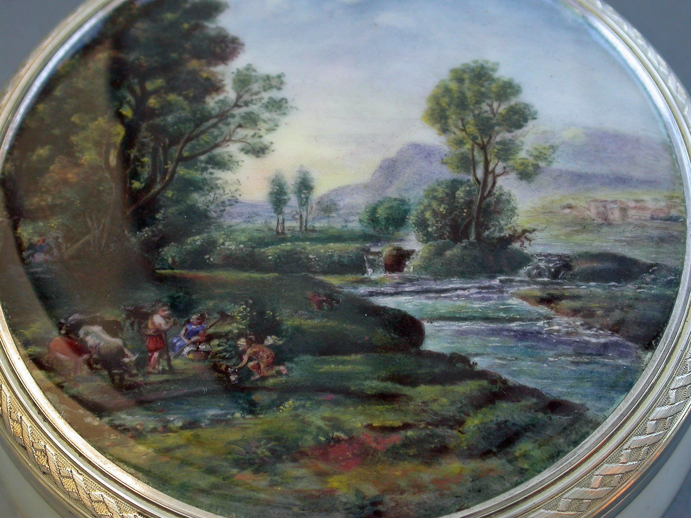 A fine quality early 20th century German silver and enamel hinged circular box with white guilloche enamel sides, a slightly domed lid with inset painted enamel panel depicting a pastoral scene with children and cattle beside a river in a wooded landscape scene. Silver gilt interior.