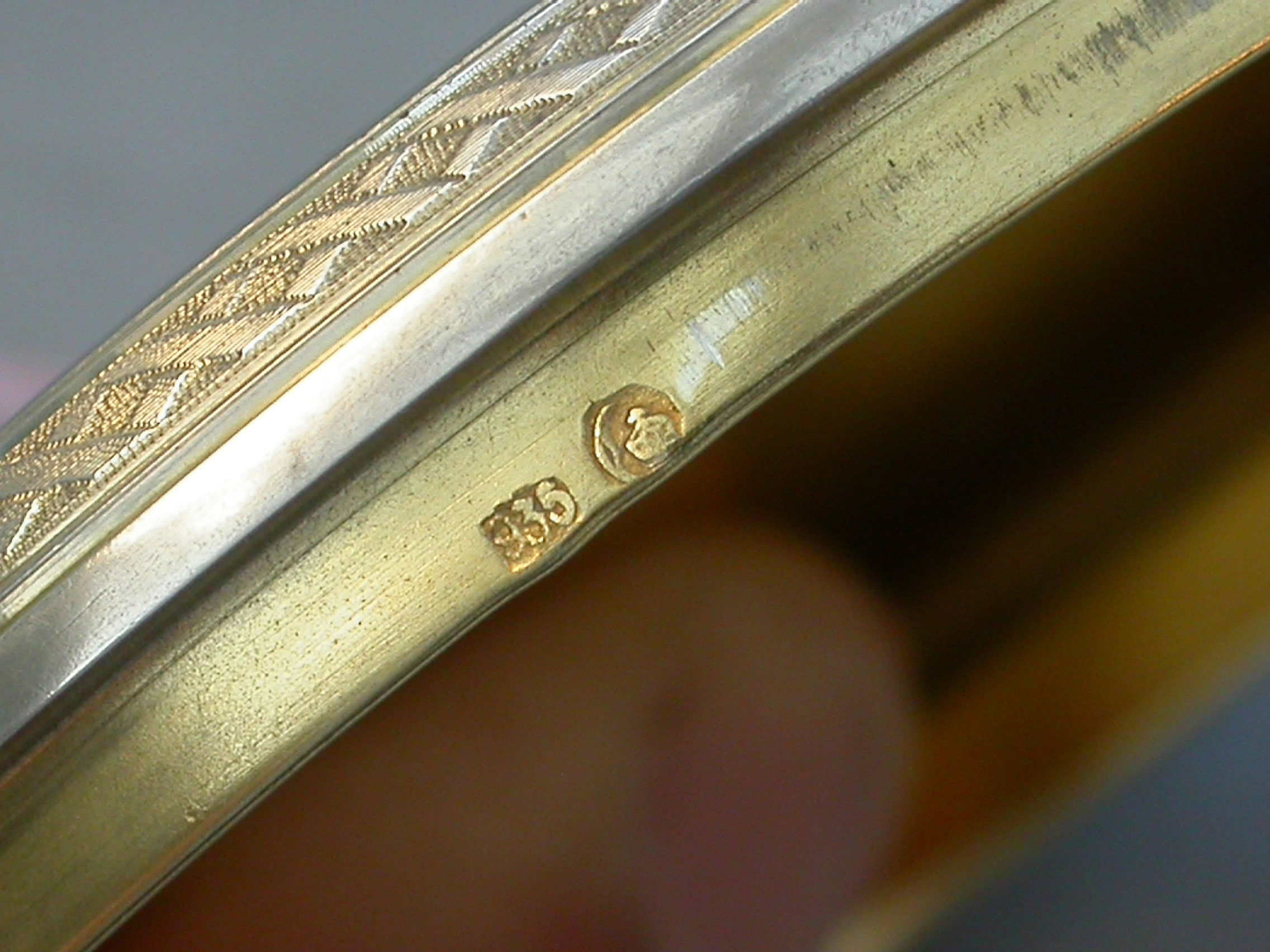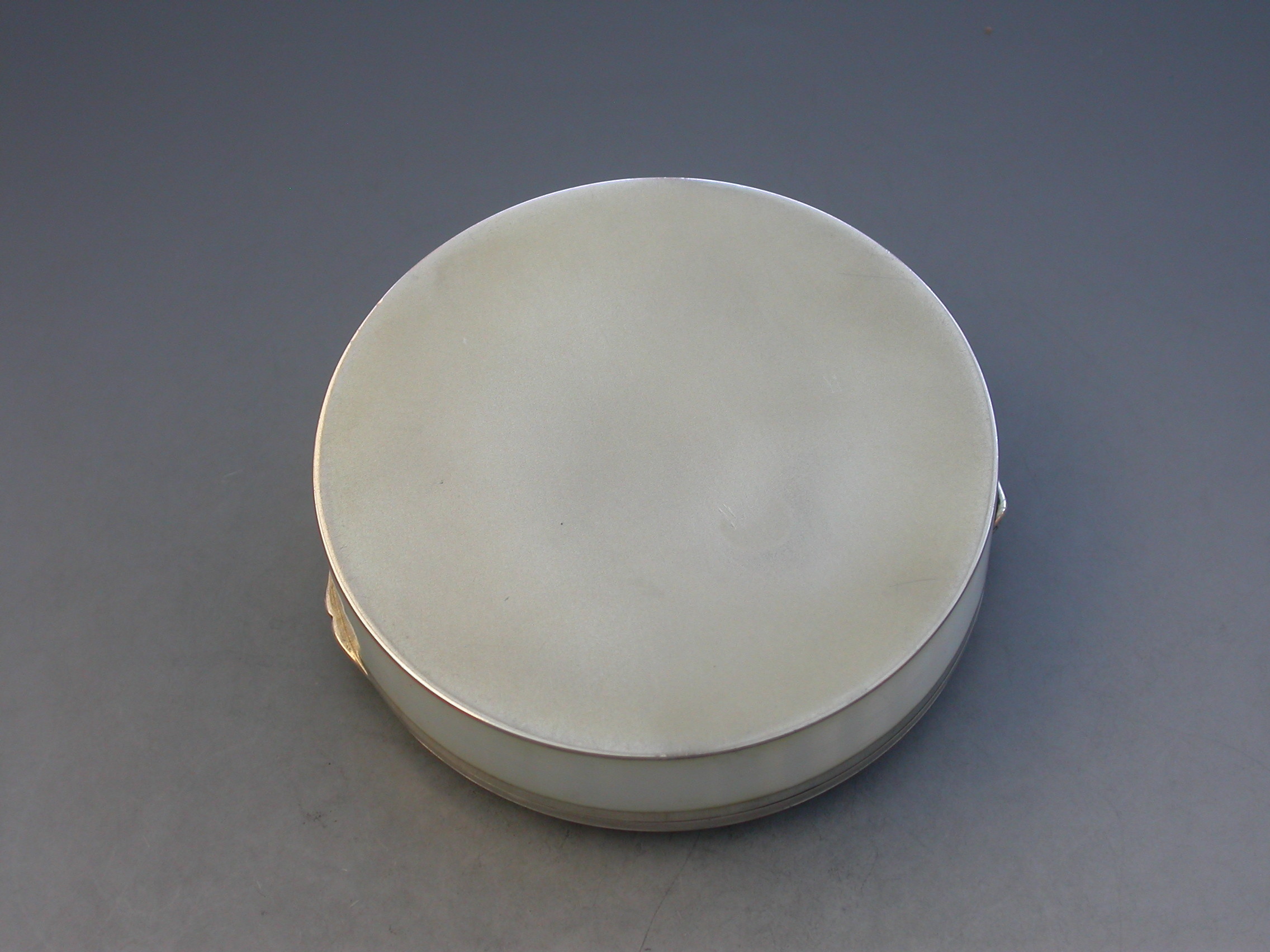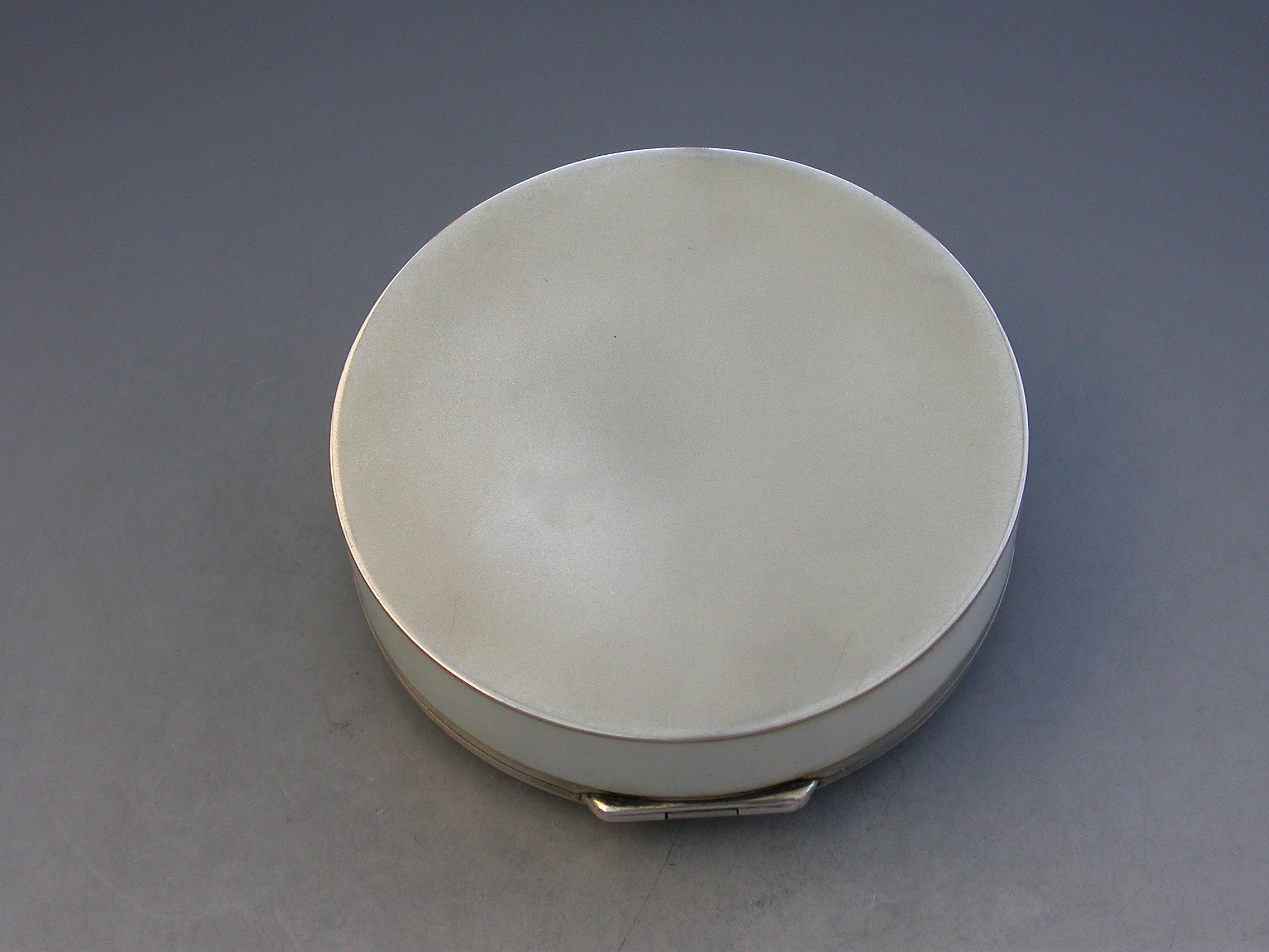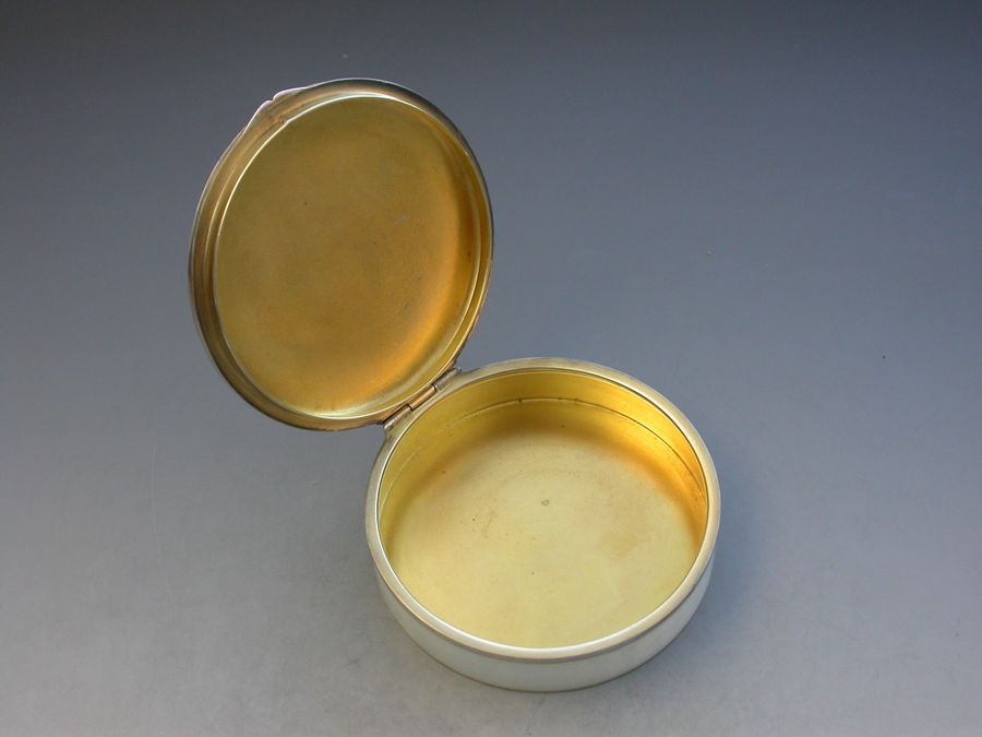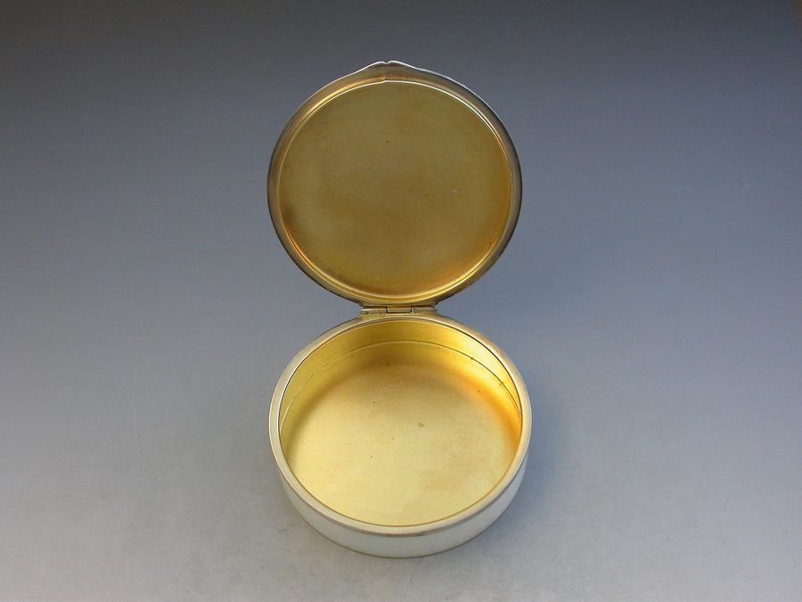 A fine quality early 20th century German silver and enamel hinged circular box with white guilloche enamel sides, a slightly domed lid with inset painted enamel panel depicting a pastoral scene with children and cattle beside a river in a wooded landscape scene. Silver gilt interior.