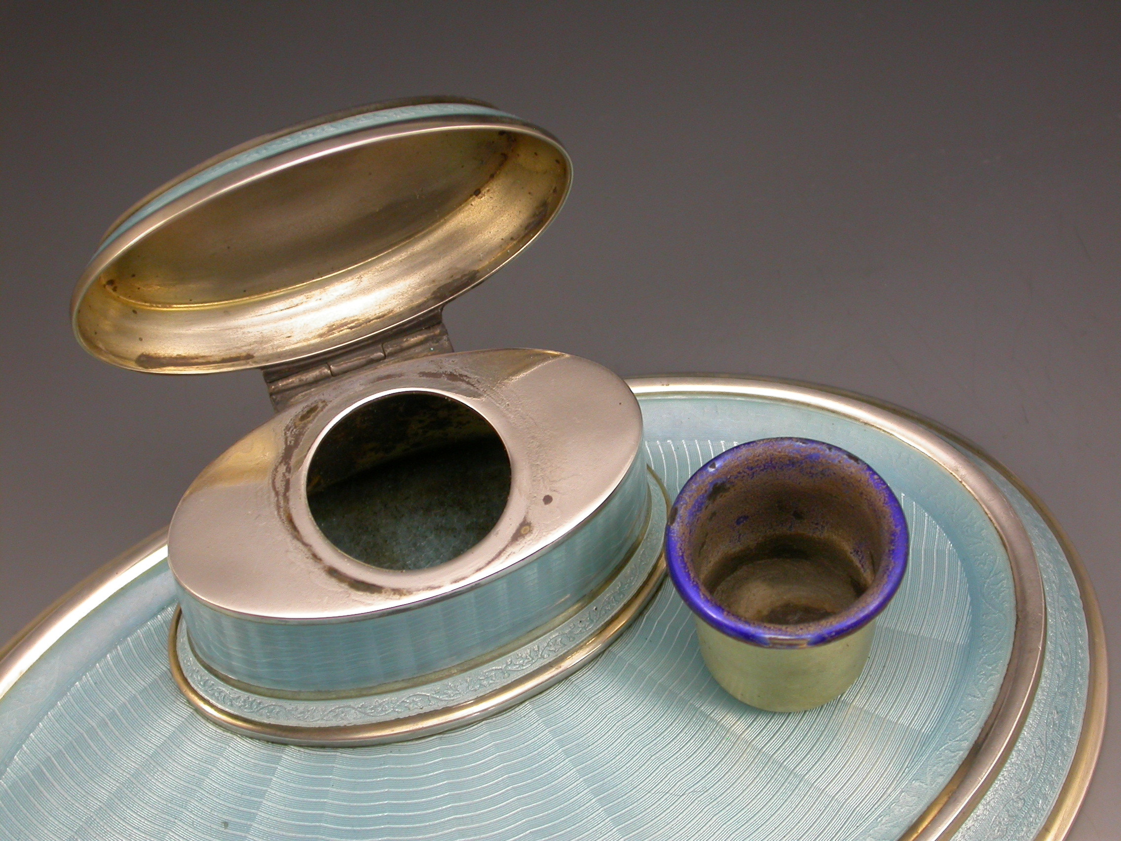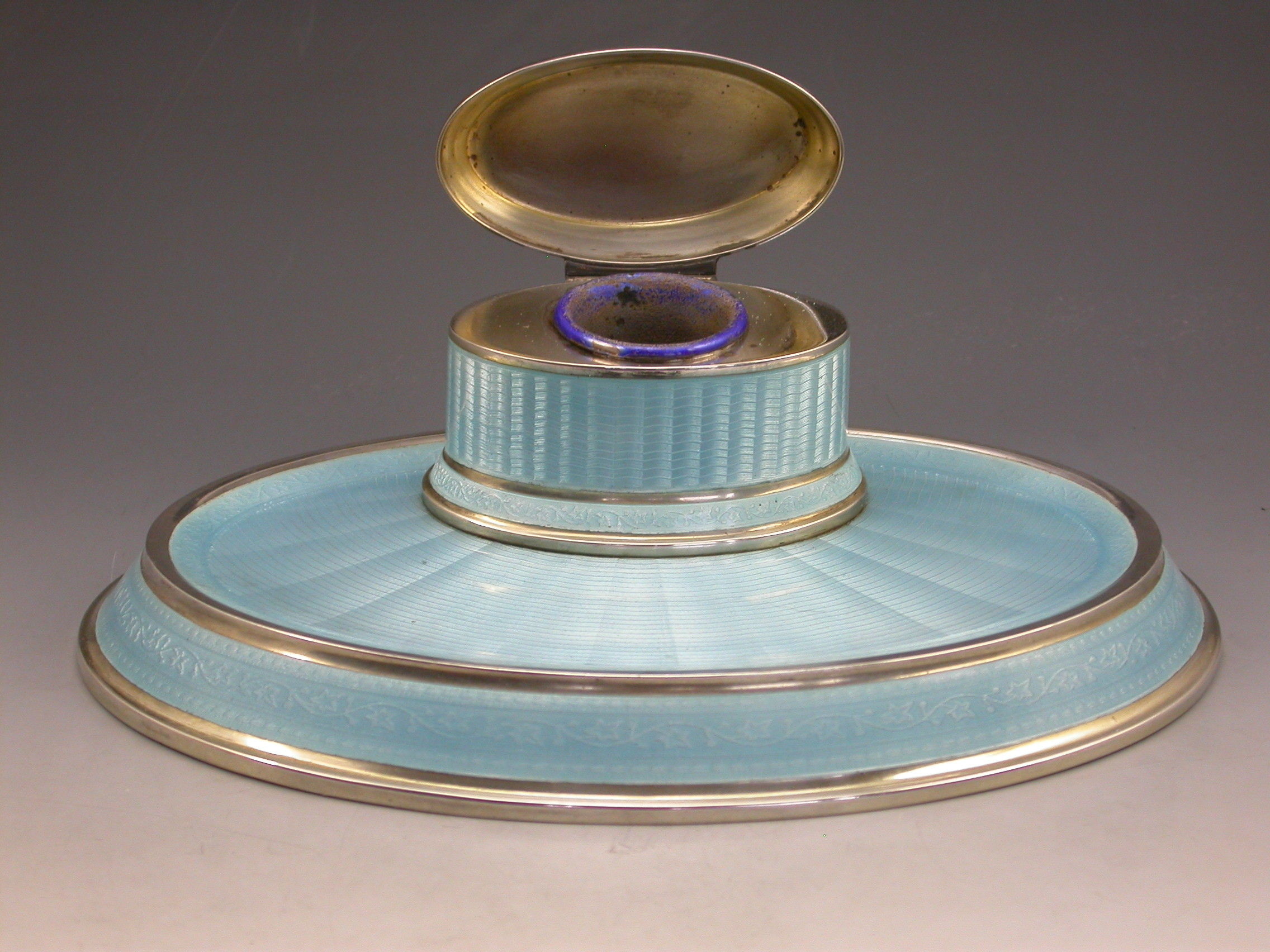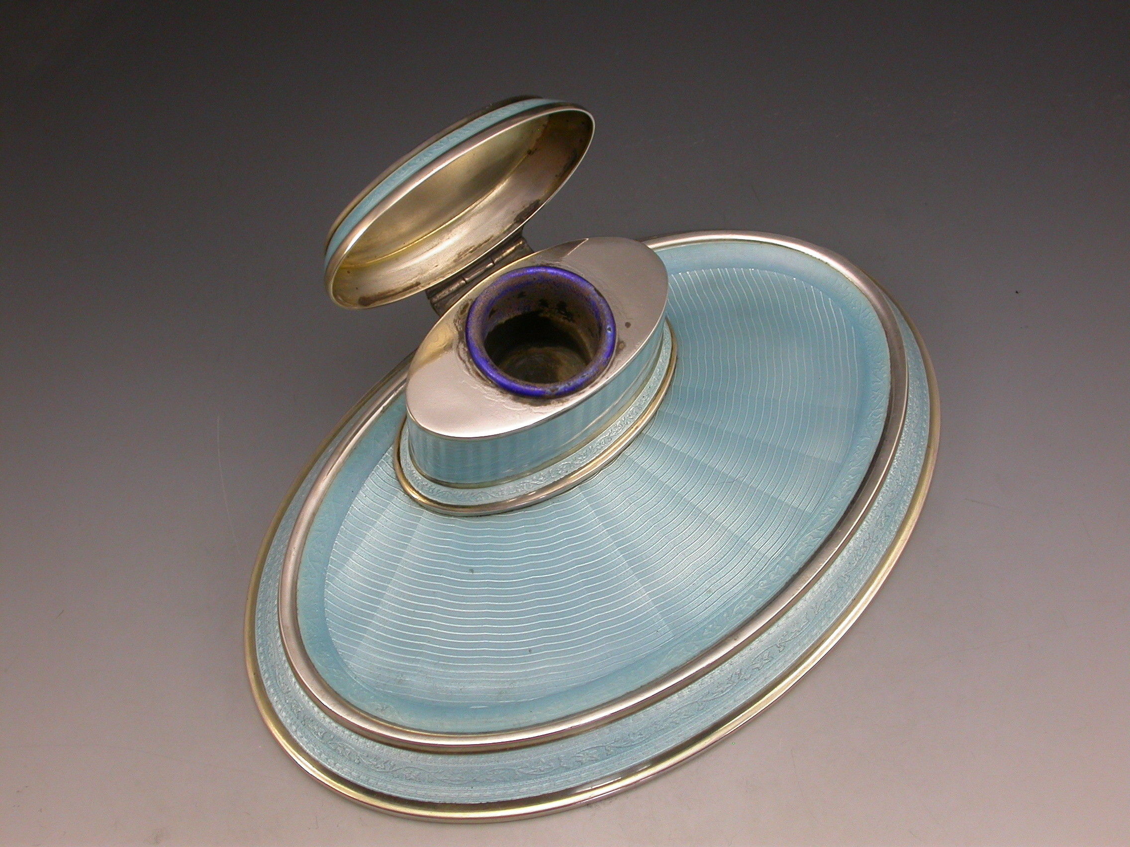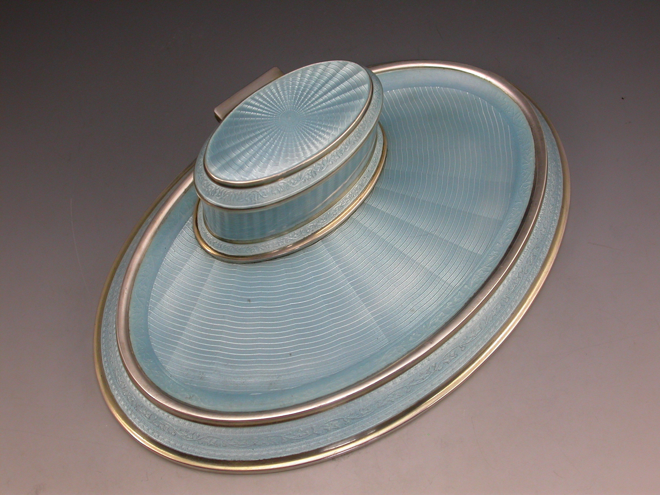 A good quality German .935 Standard silver and sky blue guilloche enamel Dressing Table Ink Stand of oval form with hinged cover opening to reveal a gilded and enamelled ink pot.