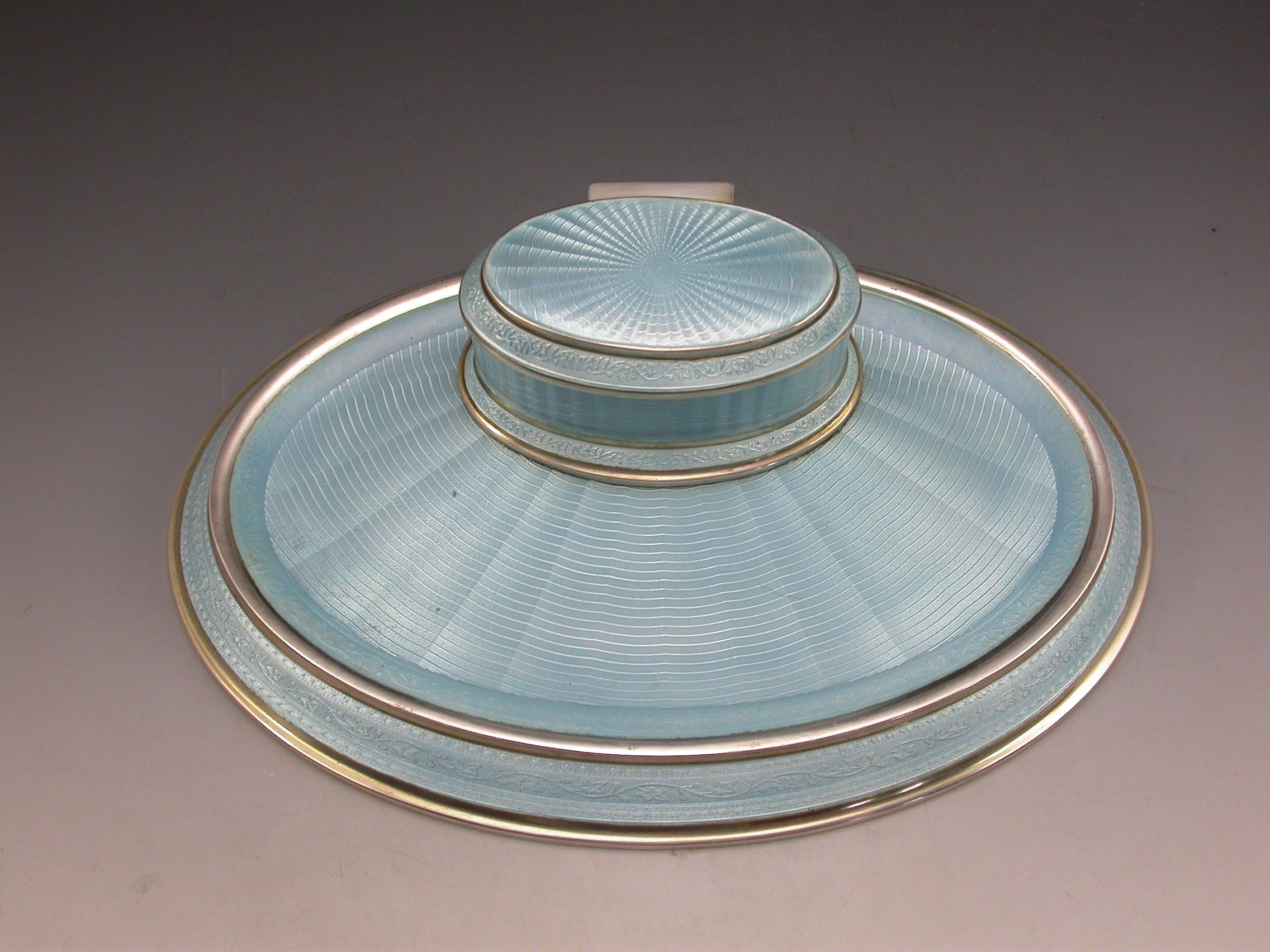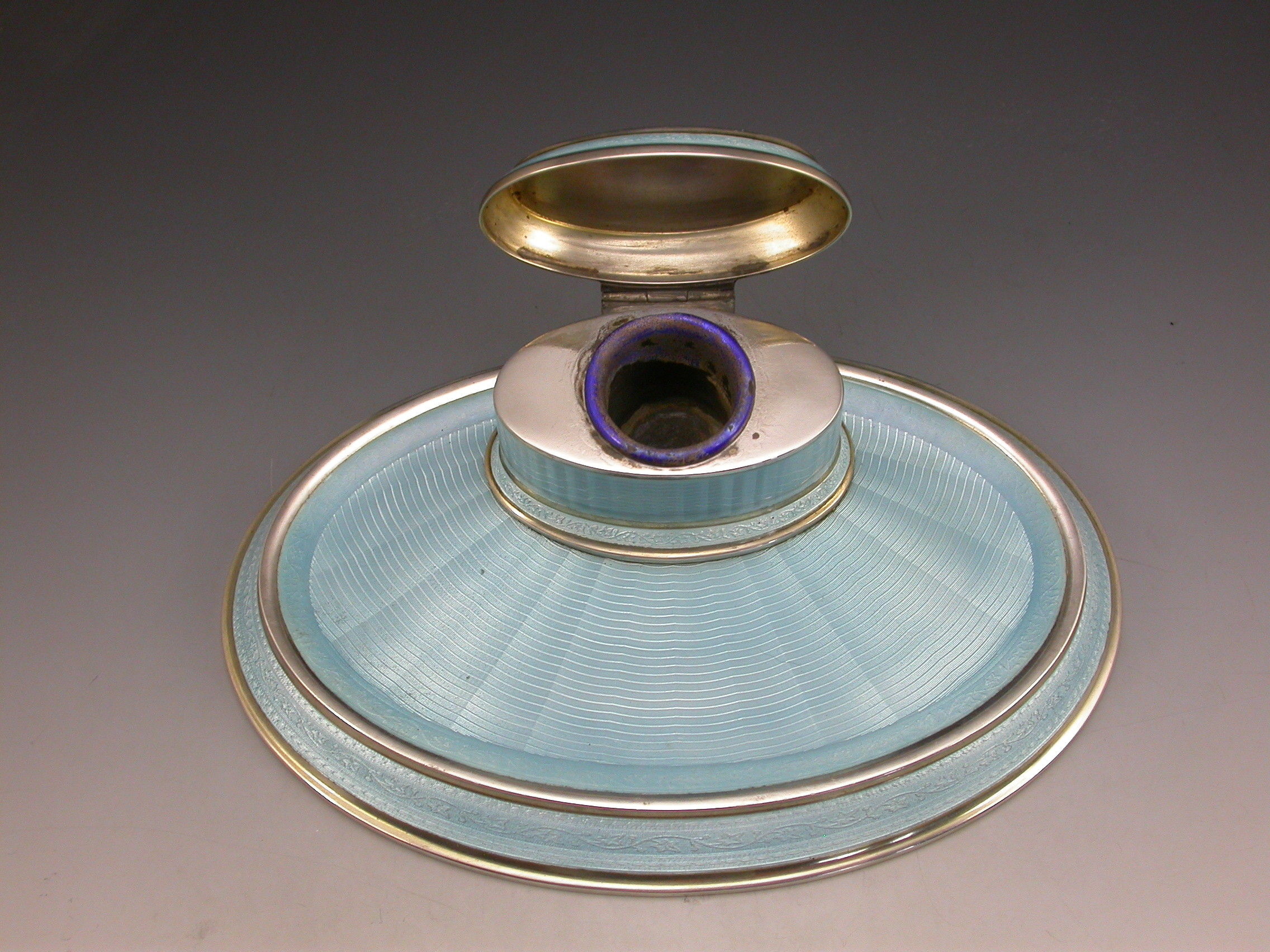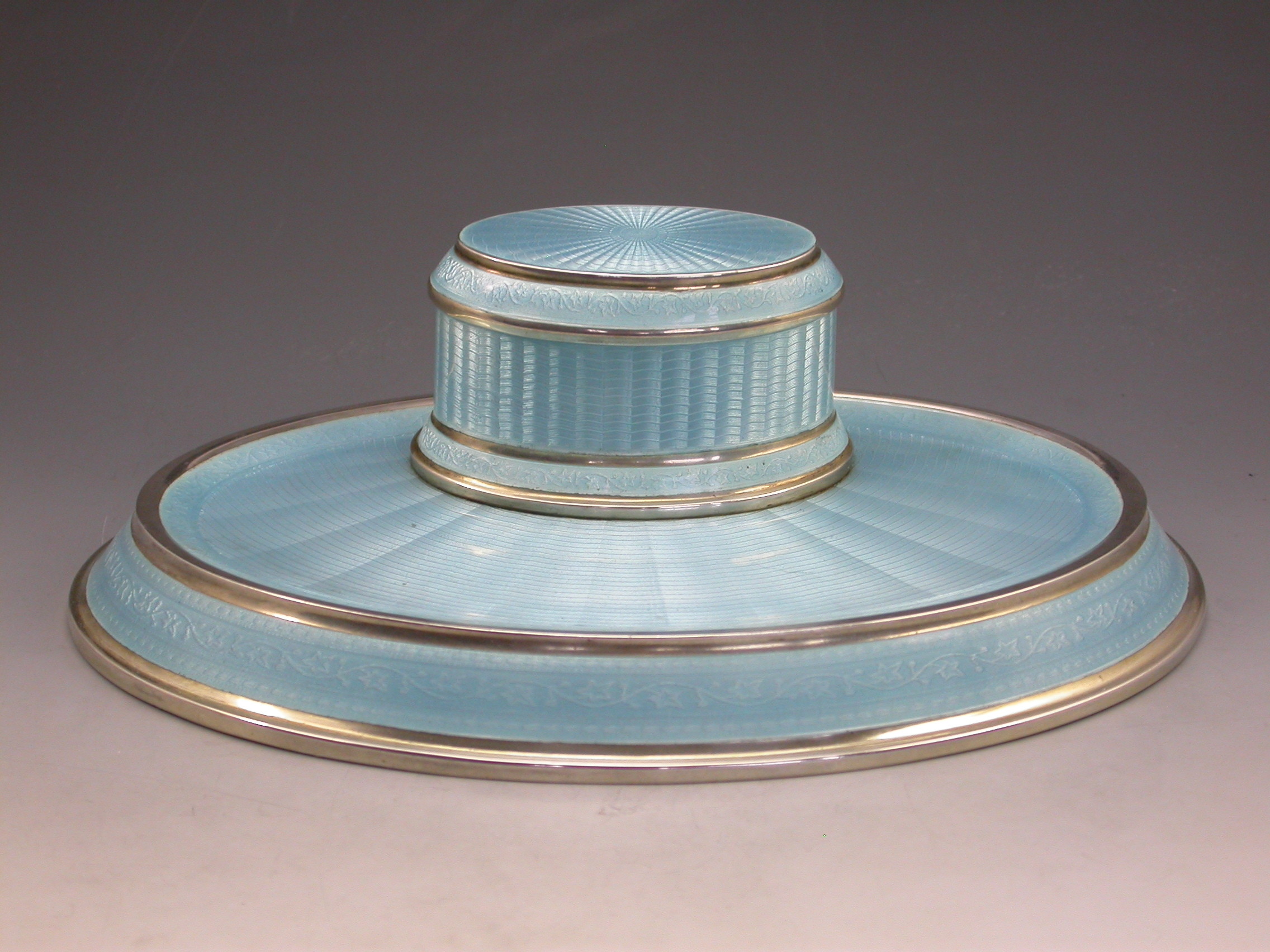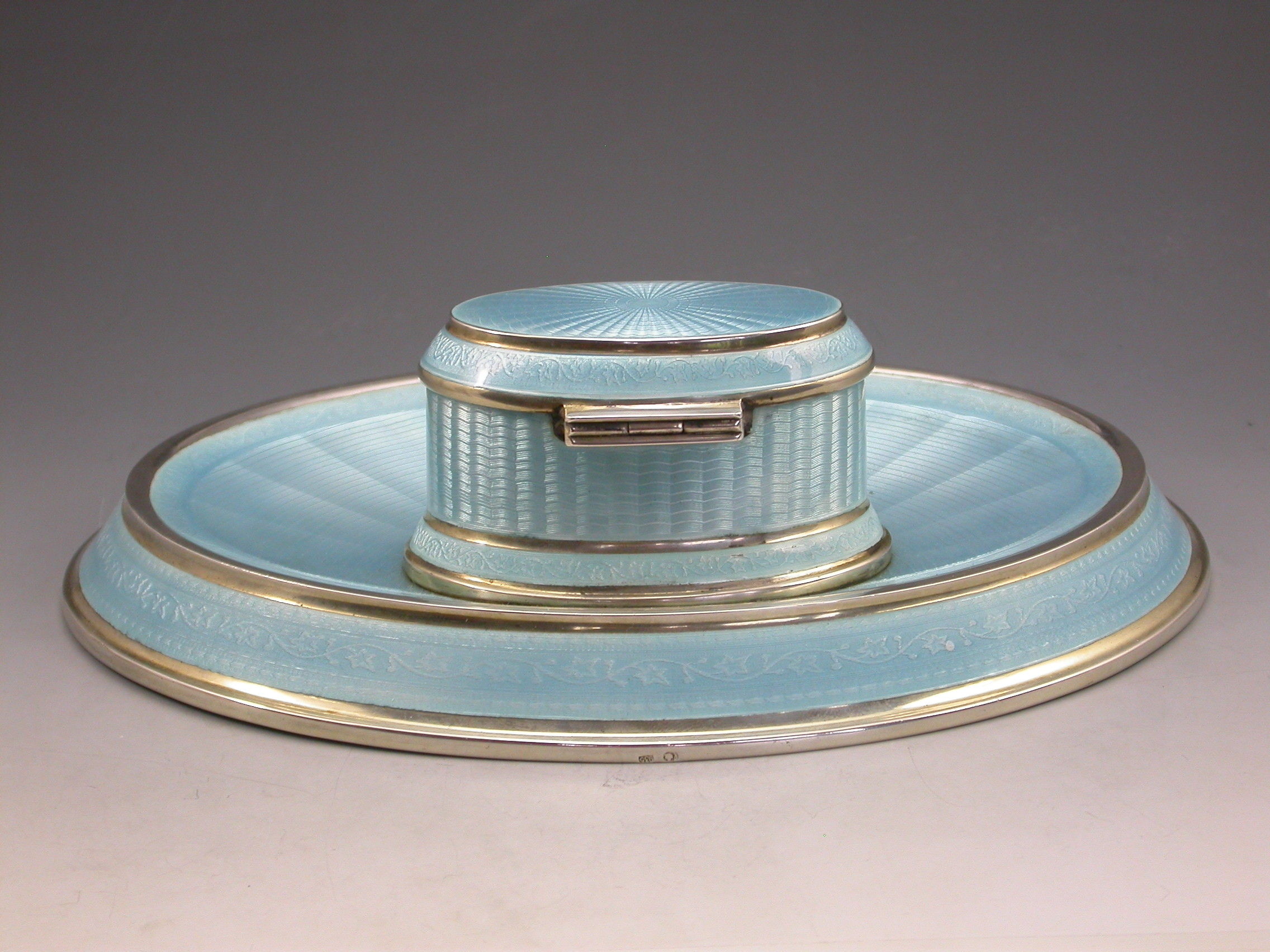 A good quality German .935 Standard silver and sky blue guilloche enamel Dressing Table Ink Stand of oval form with hinged cover opening to reveal a gilded and enamelled ink pot.