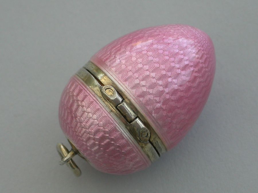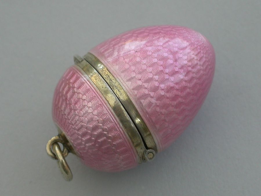 A good quality early 20th century silver and pink guilloche enamel Egg with hinged lid and silver gilt interior. Attached suspension ring.