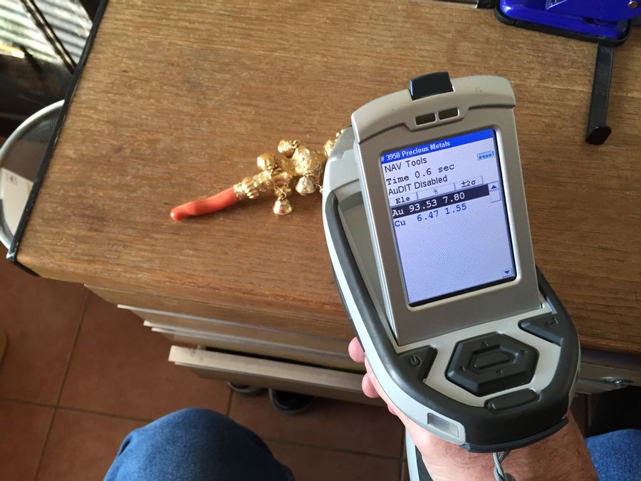 Tested with an X-Ray Fluorescence Gun (XRF) at over 90% Au (See photo)