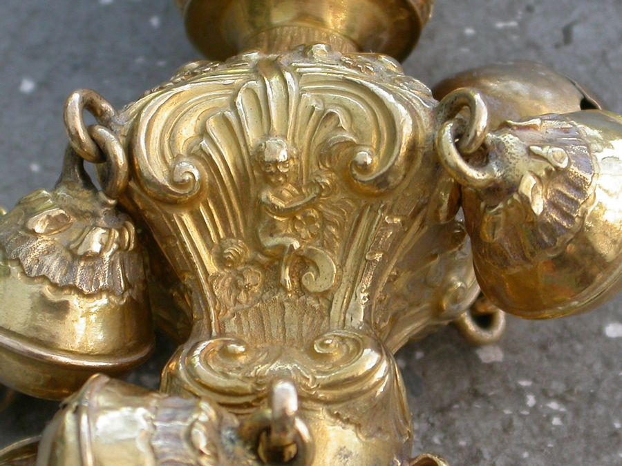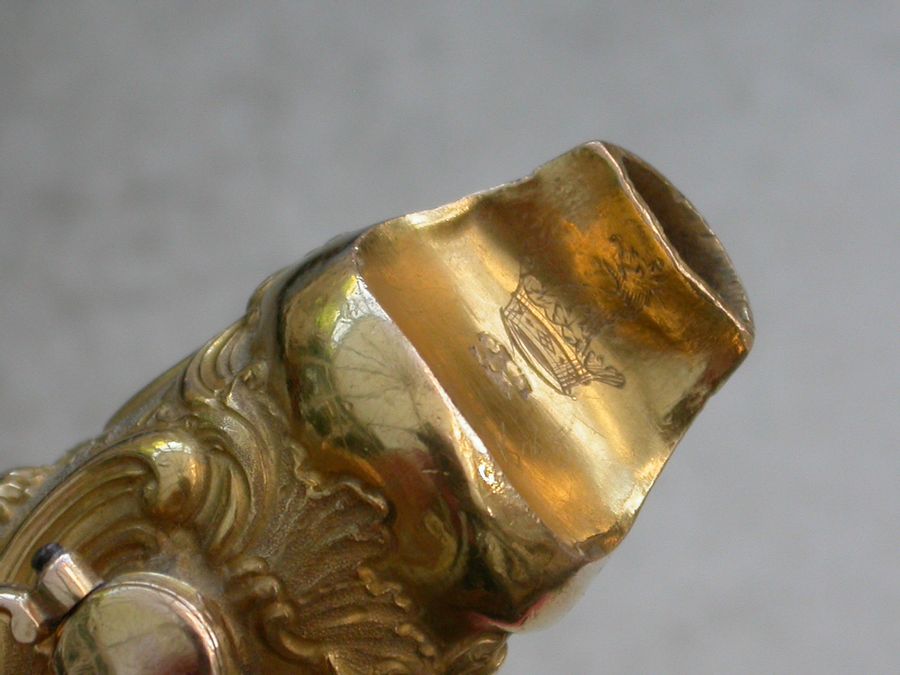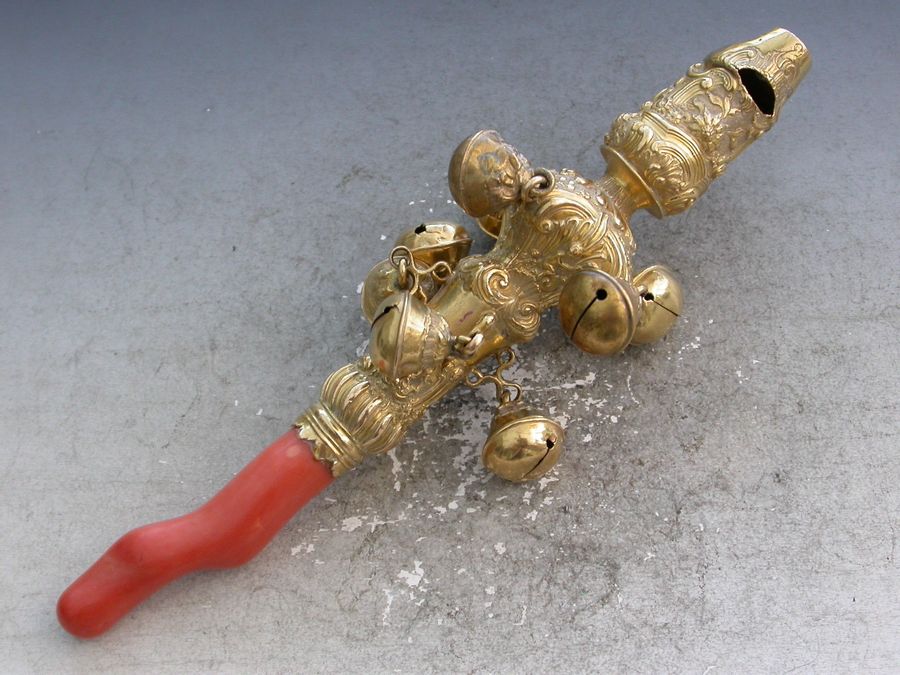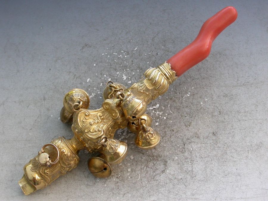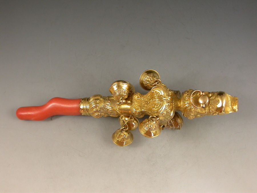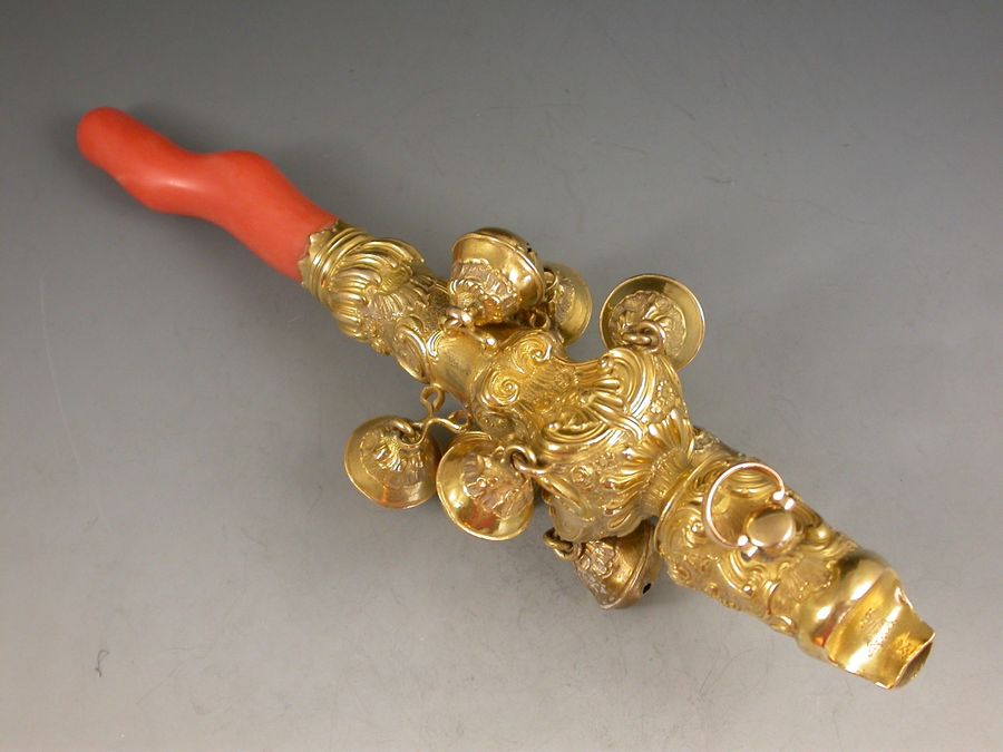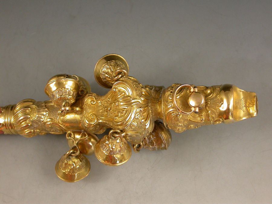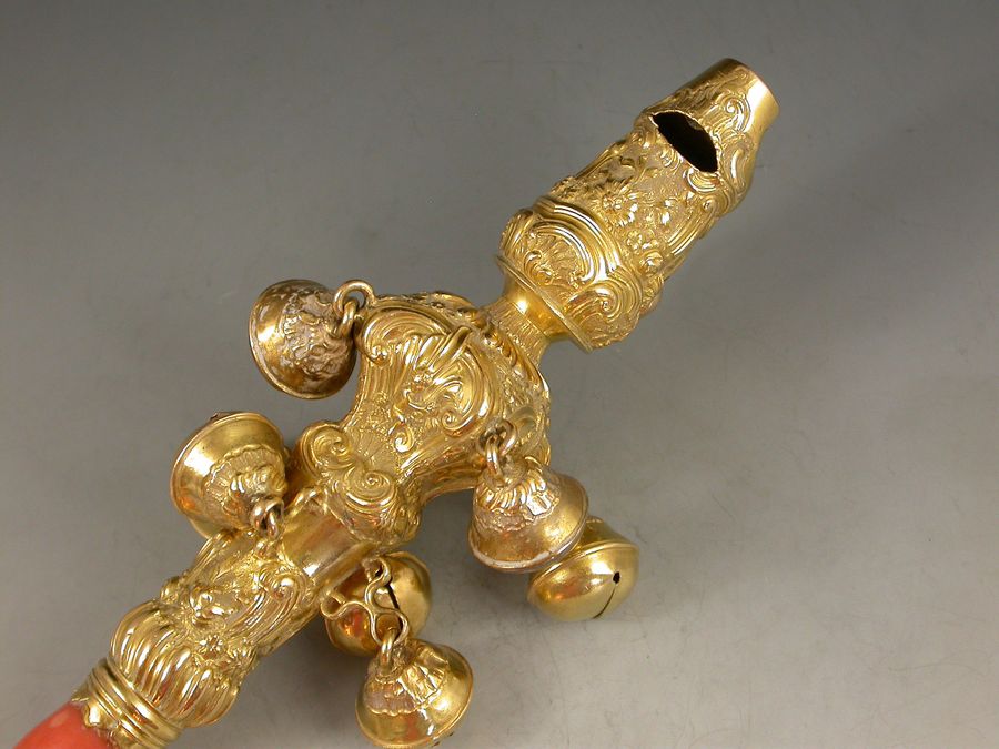 A superb George II 22 carat gold (tested) Baby's Rattle, all over chased and embossed Rococo shell and scroll decoration including flower heads and four naked putti, two tiers each supporting four bells and terminating in a thick coral teething stick, the whistle engraved with a crest - out of a ducal coronet a griffin's head - that of several families.