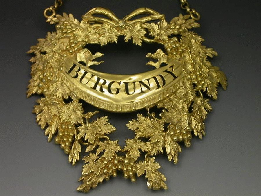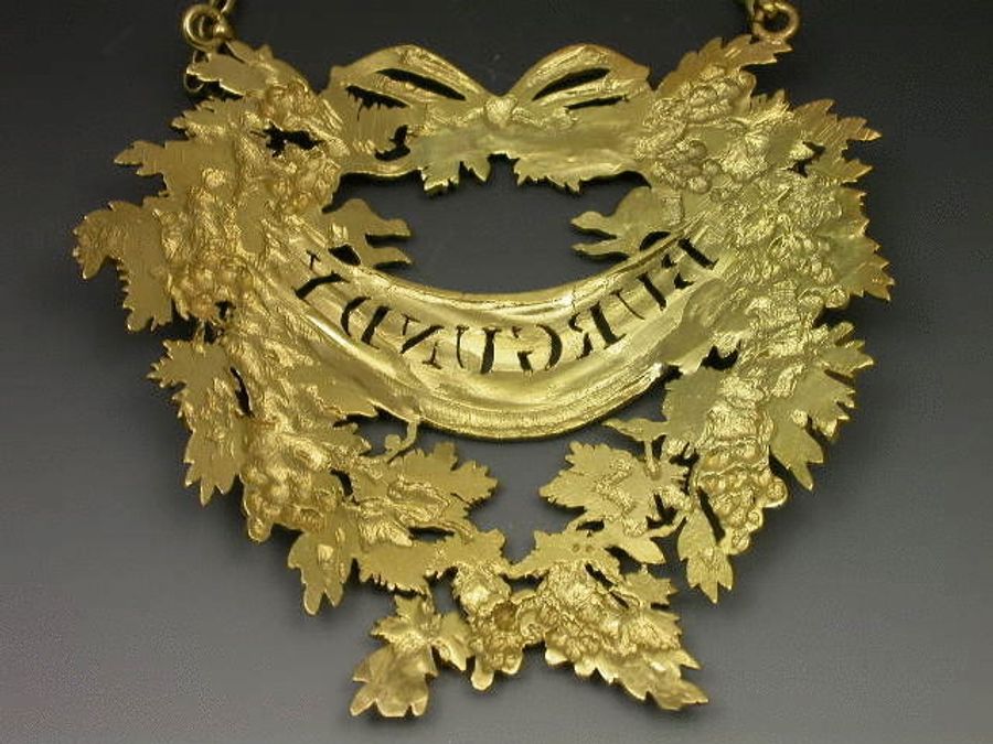 An extremely fine and large George III silver gilt Wine Label of opulent design in the form of a wreath of vine leaves with tied ribbon surmount, the pierced title BURGUNDY on a banner across the label.
