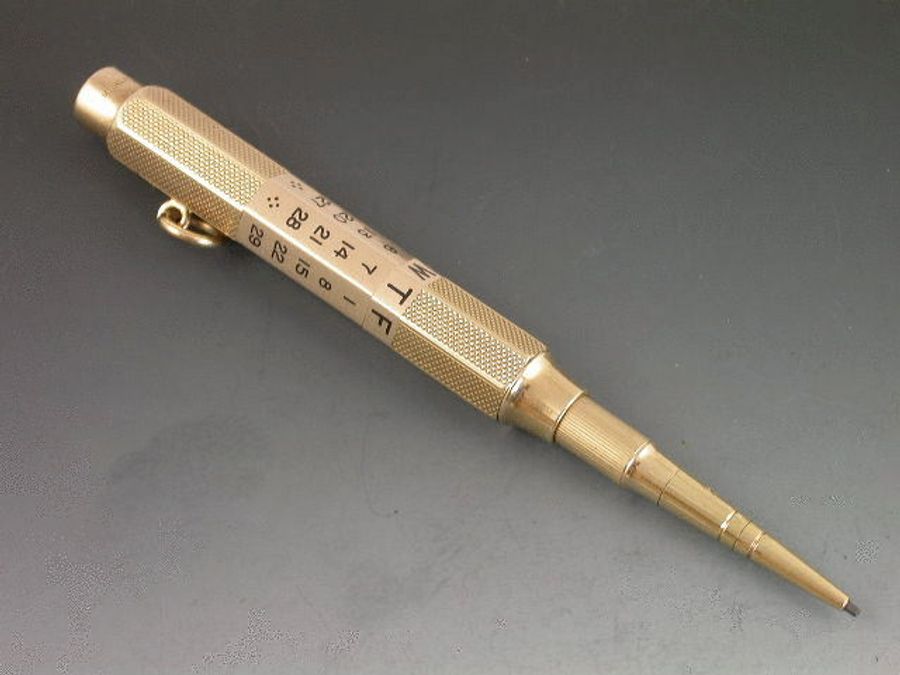 A fine early 20th century 9 carat gold Propelling Pencil, with push button “gravity drop“ opening mechanism, the octagonal engine turned body with integral swivelling calendar with enamelled numbers and letters.